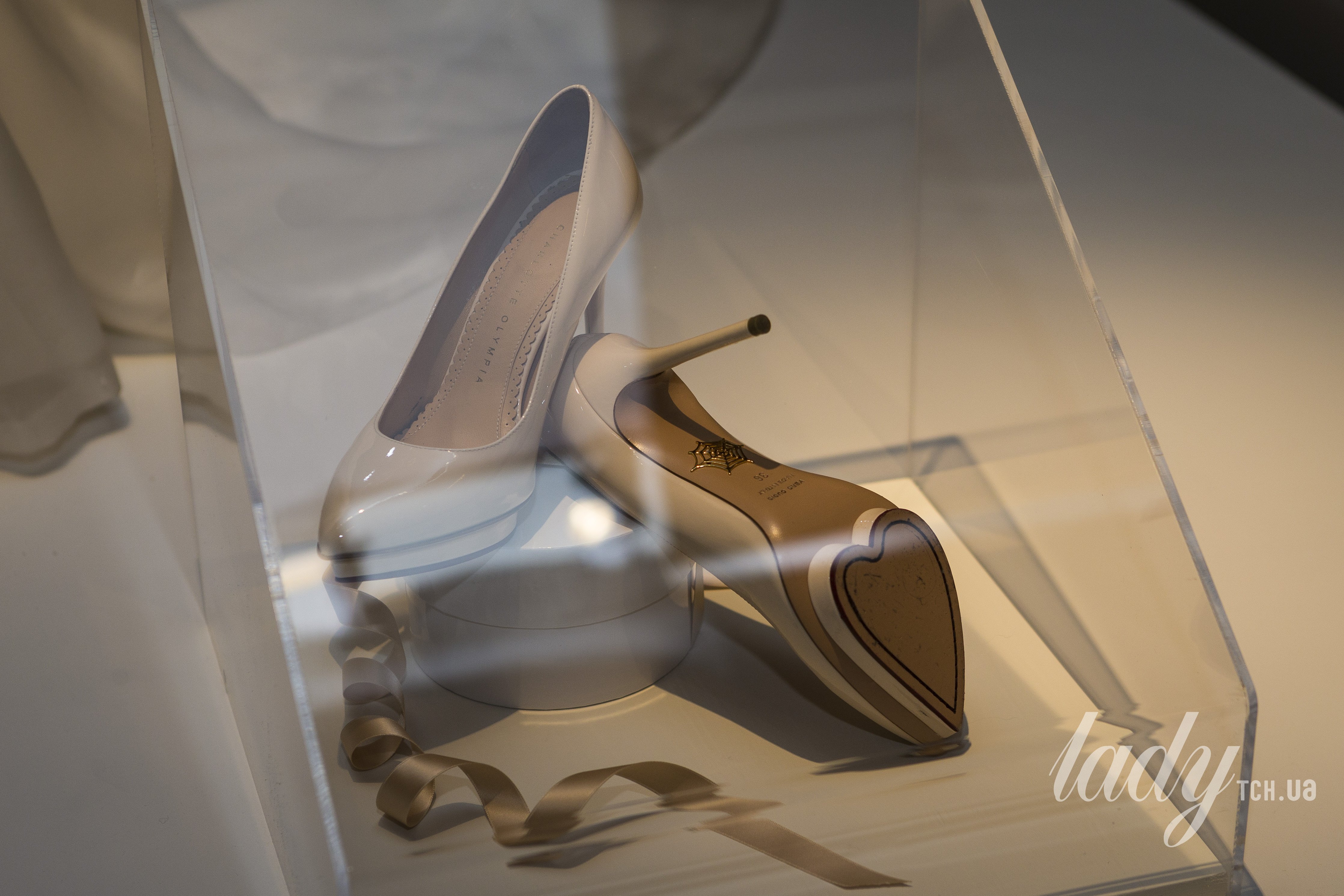 Пара розроблена брендом Charlotte Olympia і була лаконічною і лаковою. Оригінальною була підошва туфель, адже мала платформу у вигляді серця.