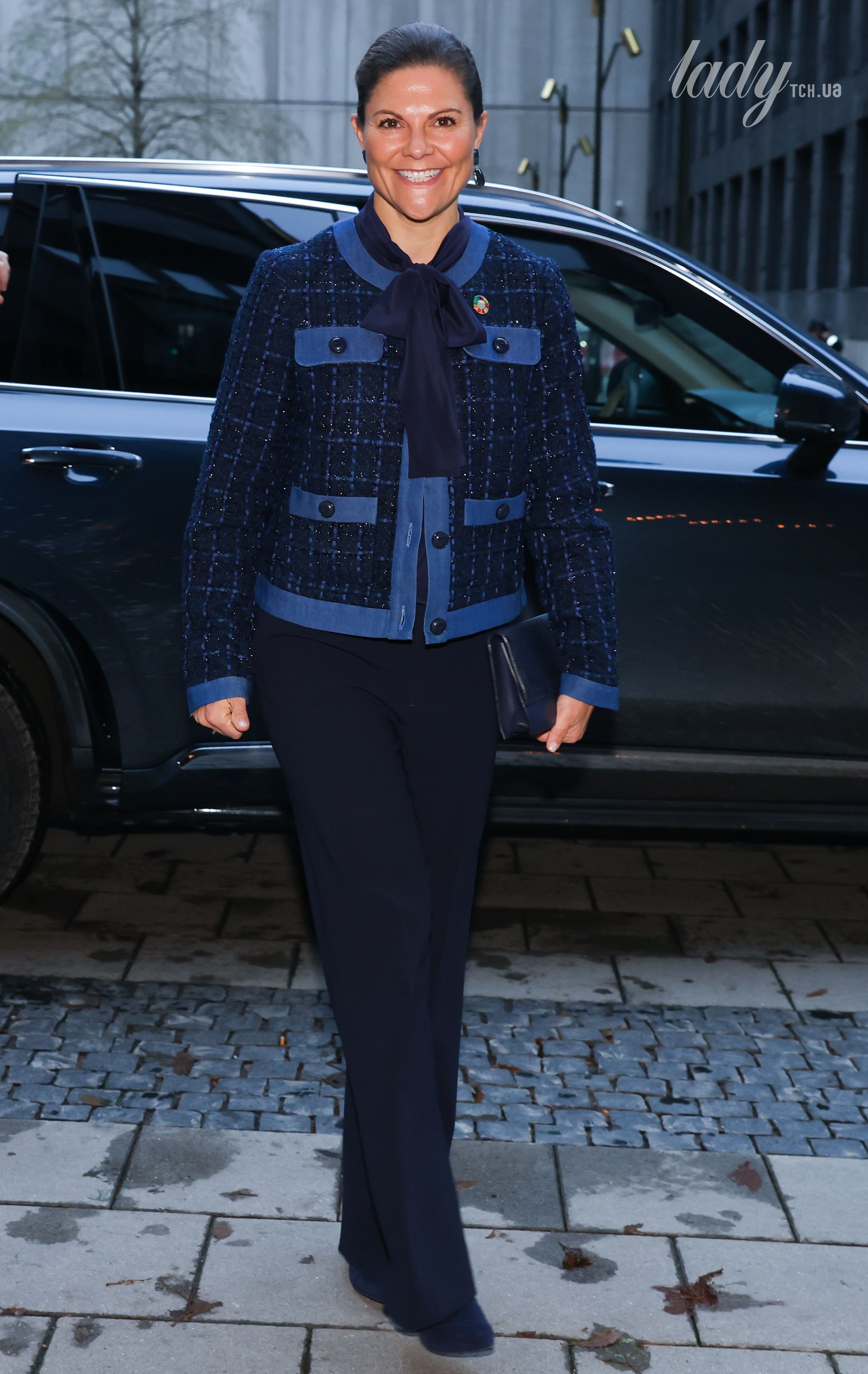 Спадкоємиця шведського престолу — кронпринцеса Вікторія — також серед тих королівських осіб, які носять банти як елемент образу. В одному з таких луків Вікторія приїжджала на конференцію Forma Collaboration з питань морів і води в Downtown Camper у листопаді 2024 року в Стокгольмі. Тоді вона одягла синій твідовий короткий жакет, під яким виднілася синя блузка з бантом на шиї, та підібрала штани до тону, а ще доповнила образ синіми туфлями на підборах і синім клатчем.