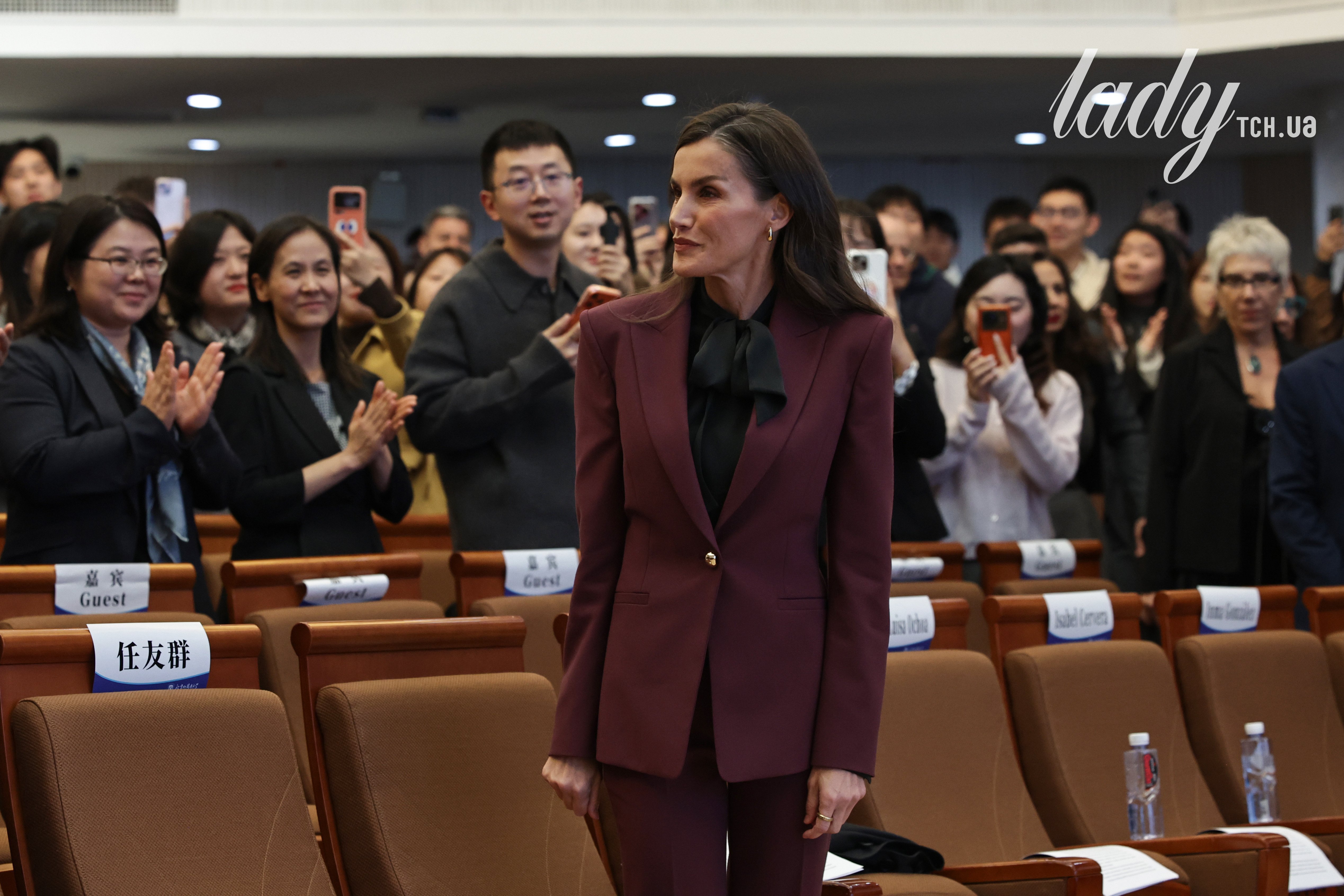 Також ми бачили кілька образів королеви з бантами під час листопадової подорожі до Китаю. На зустрічі зі студентами Пекінського університету іноземних мов Летиція з’явилася у штанному костюмі винного кольору, під який одягла чорну блузку з бантом і взула чорні балетки з гострим носами від Magrit.