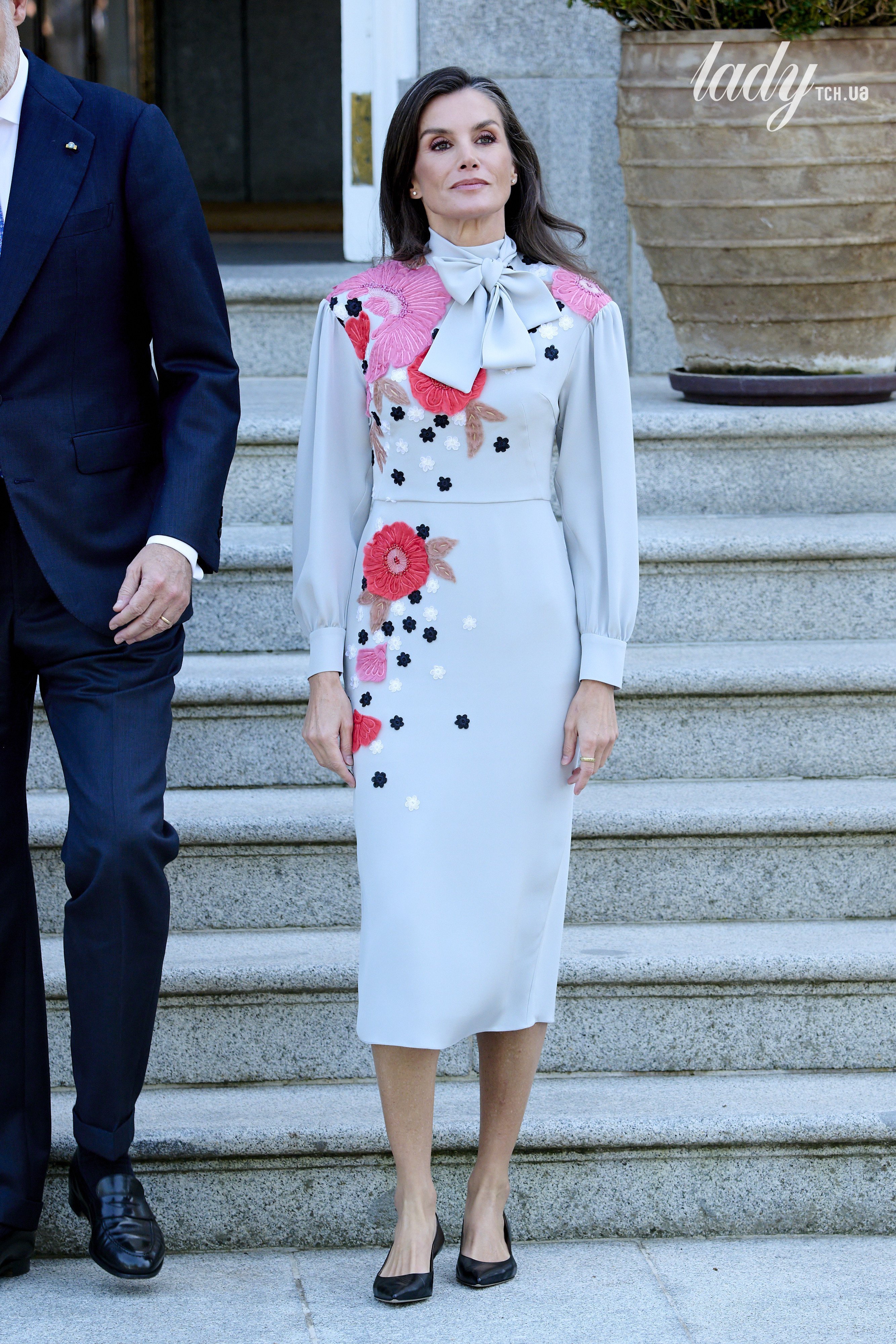 А коли Летиція та її чоловік король Філіп VI вітали в Мадриді султана Оману, королева з’явилася на цій церемонії в гарній небесно-блакитній сукні з квітковою аплікацією, вишивкою і бантом від Manuel Pertegaz. Тоді вона доповнила образ довгим чорним пальтом з поясом, туфлями-човниками на невисоких підборах і сумкою від Carolina Herrera.