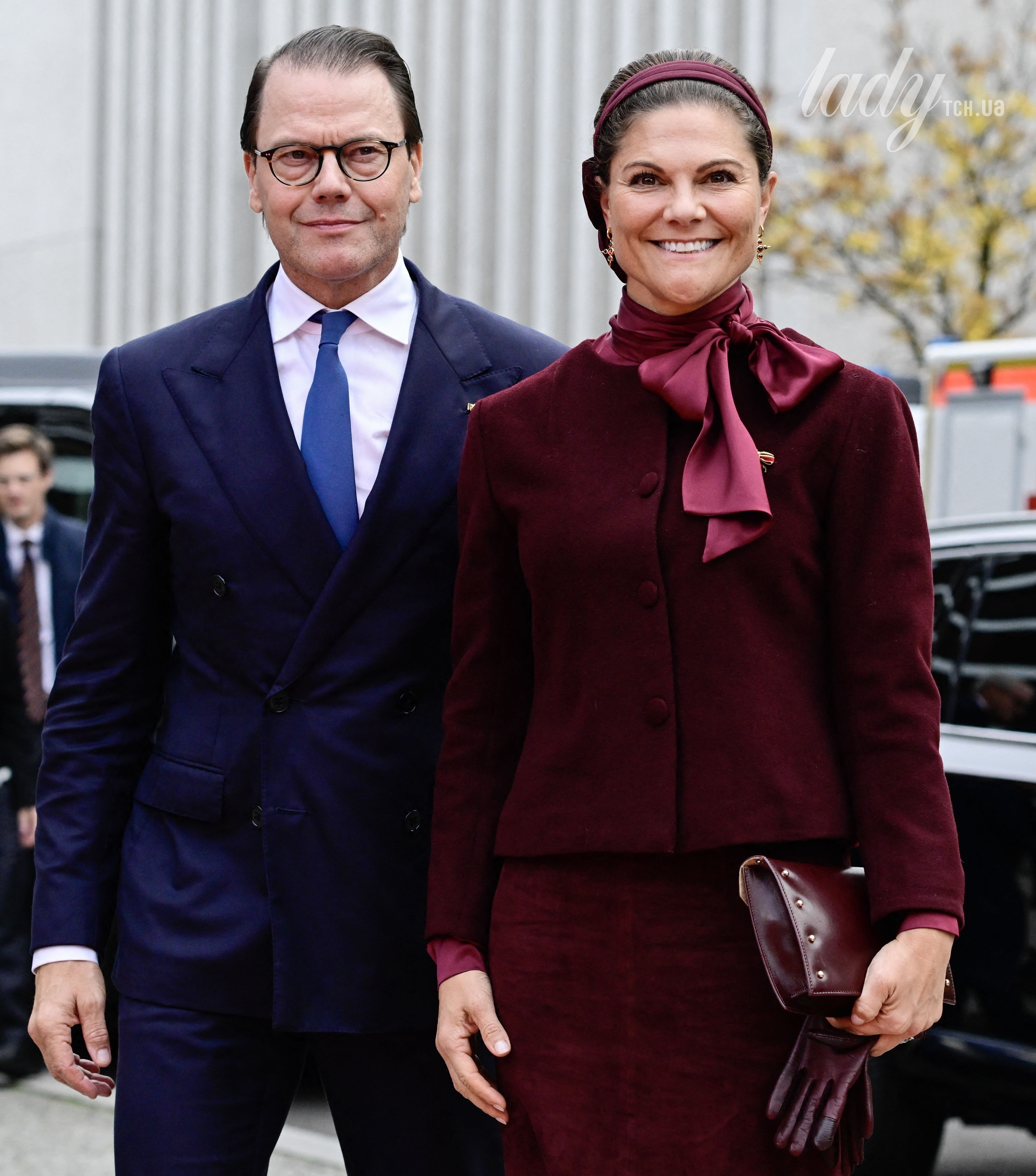 Ще у Вікторії був бант бордового відтінку на шиї, коли вона разом з чоловіком кронпринцем Даніелем відвідувала захід з нагоди 25-річчя комплексу посольств північних країн у Берліні. Кронпринцеса тоді доповнила гарний образ бордовим спідничним костюмом та обідком на голові.