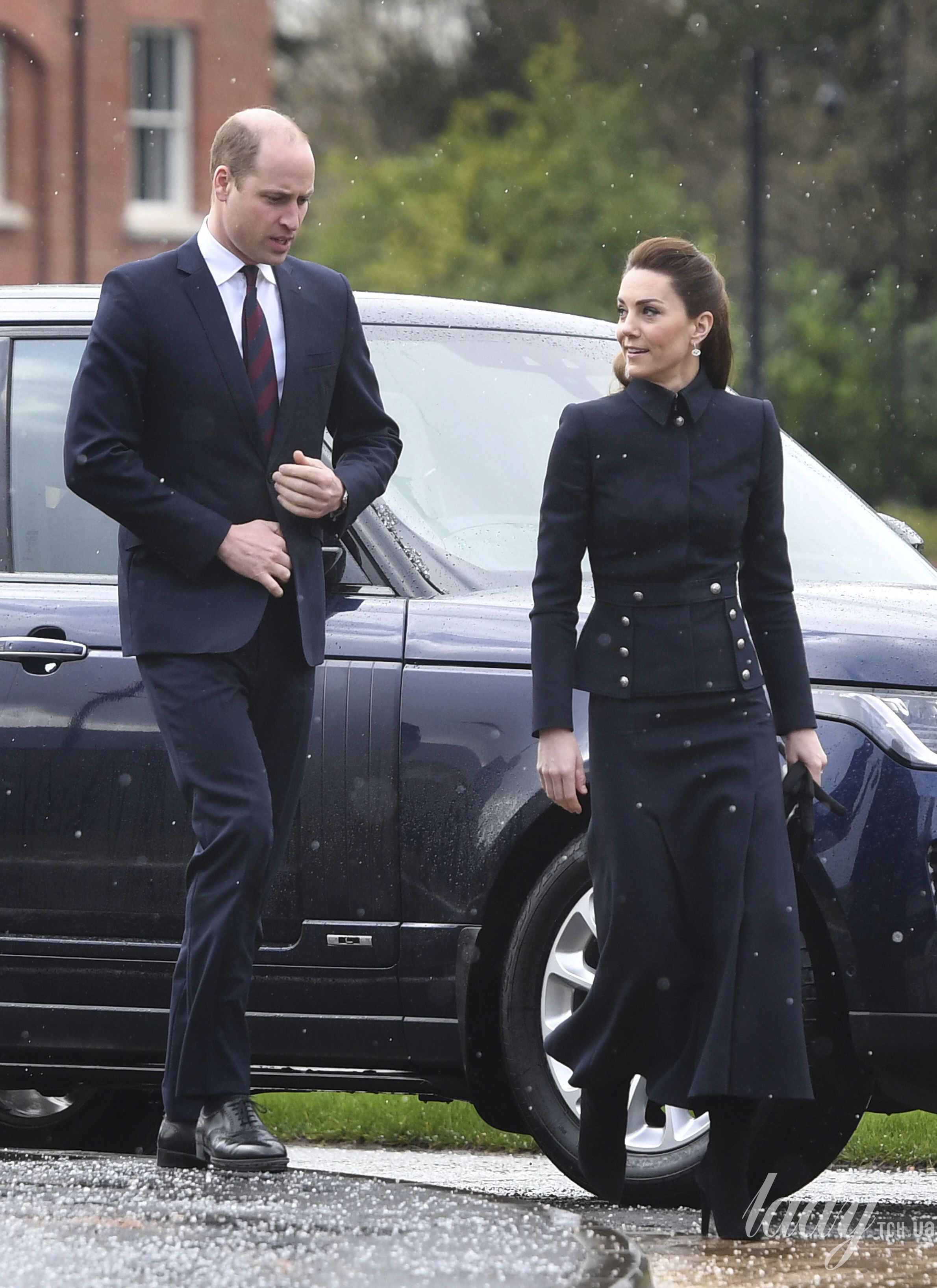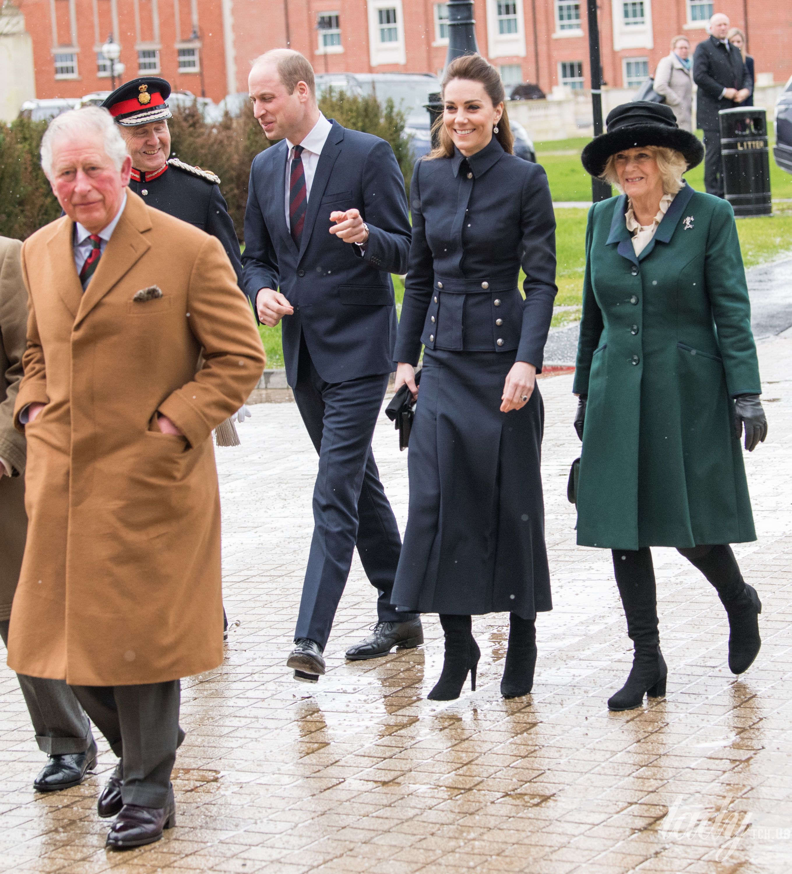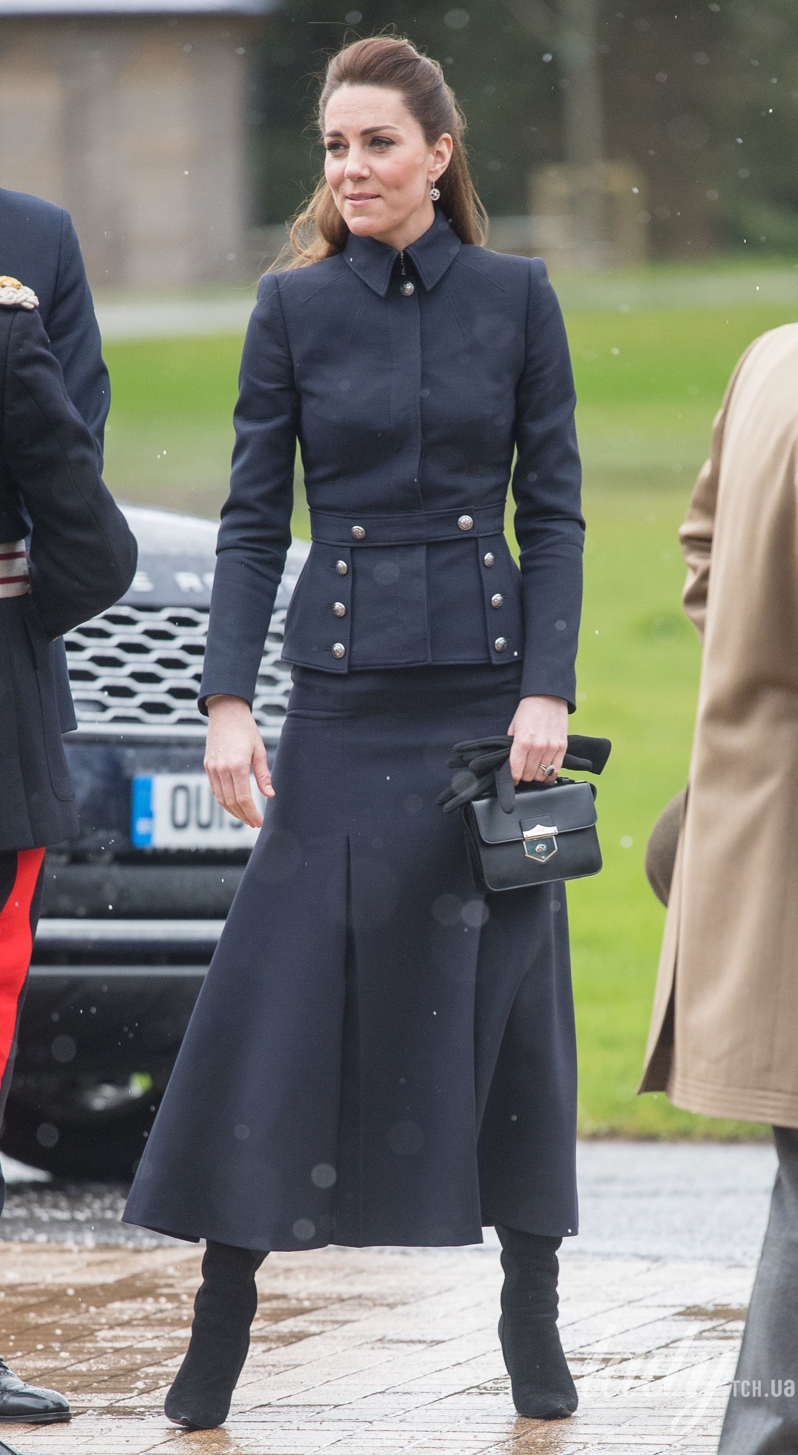 Образ 38-річної герцогині ми вже розглядали, нагадаємо, що Кейт приїхала на зустріч в жакеті в стилі мілітарі від Alexander McQueen і спідниці довжини міді в поєднанні з високими замшевими чобітьми.