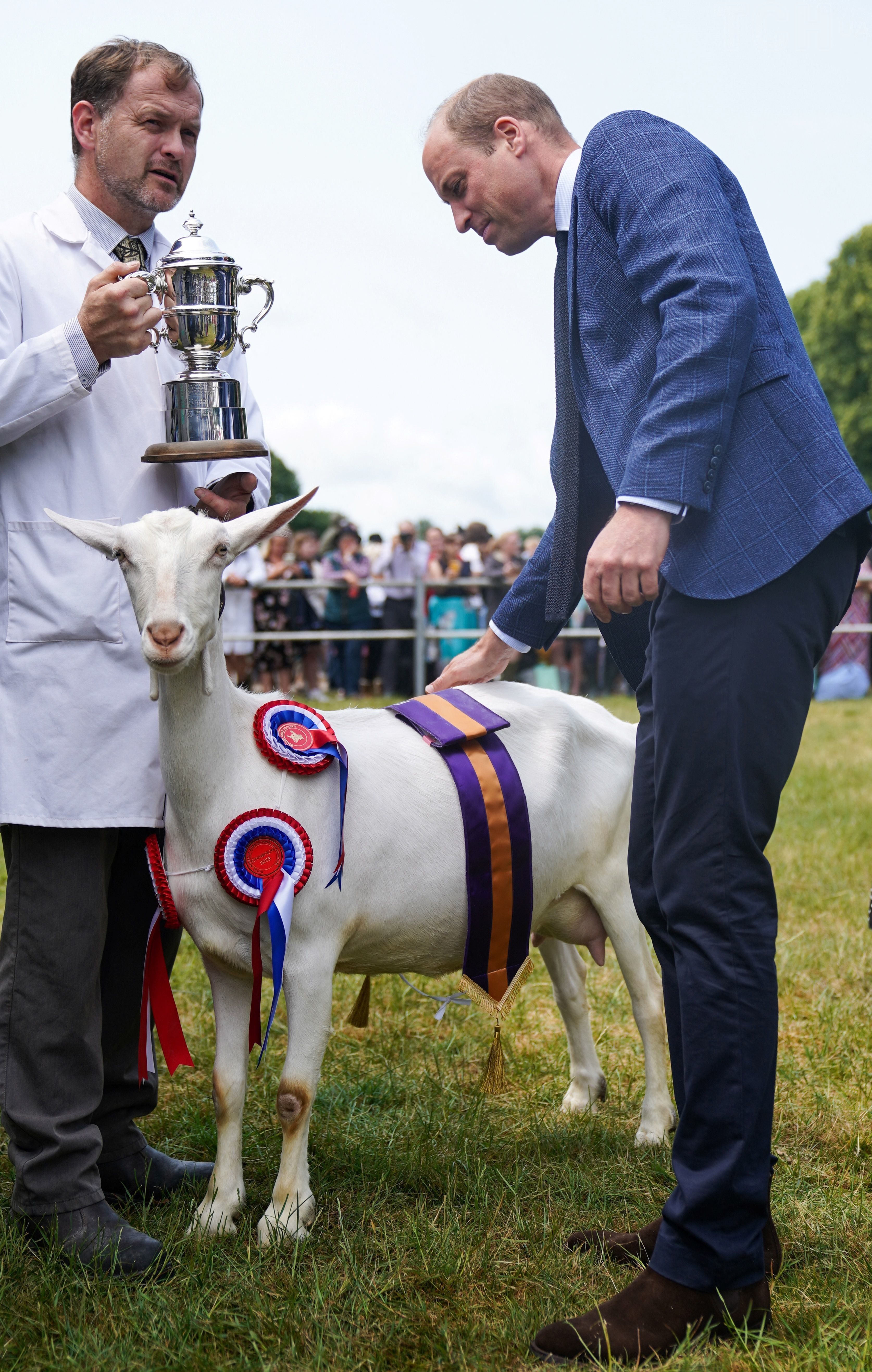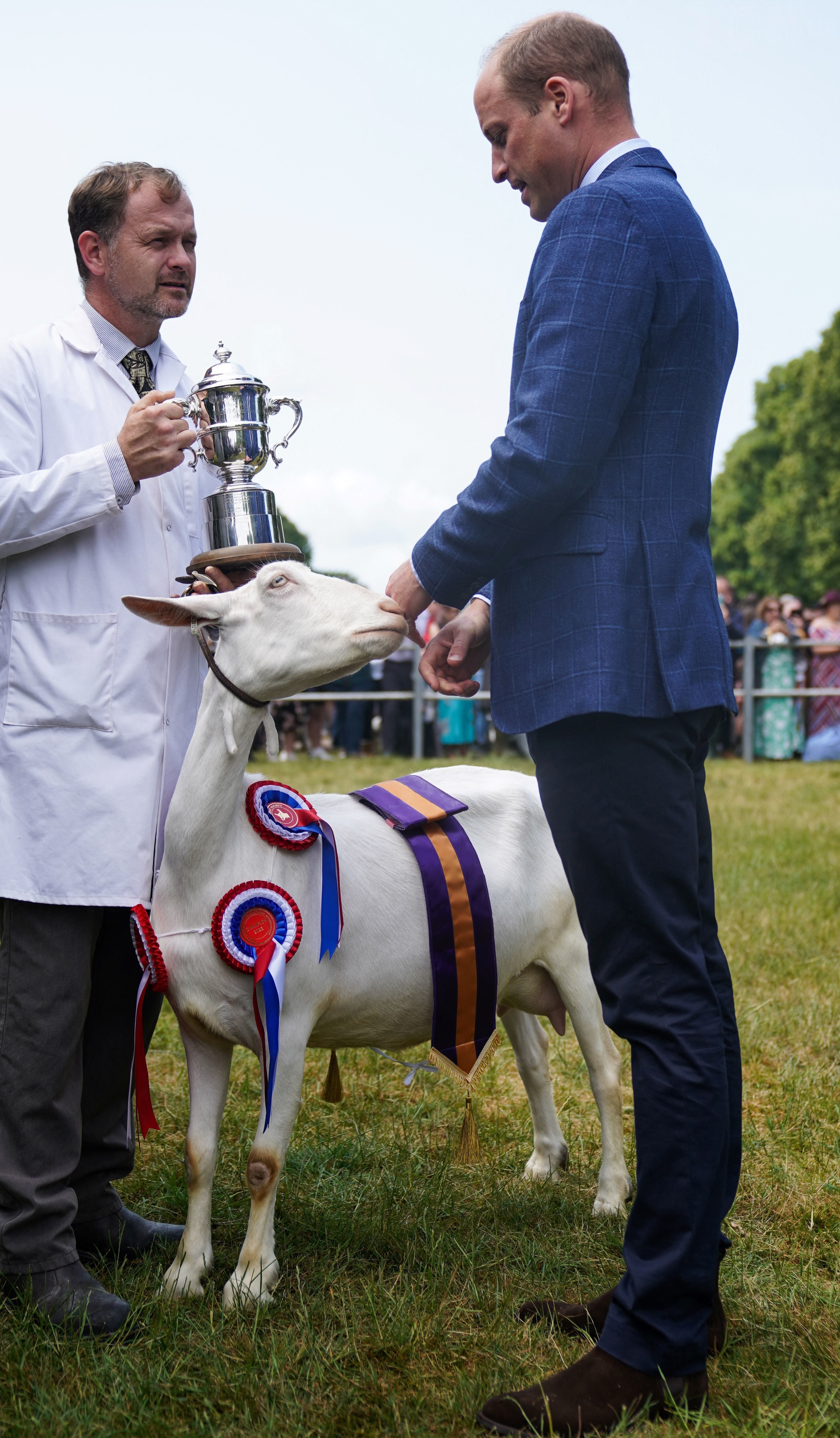 Вільям вручив трофей козі на ім'я Тейон Мейка, яка належить до британської зааненської породи, та її дресирувальнику Тей О'Нілу під час Королівської Норфолкської виставки, найбільшої дводенної сільськогосподарської виставки у Великій Британії.