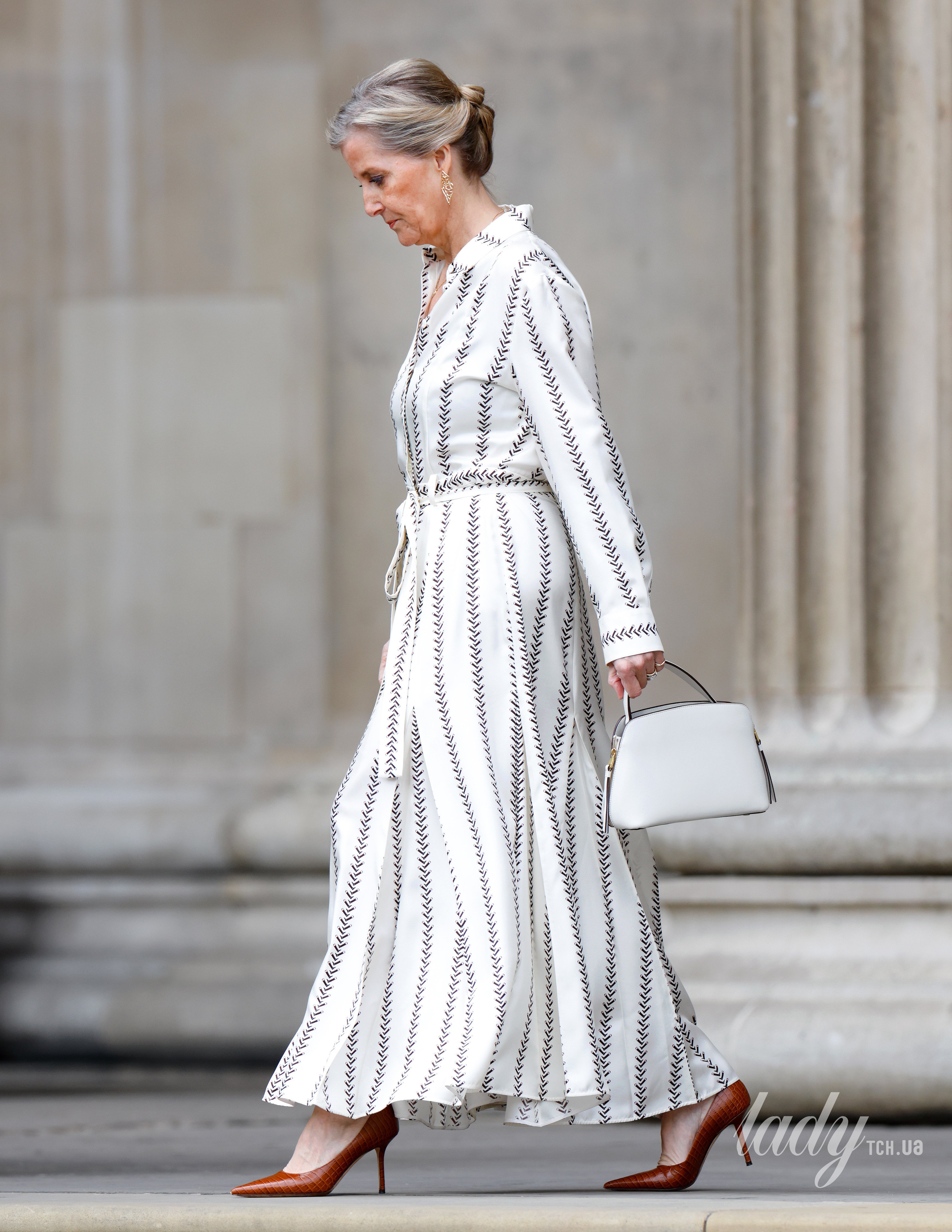 61-річна Софі мала чудовий вигляд у сукні-сорочці довжини міді зі смугастої шовкової саржі з поясом. За даними Royal British Fashion в Instagram, сукня була створена з використанням смужок, що нагадують чоботи для верхової їзди, що має відсилання до хобі королеви Єлизавети II, яка любила коней.
