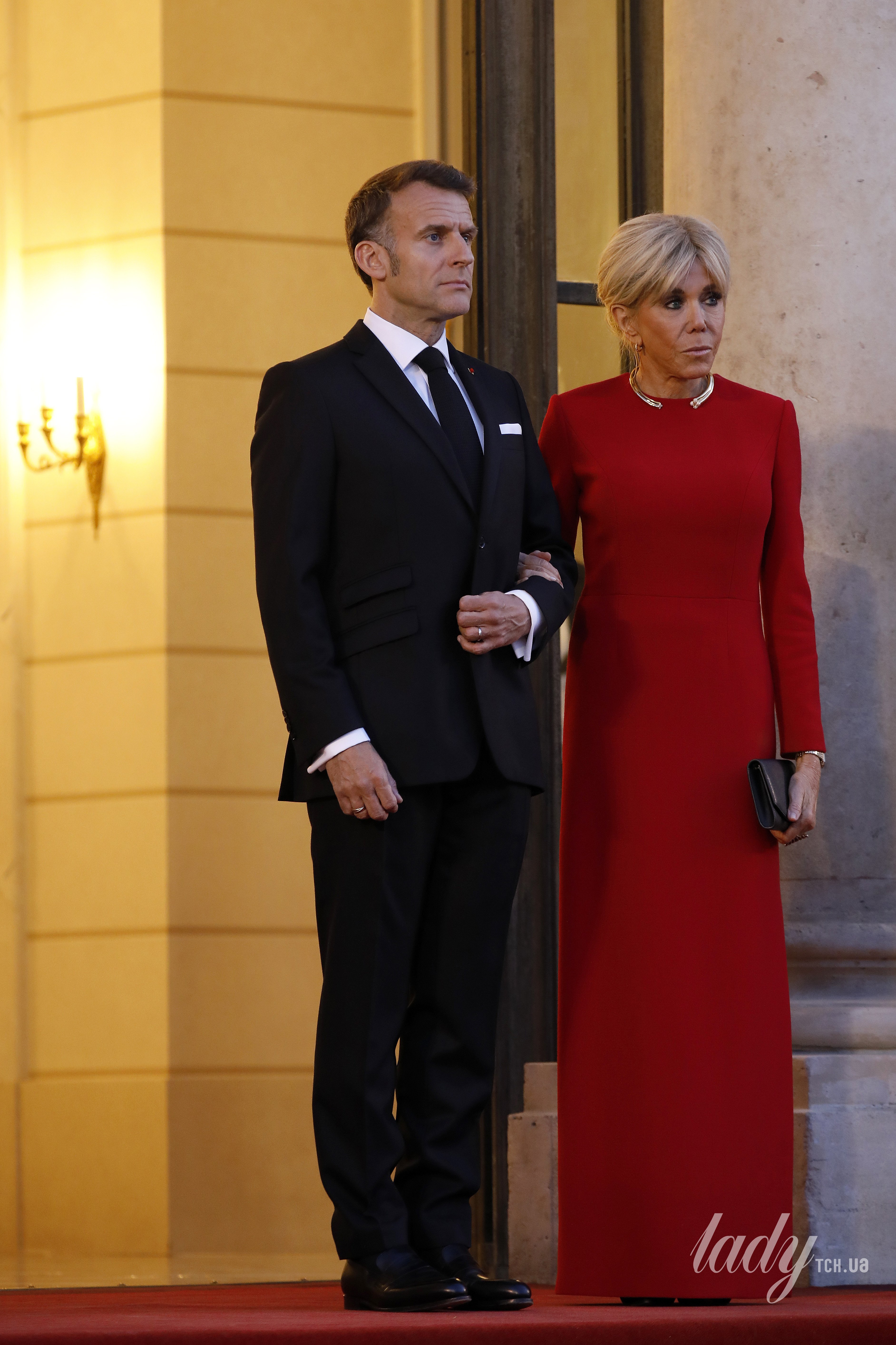 Перша леді Франції зустрічала гостей в елегантному аутфіті, у якому вона мала просто розкішний вигляд. На Бріжит була червона довга закрита сукня прямого силуету з довгими рукавами, яку вона скомбінувала з чорними гостроносими туфлями на шпильках і чорним клатчем Balmain.