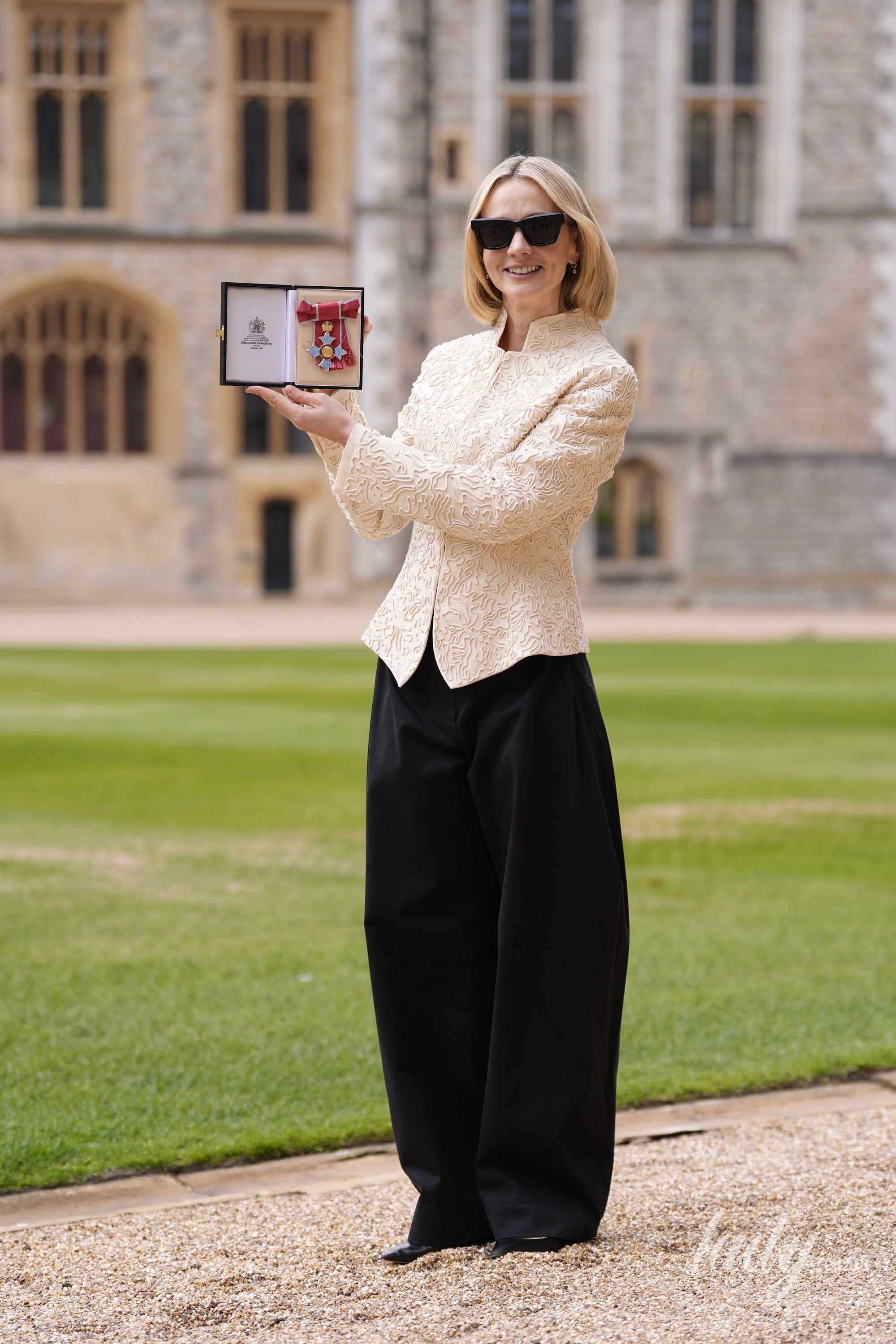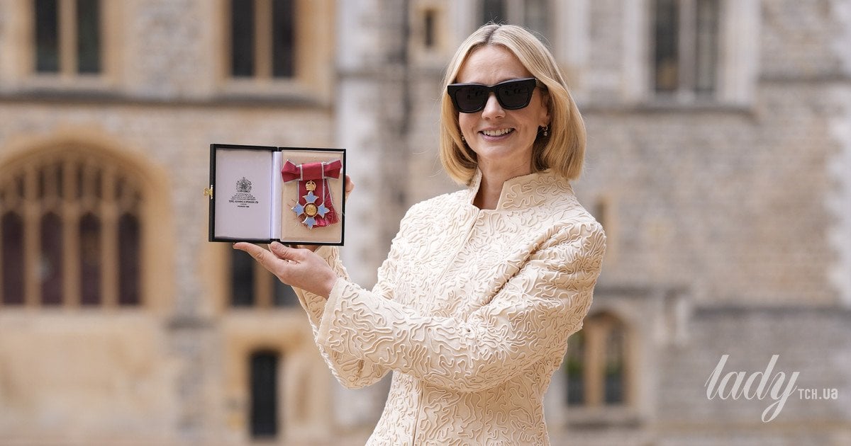 40-річна акторка приїхала на церемонію до Віндзорського замку в елегантному костюмі, обравши жакет в авангардному стилі кольору слонової кістки та широкі чорні штани, доповнивши аутфіт гостроносим взуттям, сонцезахисними окулярами та золотими сережками.