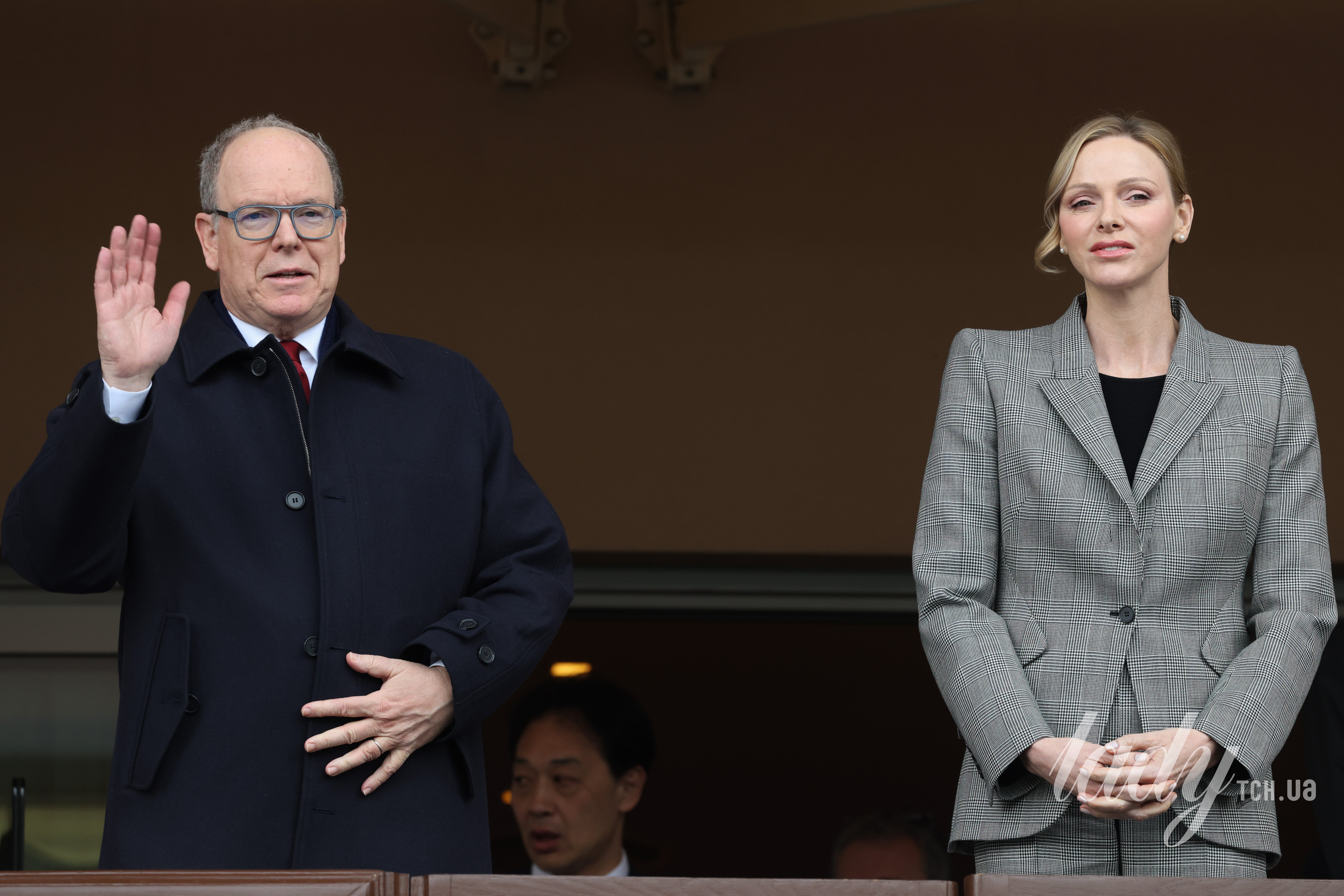 Княгиня Шарлін приїхала на спортивні змагання у картатому штанному костюмі сірого кольору, під жакет одягла чорний топ та зробила світле покриття на нігтях. У Шарлін був легкий макіяж на обличчі в теплих рожевих відтінках, волосся вона зібрала ззаду, залишивши спереду один локон і одягла перлинні сережки-цвяшки у вуха. Альбер був у темно-синьому пальті, костюмі, сорочці та смугастій краватці.