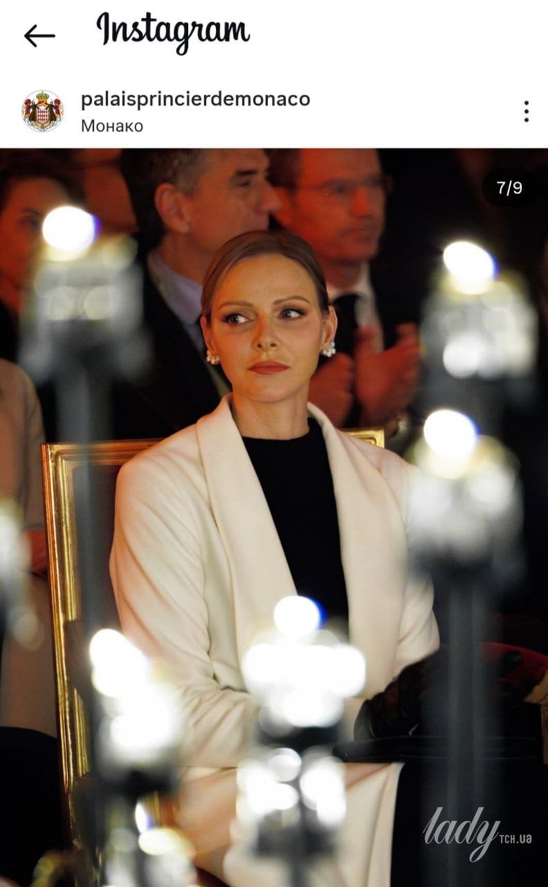 Княгиня Монако мала елегантний вигляд, приєднавшись до свого чоловіка князя Альбера II на концерті. На Шарлін було біле ефектне пальто довжиною до щиколотки, однобортного силуету, яке княгиня доповнила чорним вбранням під ним, гостроносим взуттям на підборах та перлинними сережками.