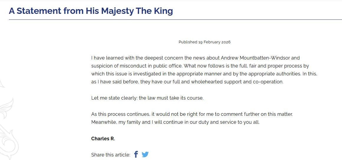 «Я з глибоким занепокоєнням дізнався новини про Ендрю Маунтбаттен-Віндзора та підозри в неправомірній поведінці на державній службі. Далі буде повний, справедливий і належний процес розслідування цього питання належним чином та відповідними органами.