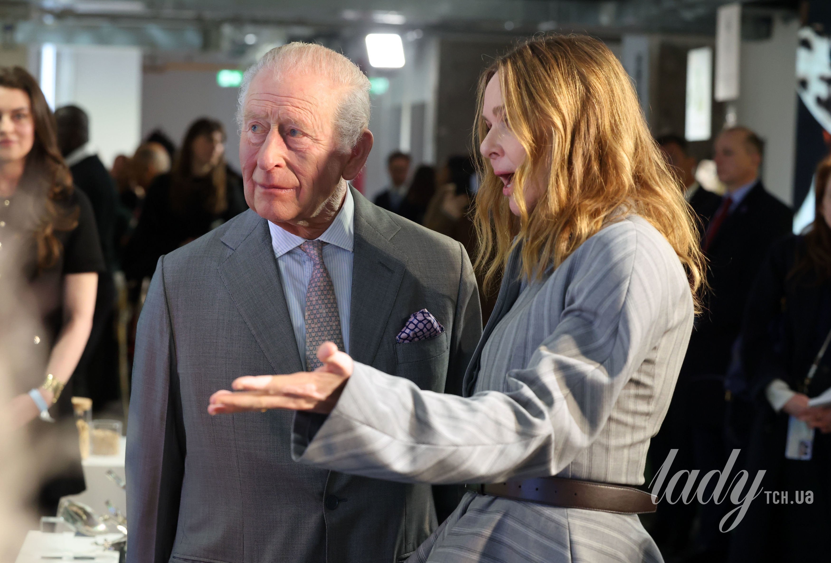 Раніше перед показом Чарльз вітав Стеллу Маккартні під час огляду її інсталяції, присвяченої стійким британським інноваціям. Дизайнерка була представлена як посол Ініціативи короля зі стійких ринків, і вона показала йому приклади екологічно чистих матеріалів, які вона використовує у своїх колекціях, зокрема рослинні замінники пір’я страуса, паєтки без пластику та замінник шкіри, виготовлений з грибів, пише журнал Hello!.
