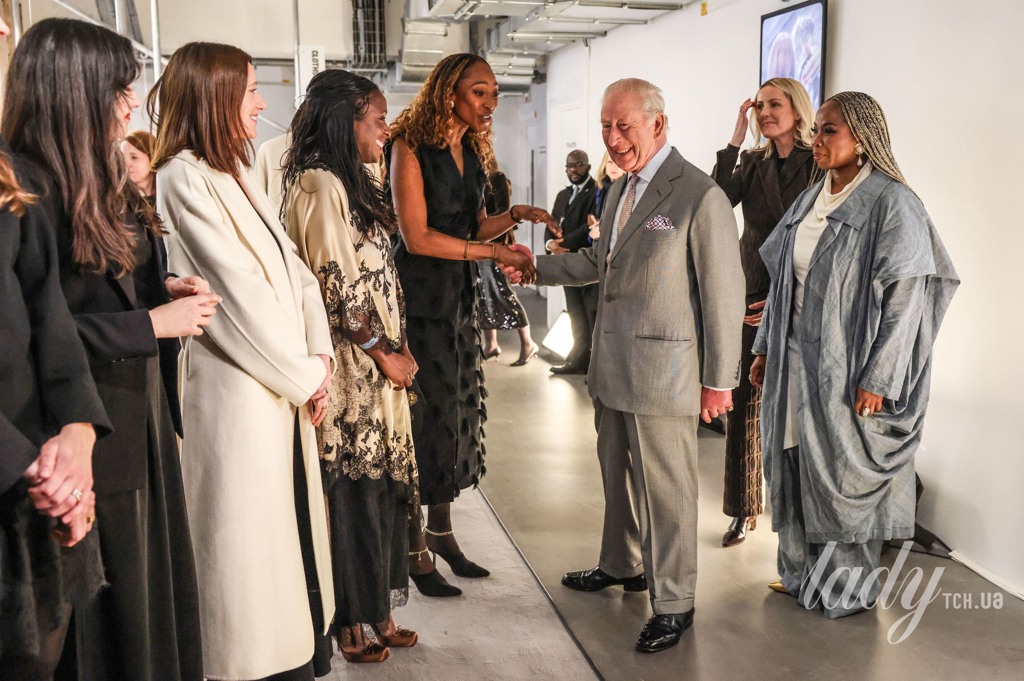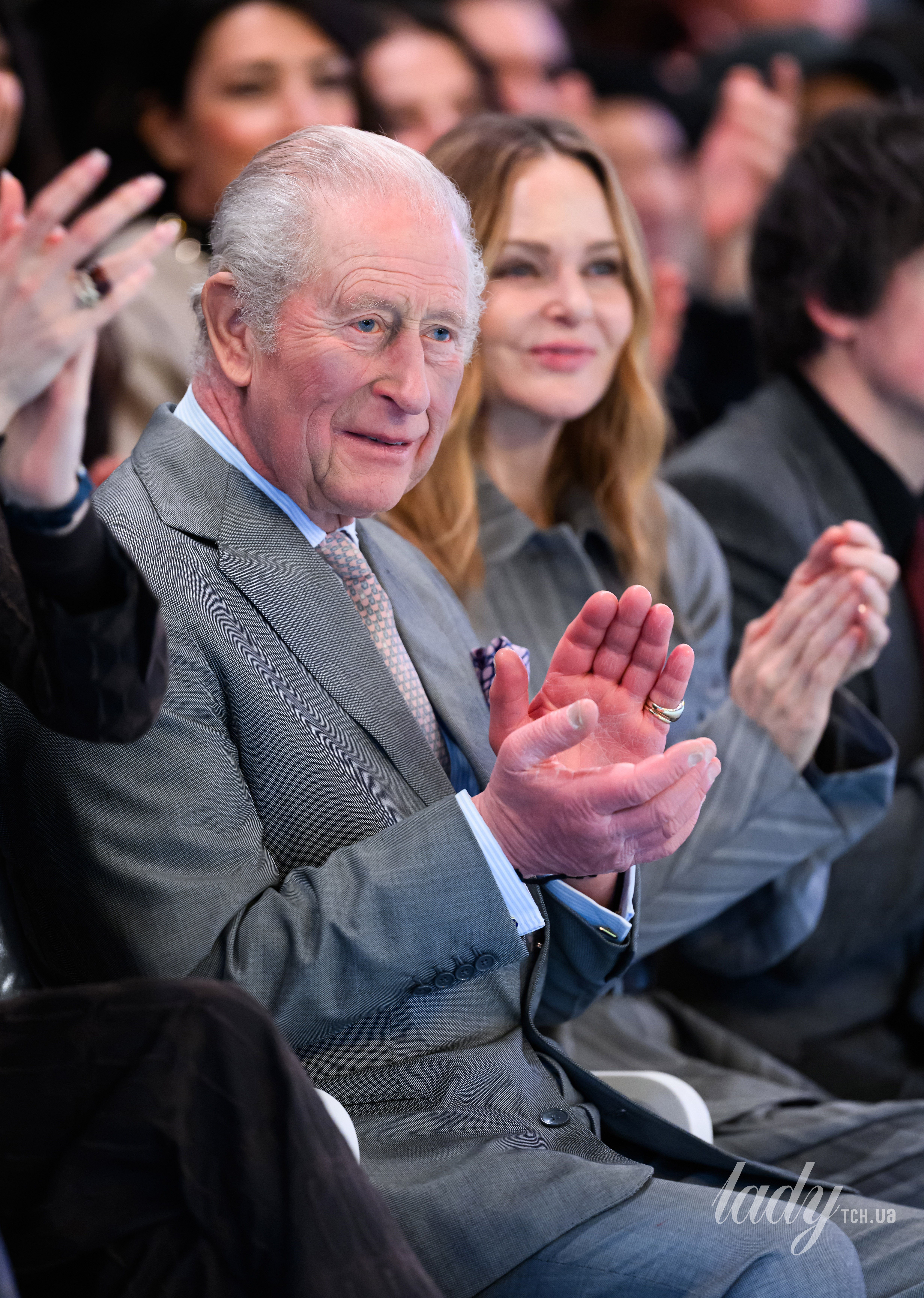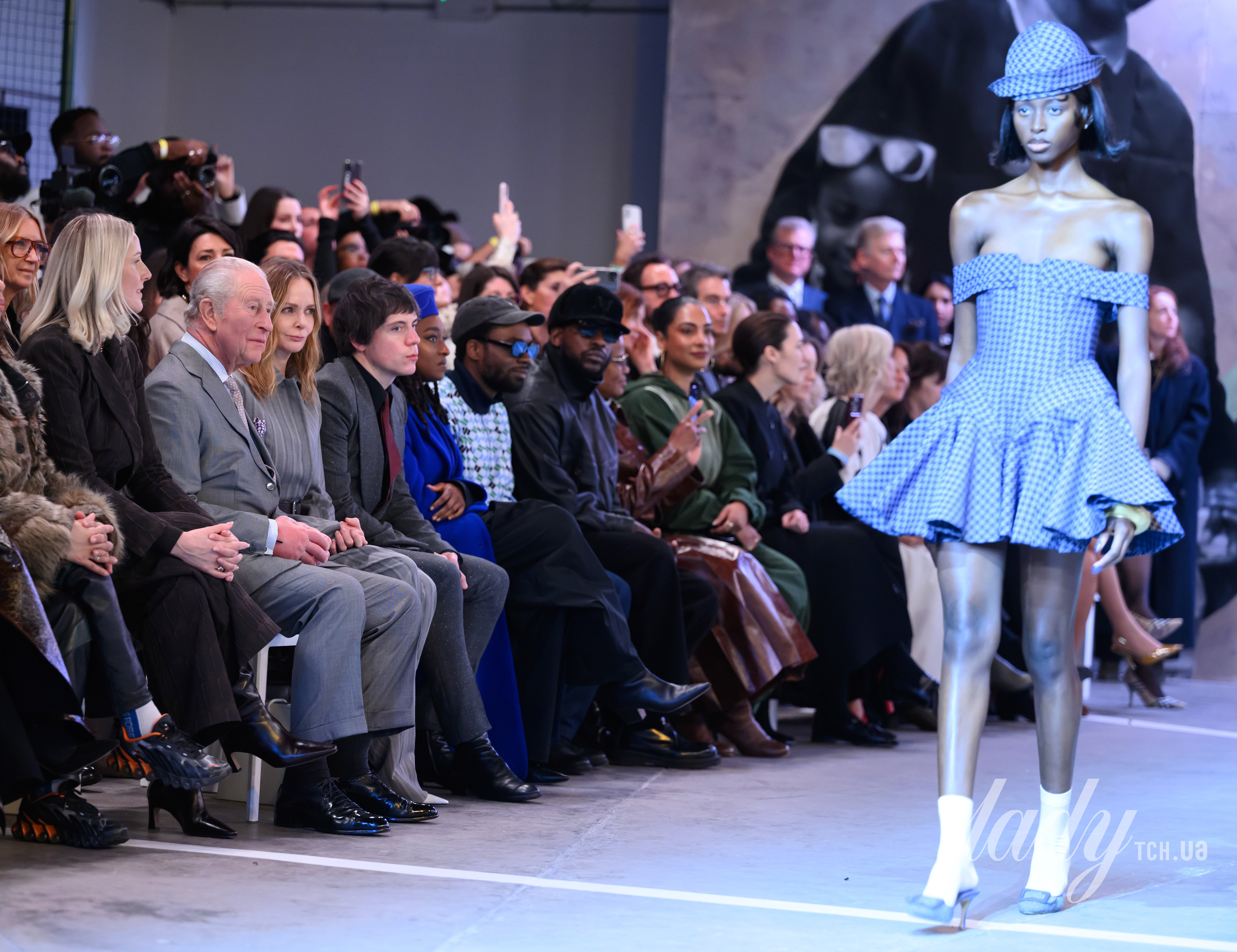 Король сидів поряд з генеральним директором Британської ради моди Лорою Вейр та дизайнеркою Стеллою Маккартні на показі британсько-нігерійського дизайнера Толу Кокера під час Лондонського тижня моди.