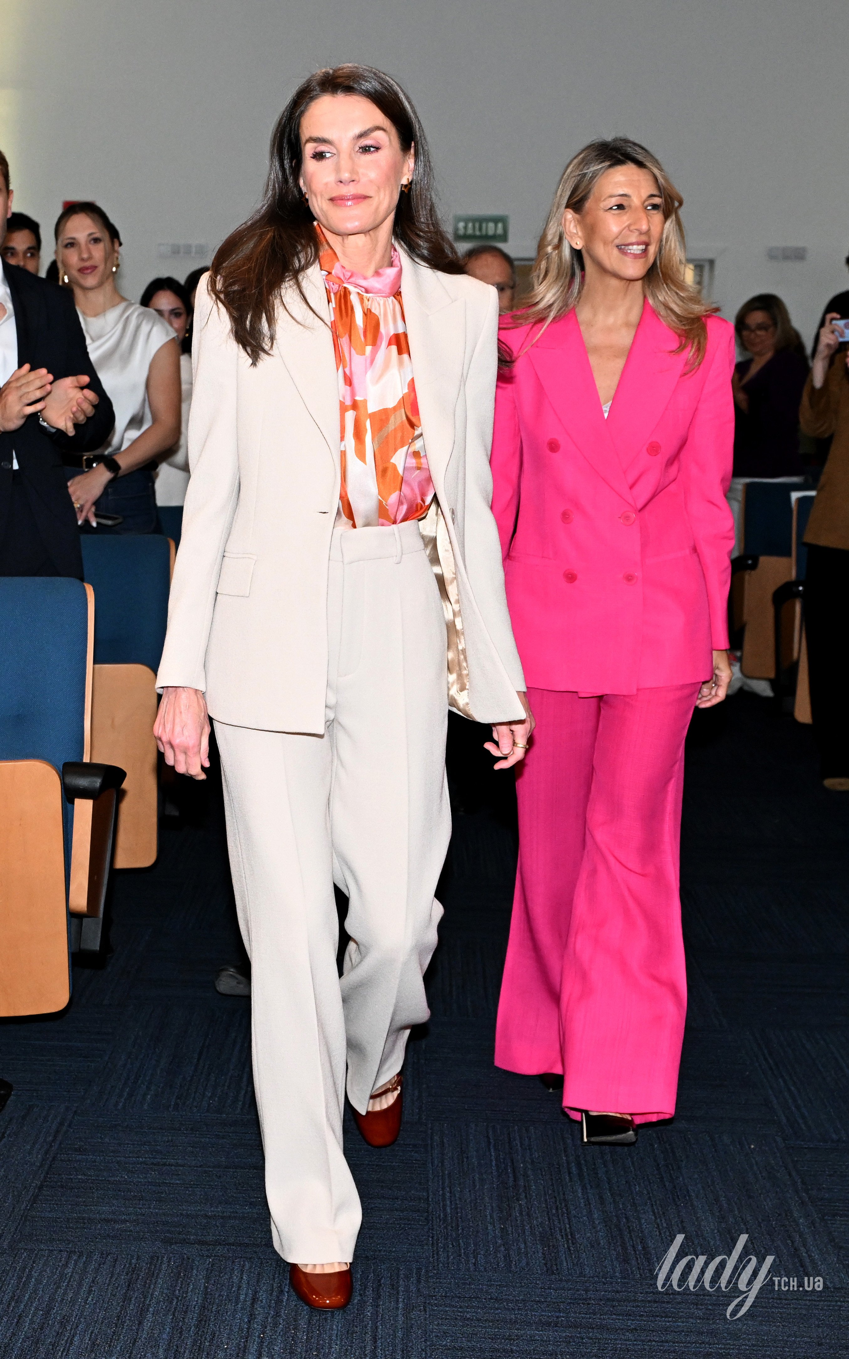 А буквально днем раніше королева з'явилася на святкуванні 10-річчя програми «Молоді таланти» у Торговій палаті Іспанії в Мадриді, де сяяла в строкатій блузці та костюмі ніжного кремового відтінку.