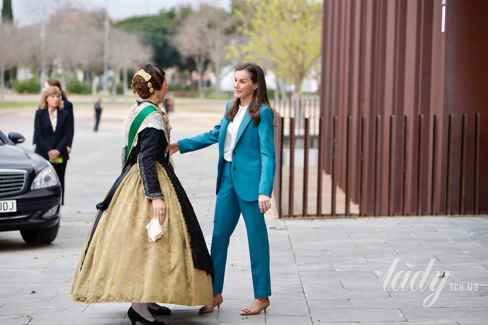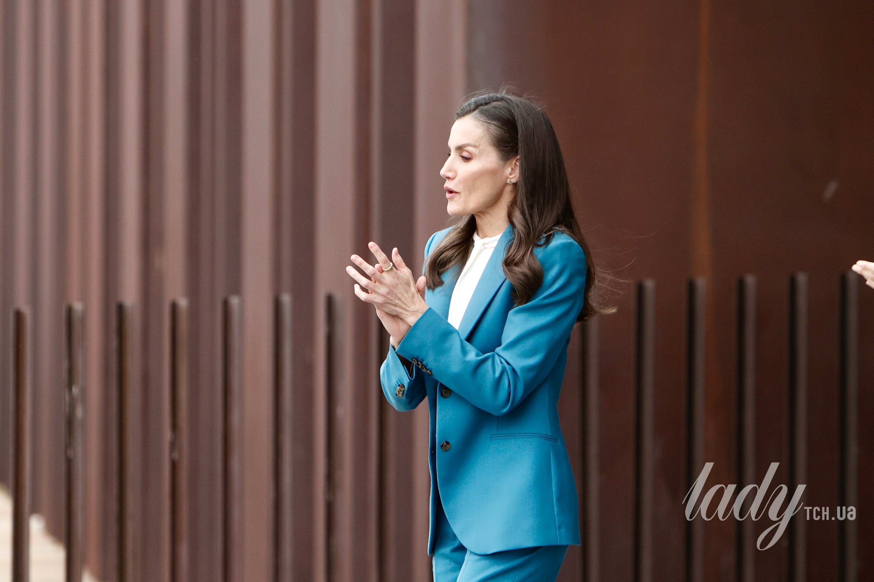 Для цього виходу у світ королева обрала строгий костюм і повернула до свого гардеробу один зі своїх улюблених видів взуття. Летиція була у білій блузці, бірюзовому костюмі та нюдових туфлях-човниках на невисоких підборах із пряжкою.