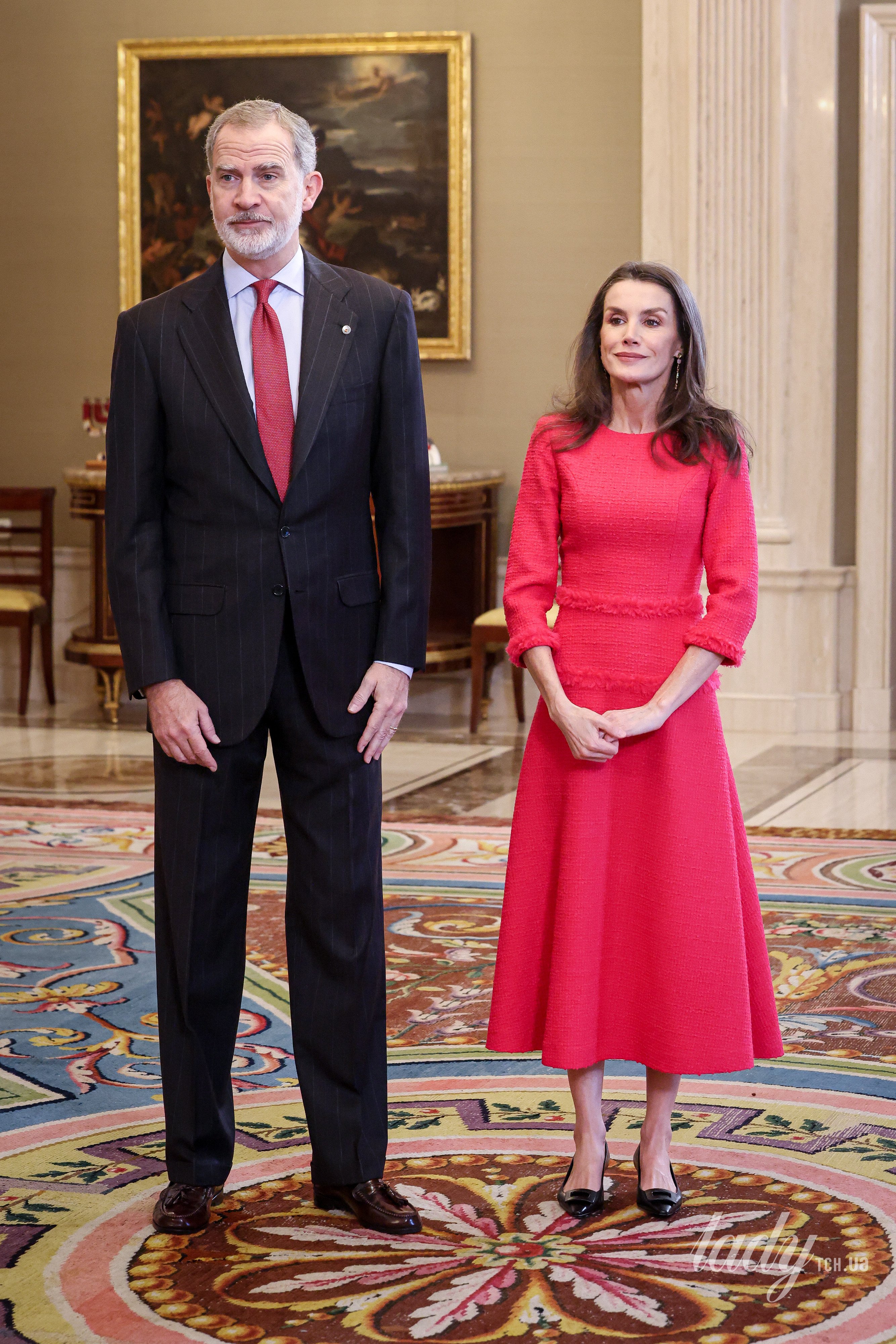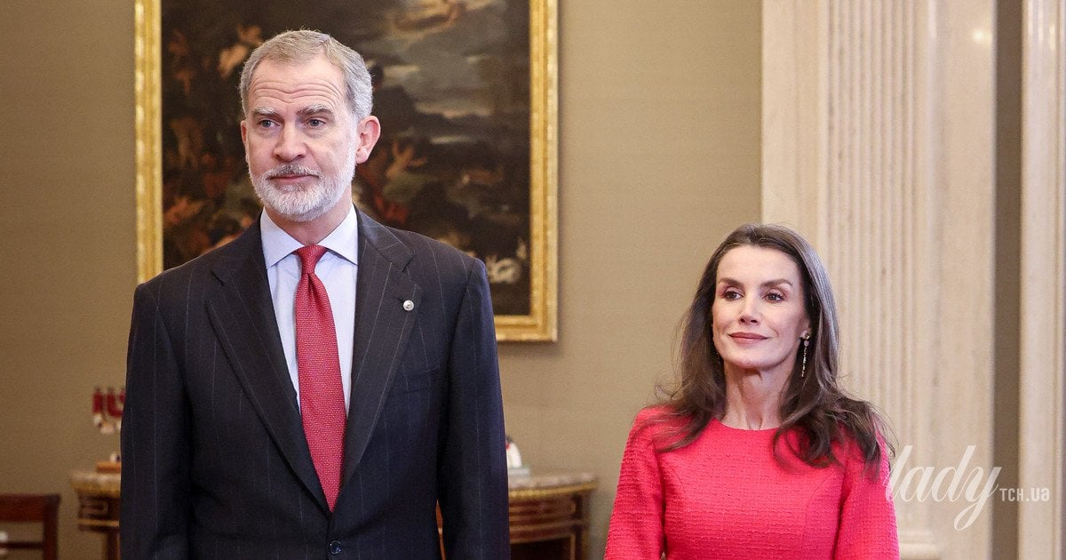 Летиція з'явилася на прийомі в рожевій сукні з твіду з рукавами три чверті та хутряним оздобленням. Взута вона була в туфлі-човники з невеликим підбором і пряжкою спереду від її улюбленого бренду Magrit. Також образ доповнювала каблучка Coreterno, яке стала незамінною прикрасою у її королівській колекції ювелірних виробів, а також вона була у сережках-висячках. Король Філіп VI одягнув класичний костюм у смужку і доповнив його білою сорочкою та краваткою, підібраною до тону вбрання його дружини.
