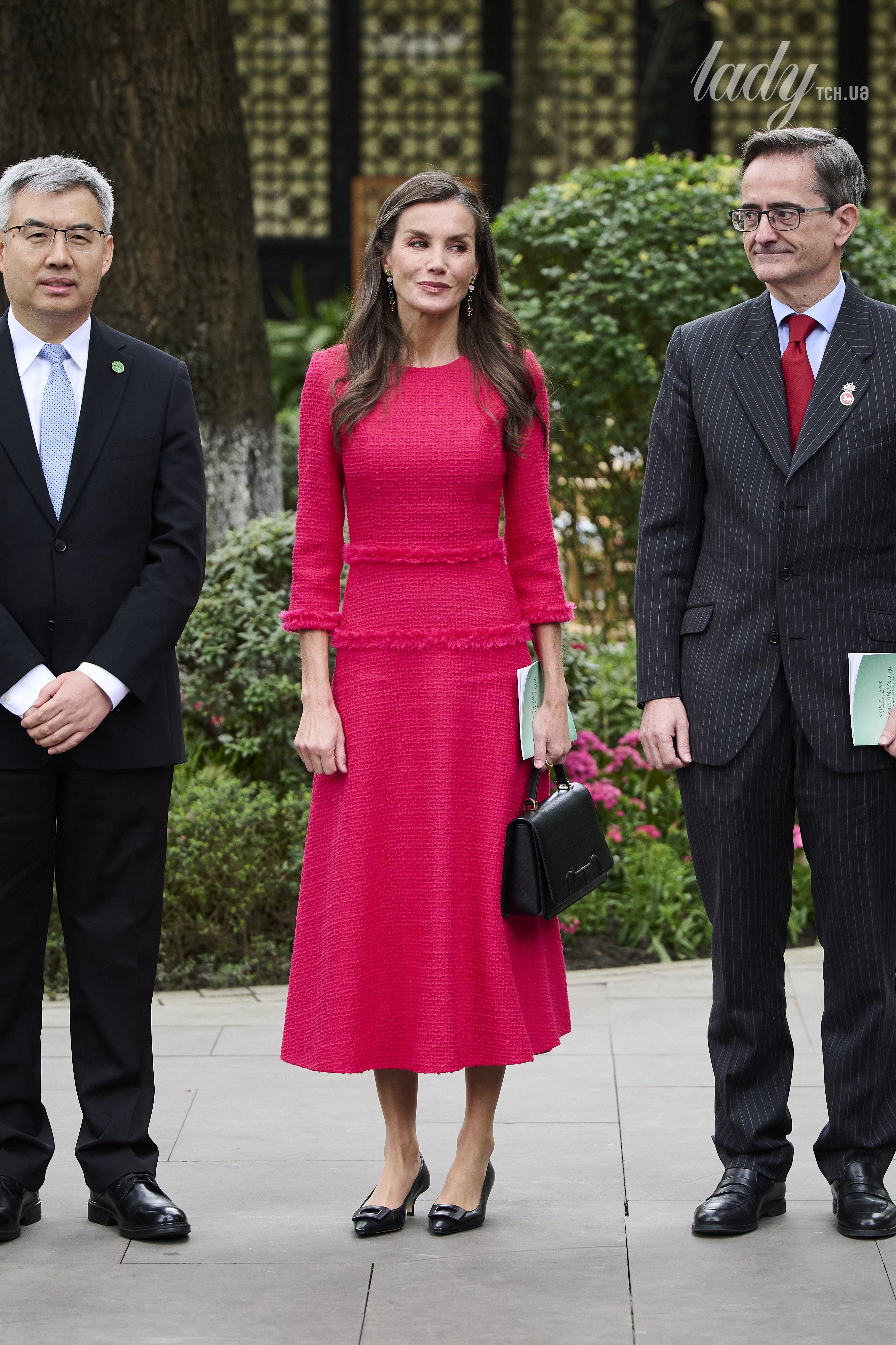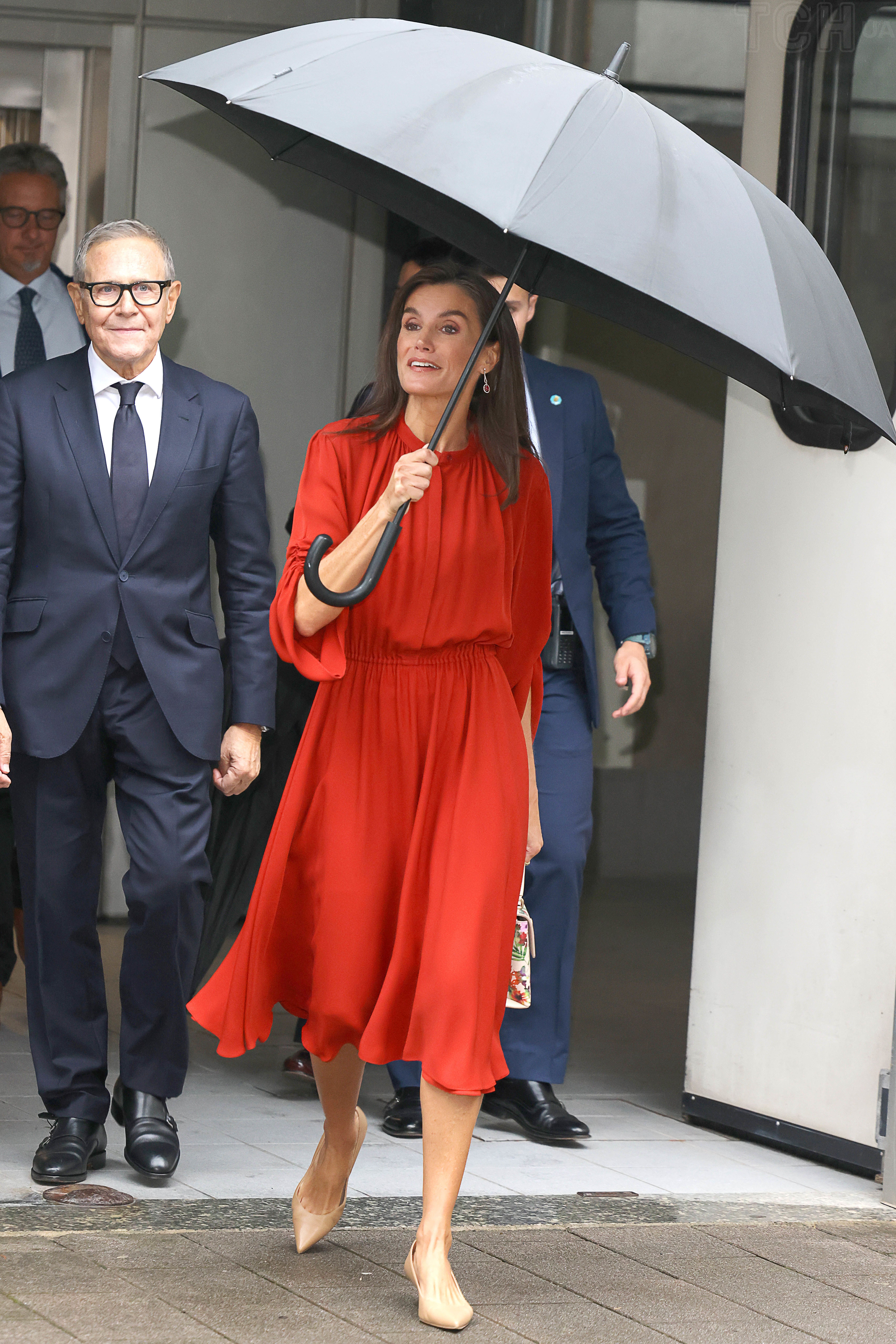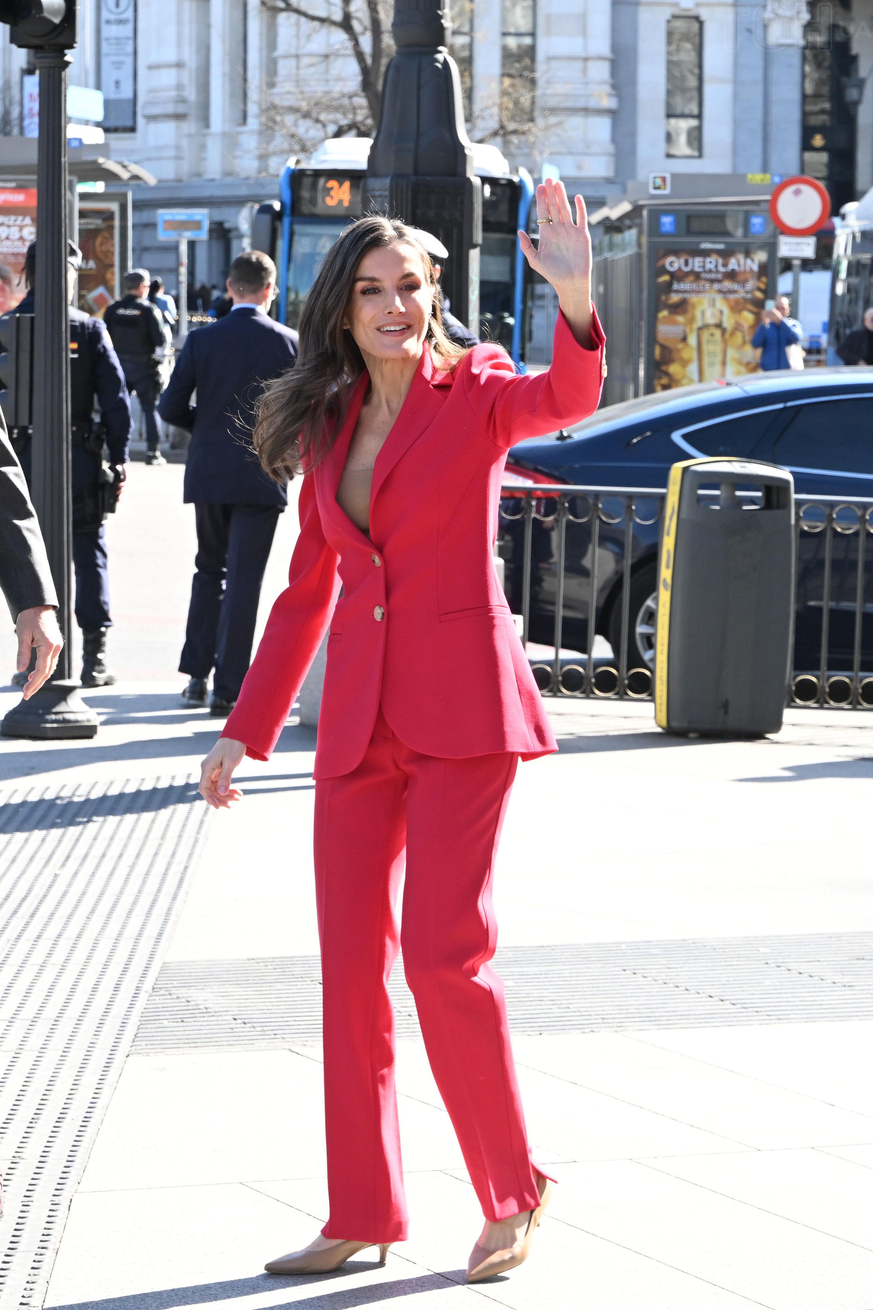 Куртка королеви з її чіткими лініями та застібкою на ґудзики мала той легкий відтінок шістдесятих, який так пасує Її Величності: розслаблені плечі та короткий фасон. Королева Летиція роками демонструвала, що червоний, у всіх його варіаціях, є одним із її улюблених кольорів, який вона обирає на найважливіші заходи.