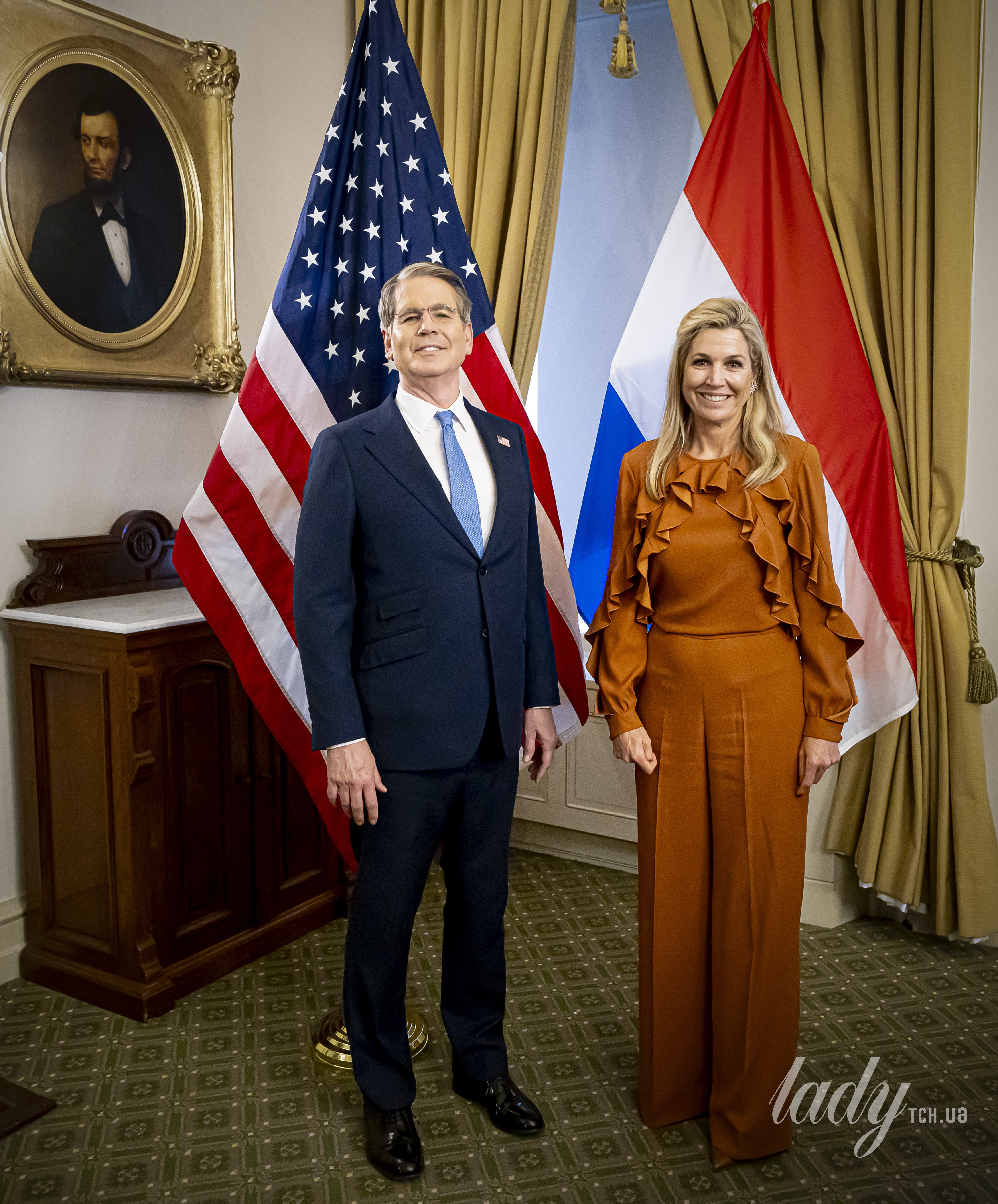 Раніше під час візиту до США та зустрічі з президентом Трампом у Білому домі королева Максима продемонструвала інший образ у помаранчевій сукні, що було вельми символічно для неї, як для представниці Дому Оранських – титулу, який носить її чоловік король Віллем-Олександр та дочка принцеса Катаріна-Амалія.