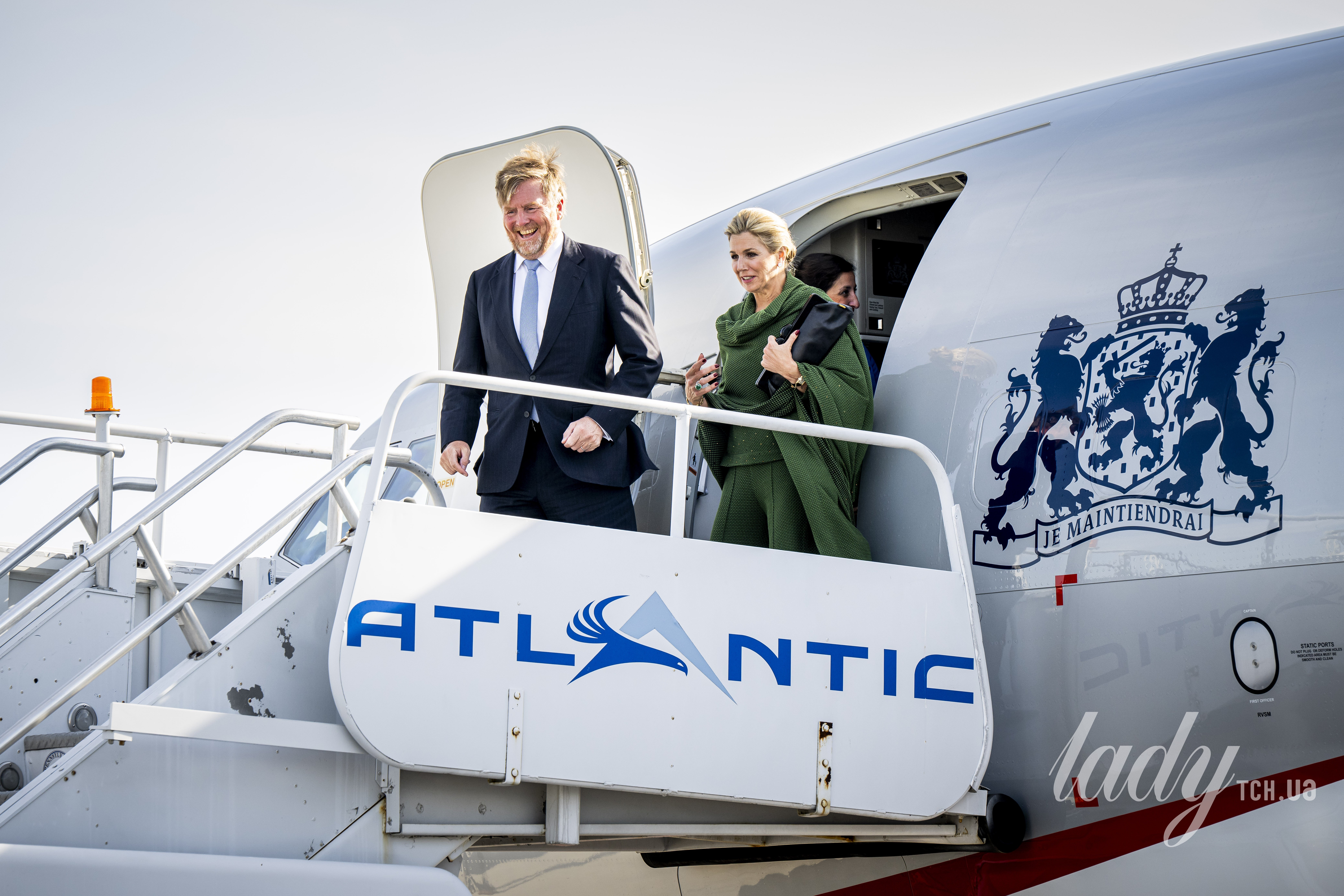 Коли королева Максима та її чоловік король Віллем-Олександр прибули до аеропорту Філадельфії, в штаті Пенсільванія, для свого робочого візиту до Сполучених Штатів, Її Величність одяглася в костюм від Taminiau красивого зеленого кольору з накидкою, і підібрала смарагдові та діамантові прикраси.