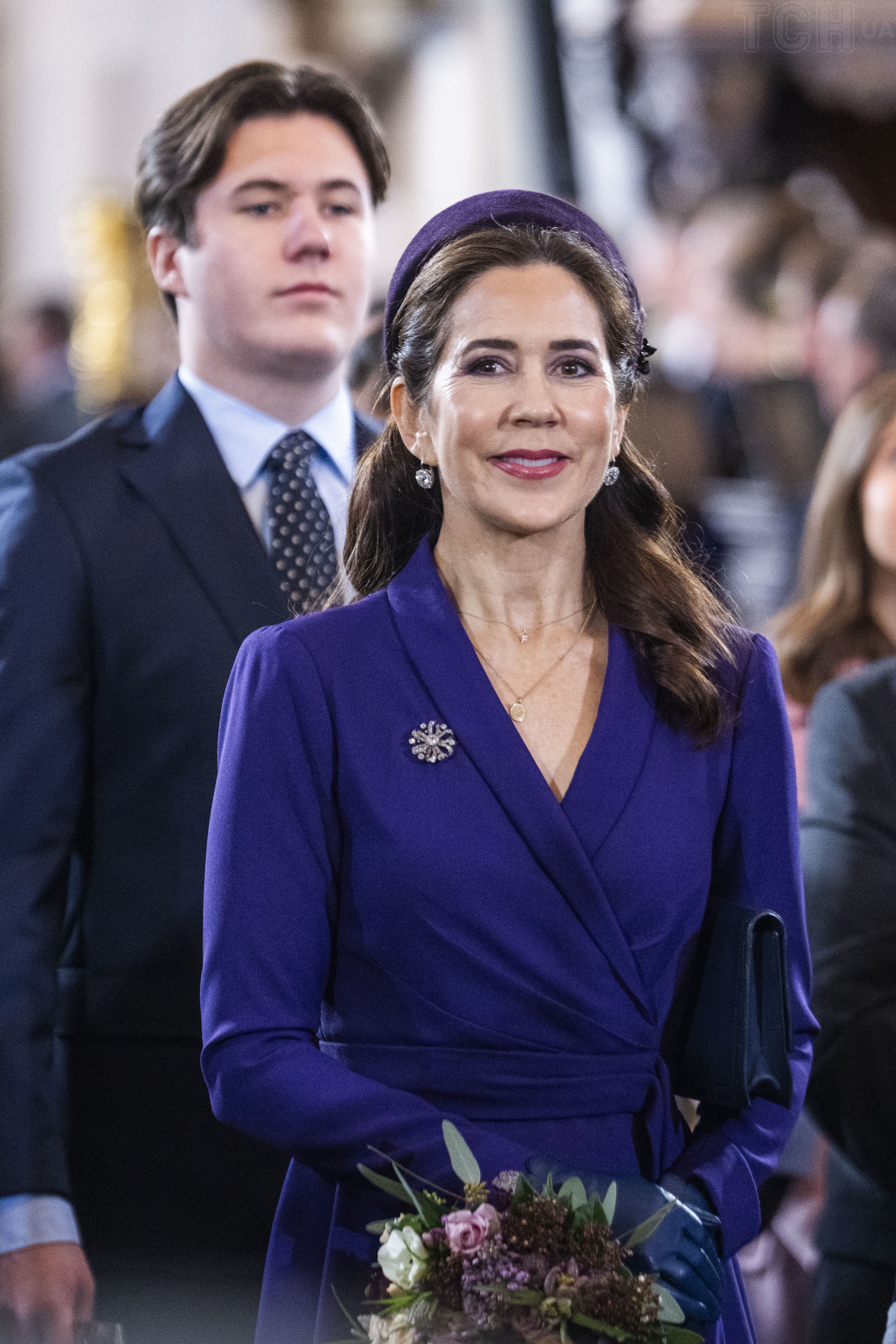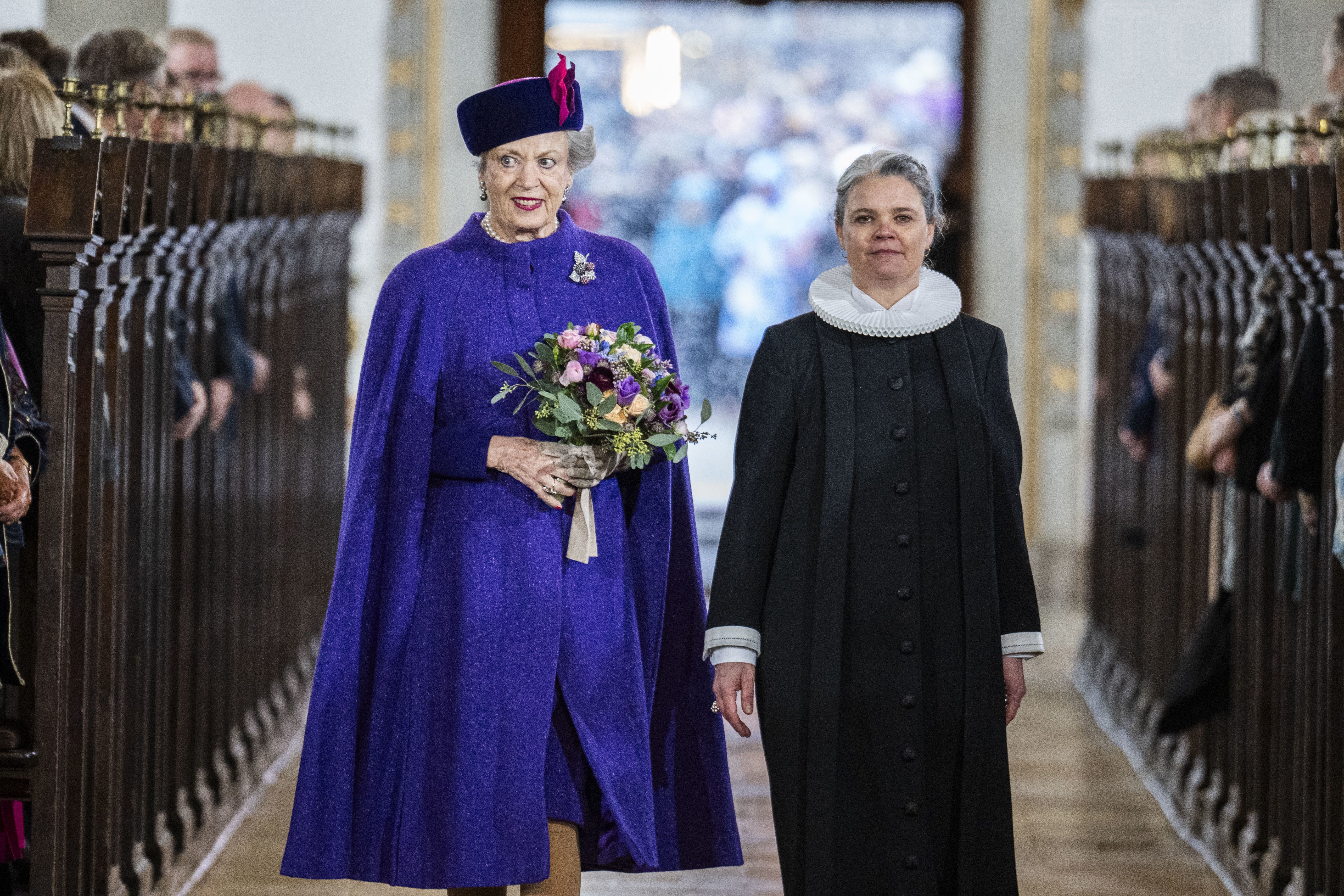 Також на службі була присутня королева Маргрете II та її сестра принцеса Бенедикта. Колишня монархиня була у фіолетовій сукні та сірій довгій шубі, а її сестра обрала синю сукню та пальто до тону, а також головний убір.