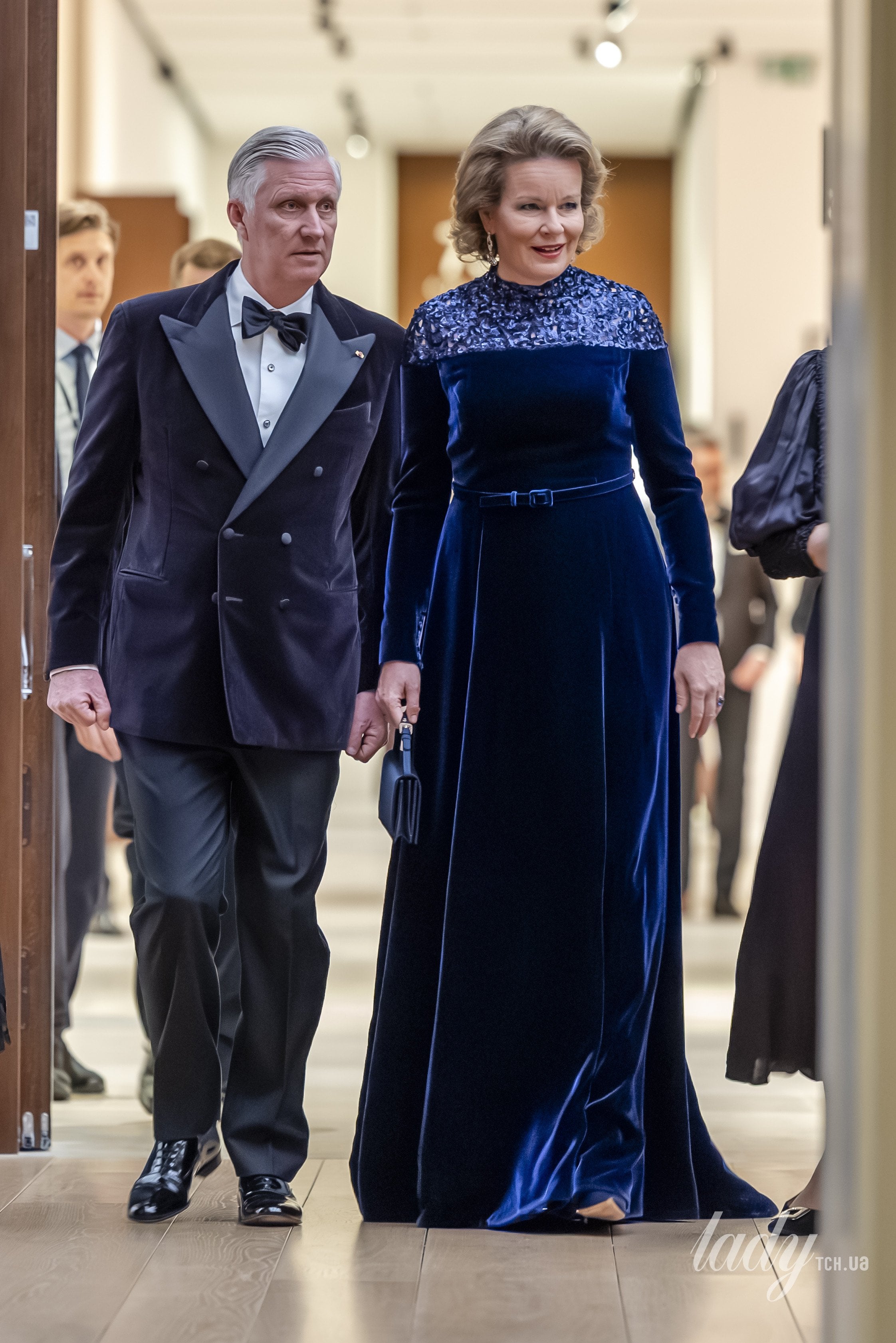 Образ свій королева доповнила маленькою синьою сумкою, сережками в стилі ардеко з діамантами та сапфірами, вечірнім макіяжем та пишним укладанням. Король Філіп обрав елегантний смокінг, білу сорочку та краватку-метелика.