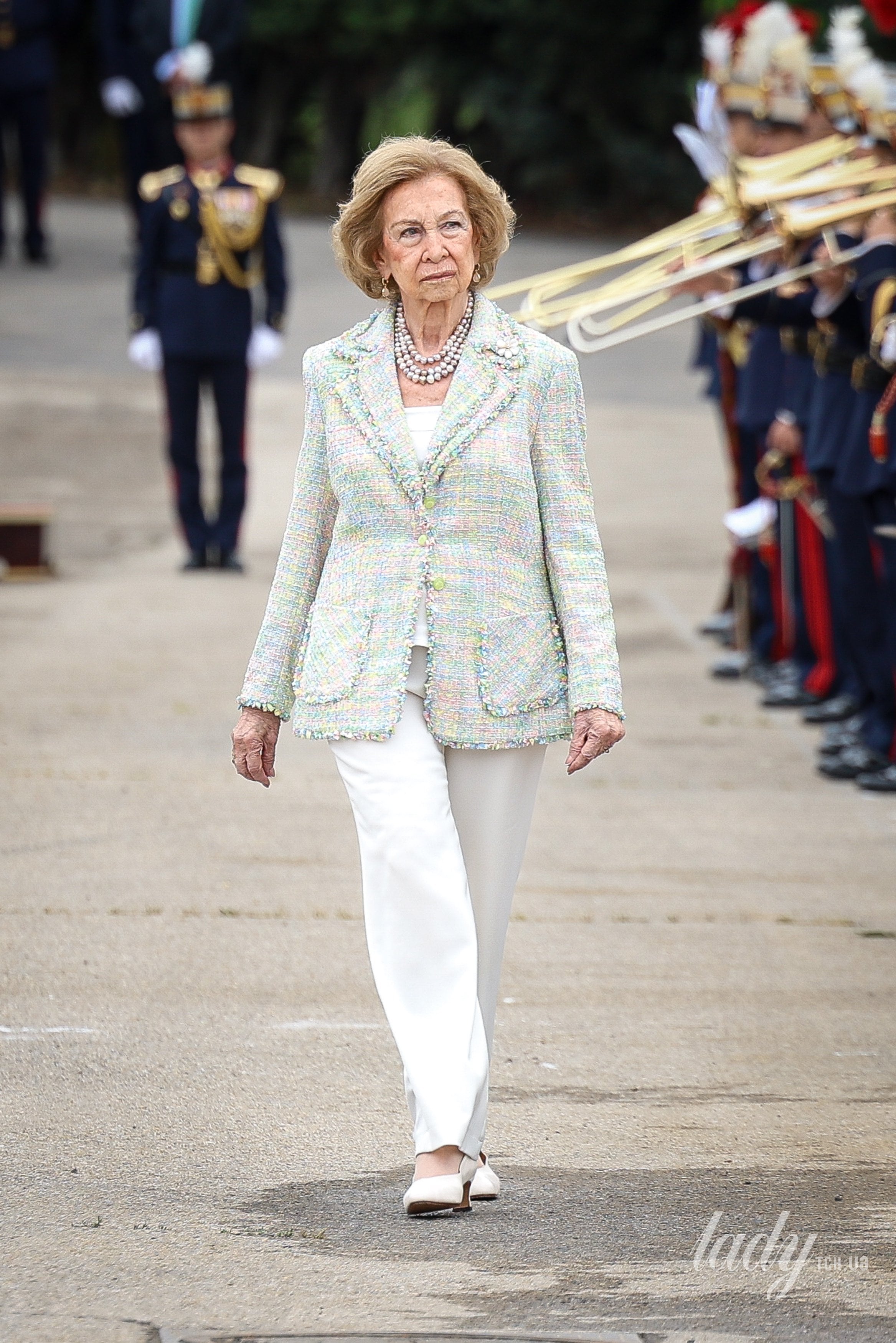 Її Величність королева головувала на церемонії присяги цивільного персоналу у казармах Ель-Пардо. Для цього виходу Софія переглянула свій вінтажний гардероб, одягнувши жакет від бренду, який був популярним у 90-х роках.