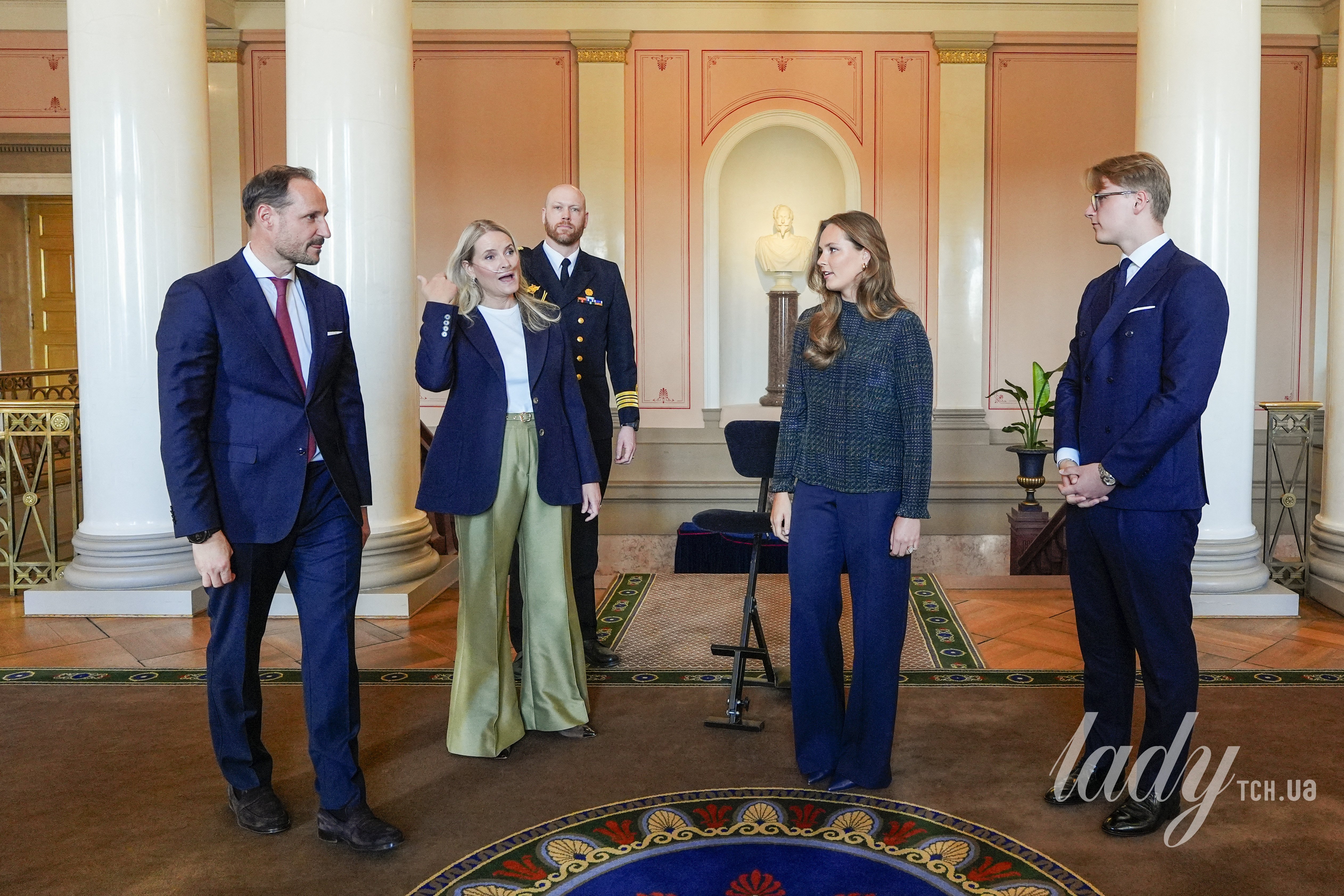 Її чоловік кронпринц Гокон також з’явився на цій зустрічі, як і діти пари — принцеса Інгрід Олександра, одягнена в короткий жакет і сині штани, та її брат принц Сверре, який був у темно-синьому костюмі та з синьою краваткою, як і його батько.