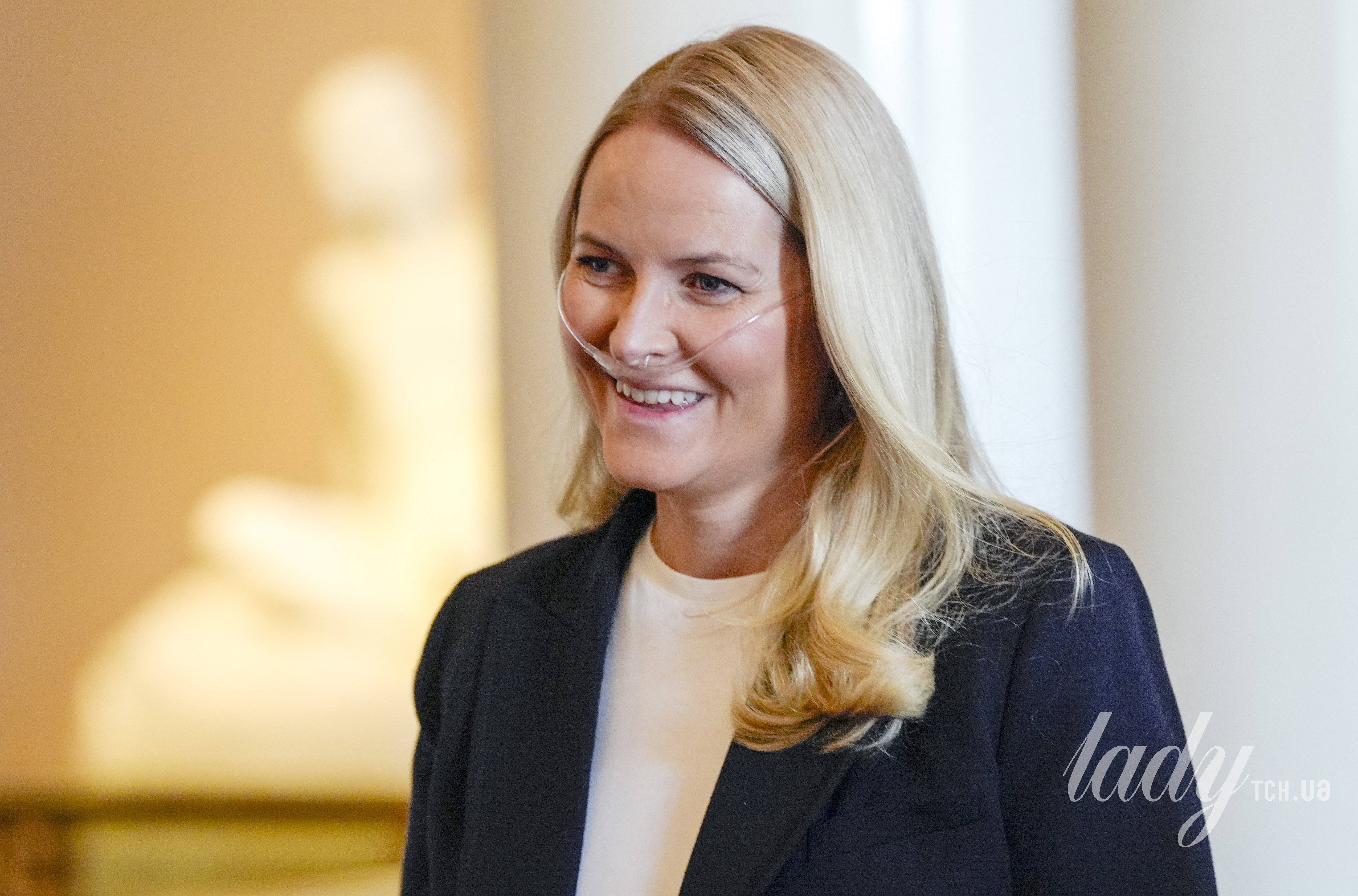 52-річна принцеса Метте-Маріт зазнає труднощів із диханням через хронічний легеневий фіброз, тому на заході вона з’явилася з кисневим катетером на обличчі, який їй необхідний, щоб допомагати дихати. На фотографіях можна побачити катетер, підключений до портативного апарату, який несе військовий помічник, що стоїть за принцесою.
