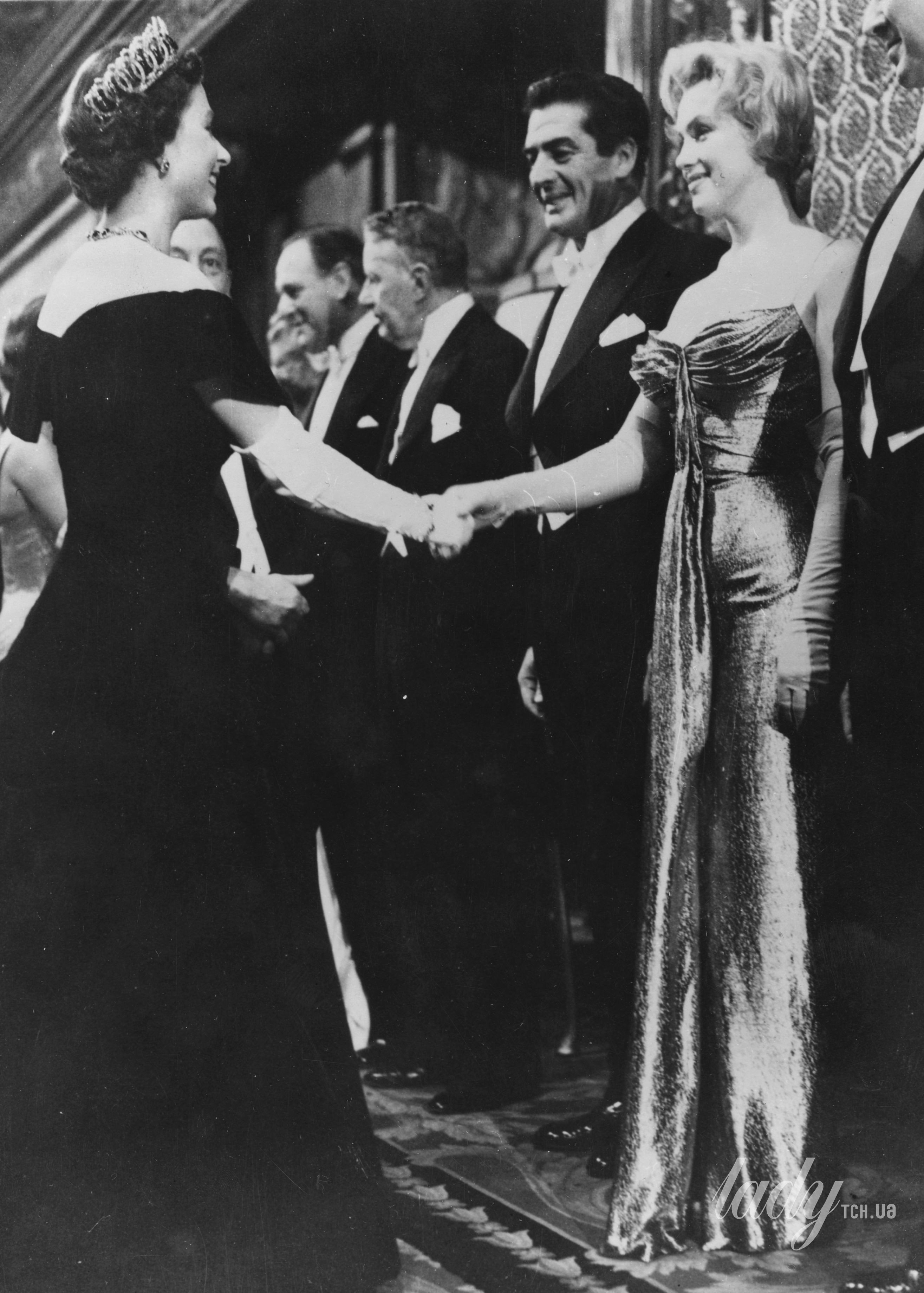 На кадрах їхньої зустрічі видно, як Монро тисне руку королеві Єлизаветі II та обидві жінки усміхаються. Монархиня того дня була одягнена у чорну сукню з відкритими плечима та блискучу Володимирську тіару.
