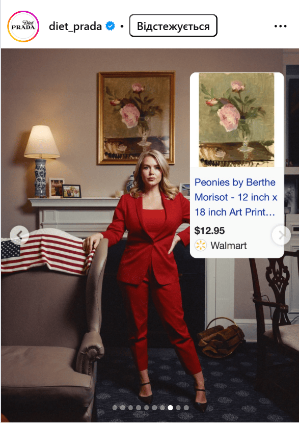 У виданні Vanity Fair вийшов великий матеріал, присвячений другому терміну президентства Трампа, однак багато суперечок у Мережі викликав не так зміст публікацій, як портрет 28-річної прессекретарки Білого дому Керолайн Левітт. Скандальна особа позувала для фото, ймовірно, у своєму кабінеті в Білому домі, оскільки за її спиною на каміні було багато особистих фотографій з сином і чоловіком, але не ці знімки стали зіркою обговорень у соцмережах, а картина, яка висіла над її головою.