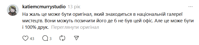 Однак у Threads ведеться жваве обговорення цієї відомої роботи. Оскільки картина не часто виставляється музеєм на постійному стенді, багато хто припустив, що Національна галерея мистецтв могла дати картину для фотосесії або й більше — надати її Білому дому для декорування кабінету Керолайн.