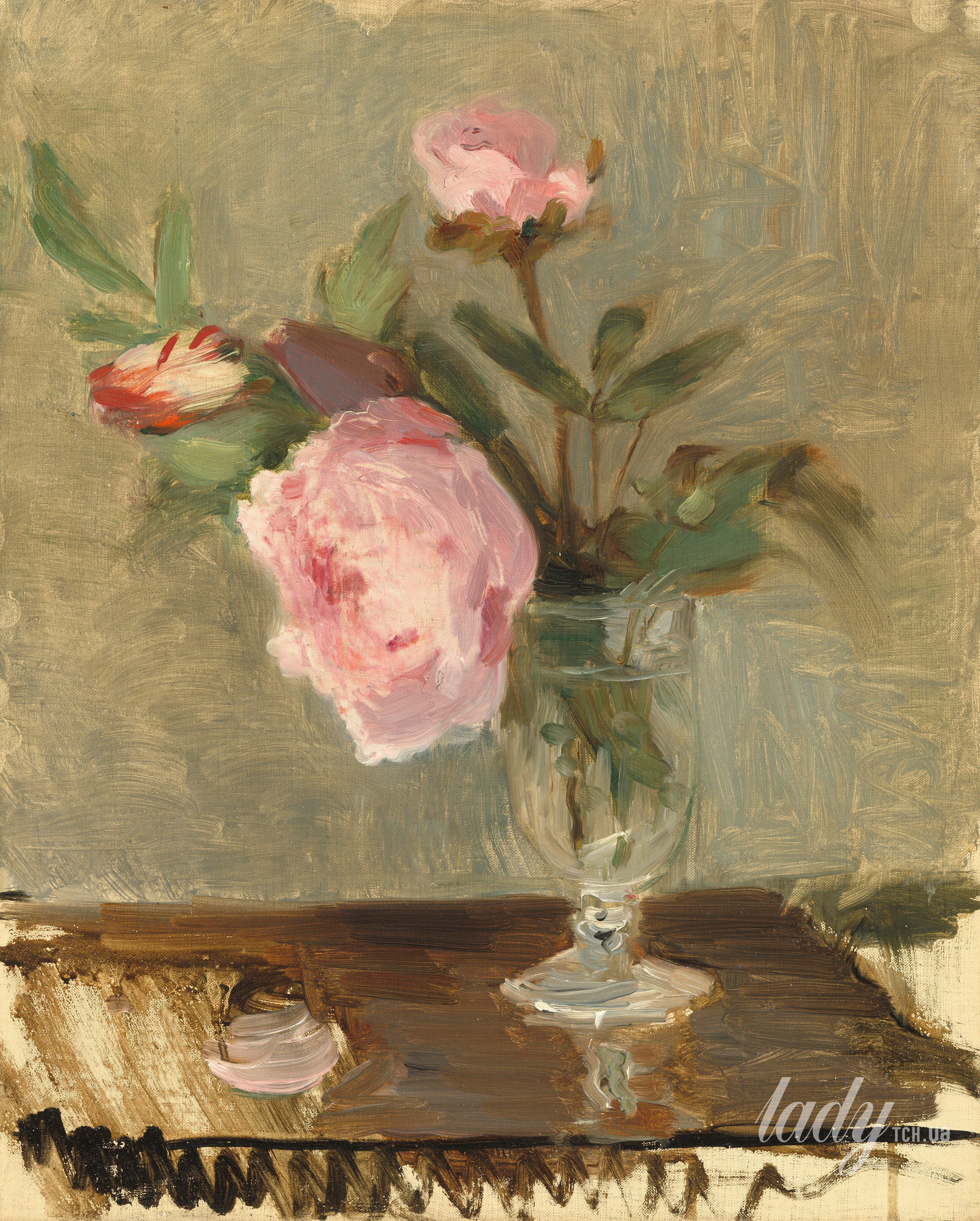 Полотно, на якому зображені ніжні півонії у скляній вазі, ймовірно, є репродукцією роботи відомої французької імпресіоністки Берти Морізо. Вона написана у 1841–1895 роках і зберігається в Національній галереї мистецтв у Вашингтоні.