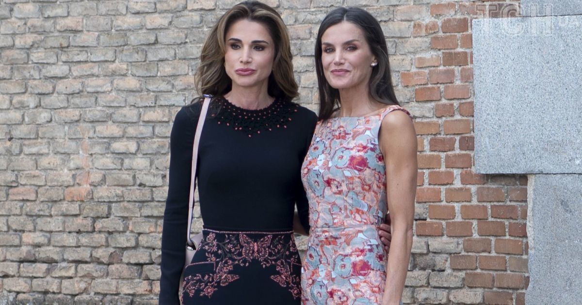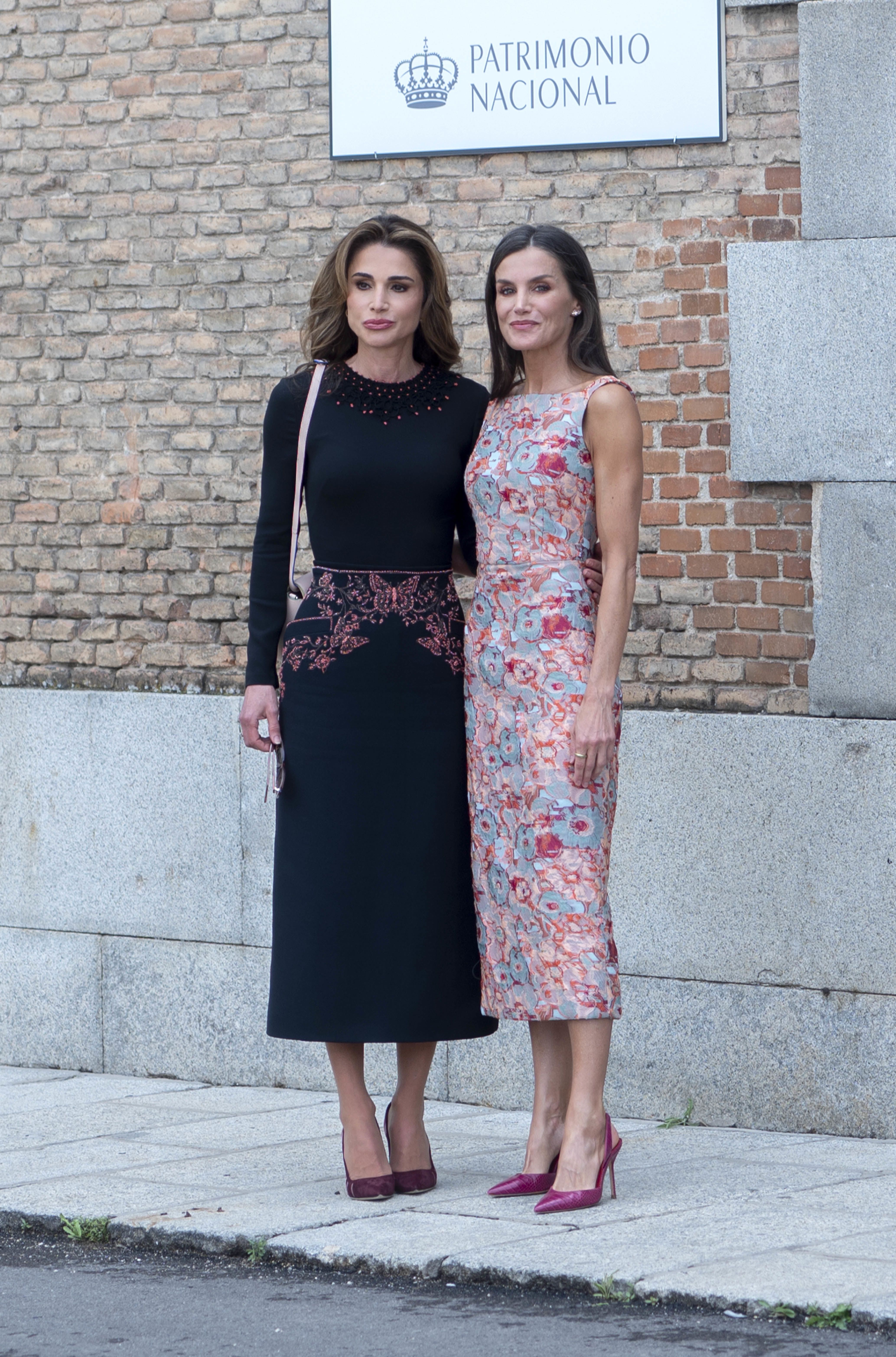 Сьогодні королева Ранія та королева Летиція разом позували після прибуття до шкіл-майстерень та майстерень з працевлаштування Patrimonio Nacional у Королівському палаці в Мадриді.