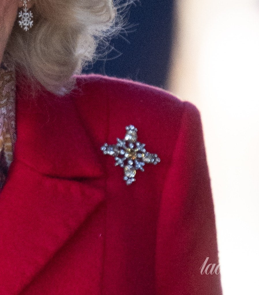 Цього року Камілла обрала дійсно святковий образ, адже одягла вбрання червоного кольору — відтінку, який був особливо популярним 2025 року і саме його часто обирали для червоних доріжок відомі красуні. Королева була в пальті від Fiona Clare Aldridge та капелюшку від Philip Treacy — двох брендів, з якими давно співпрацює, і саме вони створили безліч її образів для найважливіших подій. Гламурним доповненням образу королеви стала брошка у вигляді хреста, яку вона прищепила до пальта.