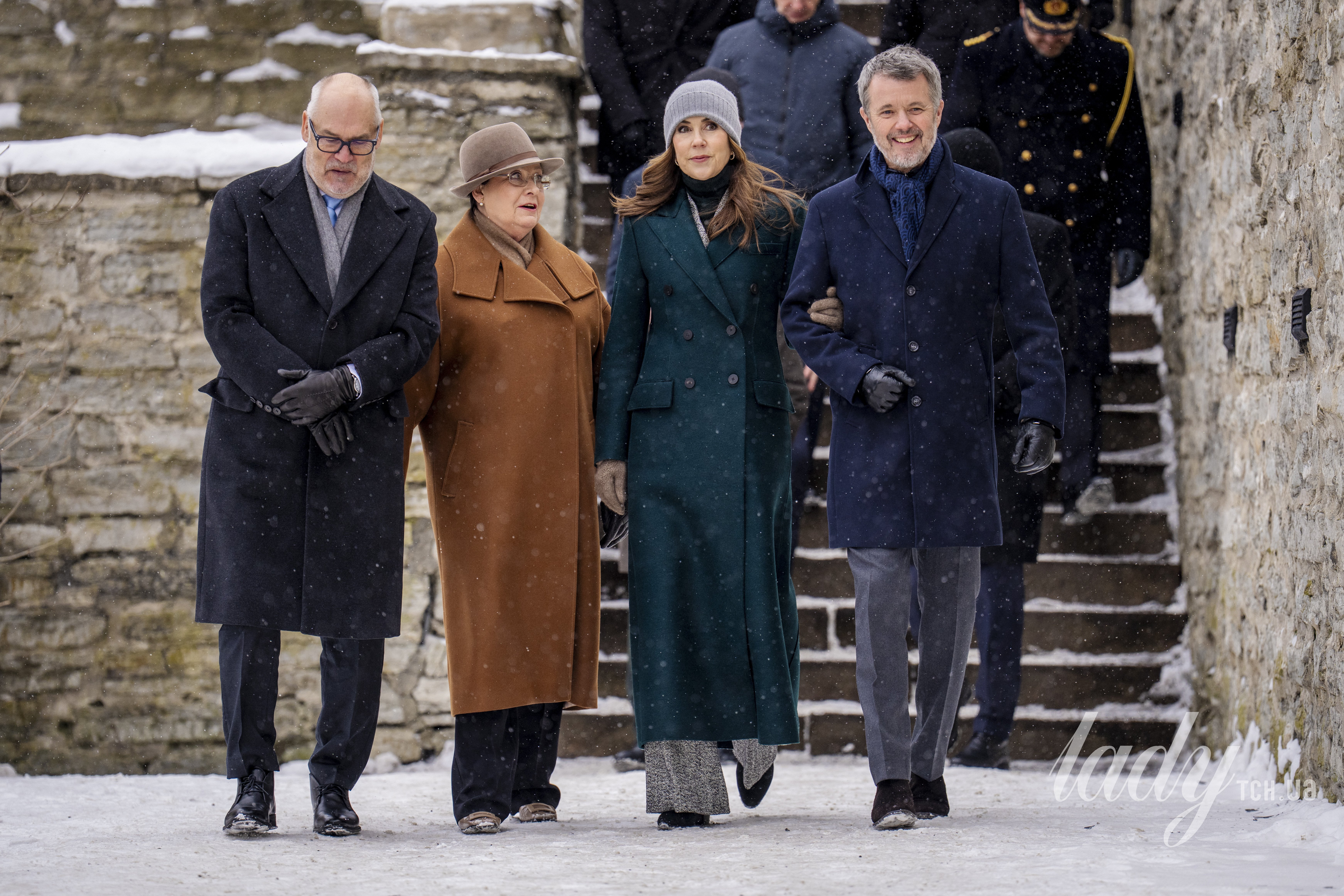 Під час візиту до Королівського саду Данії в Таллінні королева Мері продемонструвала по-справжньому зимовий аутфіт і навіть одягла шапку, оскільки погода була холодна та сніжна. На королеві було темно-зелене двобортне пальто Harris Wharf London, широкі штани The Fold та сіра шапка-біні на голові, яка анітрохи не зіпсувала королівської зачіски.