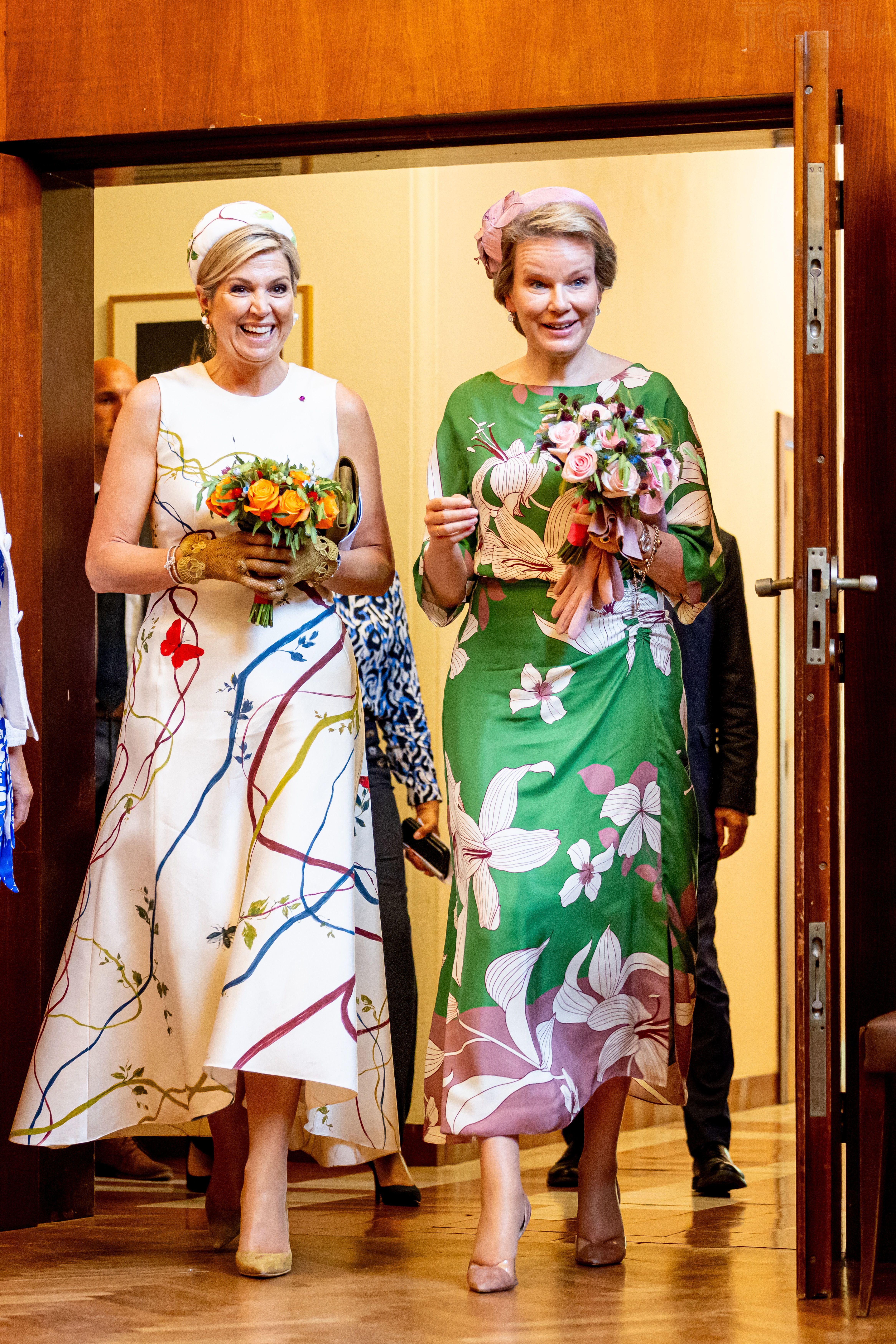 Не менш яскравою цього дня була й королева Бельгії Матильда. На ній була сукня з квітковою вишивкою від Dries Van Noten, помаранчеве пальто зверху, помаранчеві туфлі-човники також із прозорими вставками від Natan Couture, такі ж, як і у Максими, але іншого кольору. На голові у королеви був крислатий капелюх від Maison Fabienne Delvigne, у вухах – сережки з бурштином, а волосся зібране в низький пучок. Також вона одягла кілька золотих браслетів, свою сапфірову каблучку, годинник і взяла клатч до тону вбрання та рукавички зі шкіри. Її чоловік король Філіп одягнув світло-синій костюм, білу сорочку і краватку в смужку.