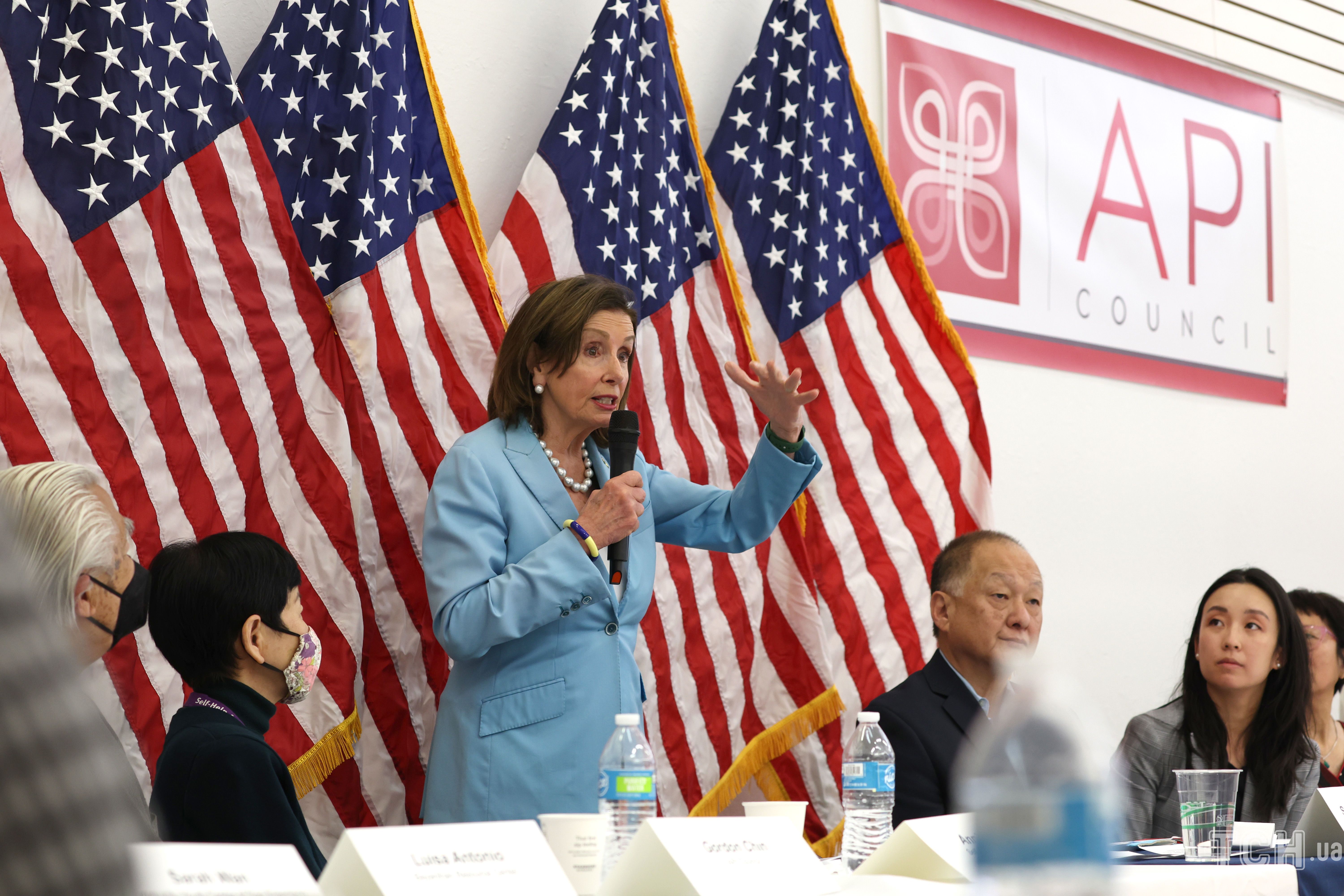 Аксесуар пані Пелосі поєднує з будь-яким одягом, незалежно від його кольору, а також одягає на лацкан жакетів значок із прапором США та України. Вчора, 31 травня, спікерка з'явилася на круглому столі в Сан-Франциско в блакитному штанному костюмі, який поєднала з білою футболкою і перлинними прикрасами.
