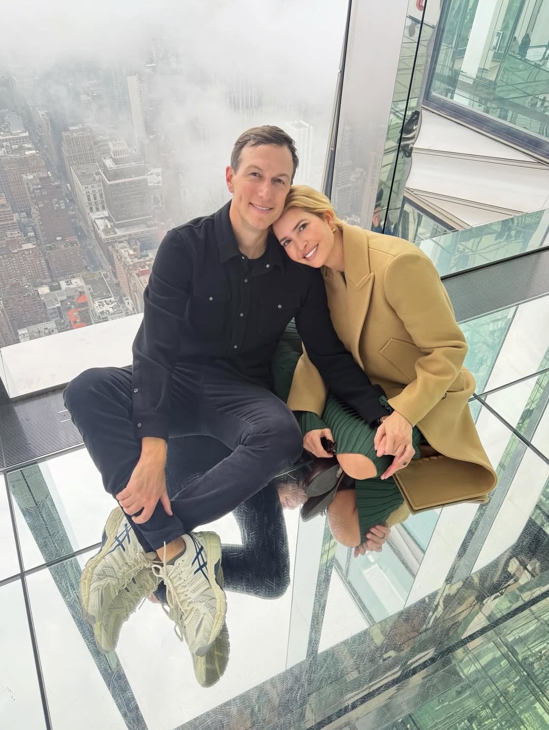 На першій світлині Іванка позувала зі своїм чоловіком Джаредом Кушнером, сидячи на скляній підлозі, на тлі міської архітектури.