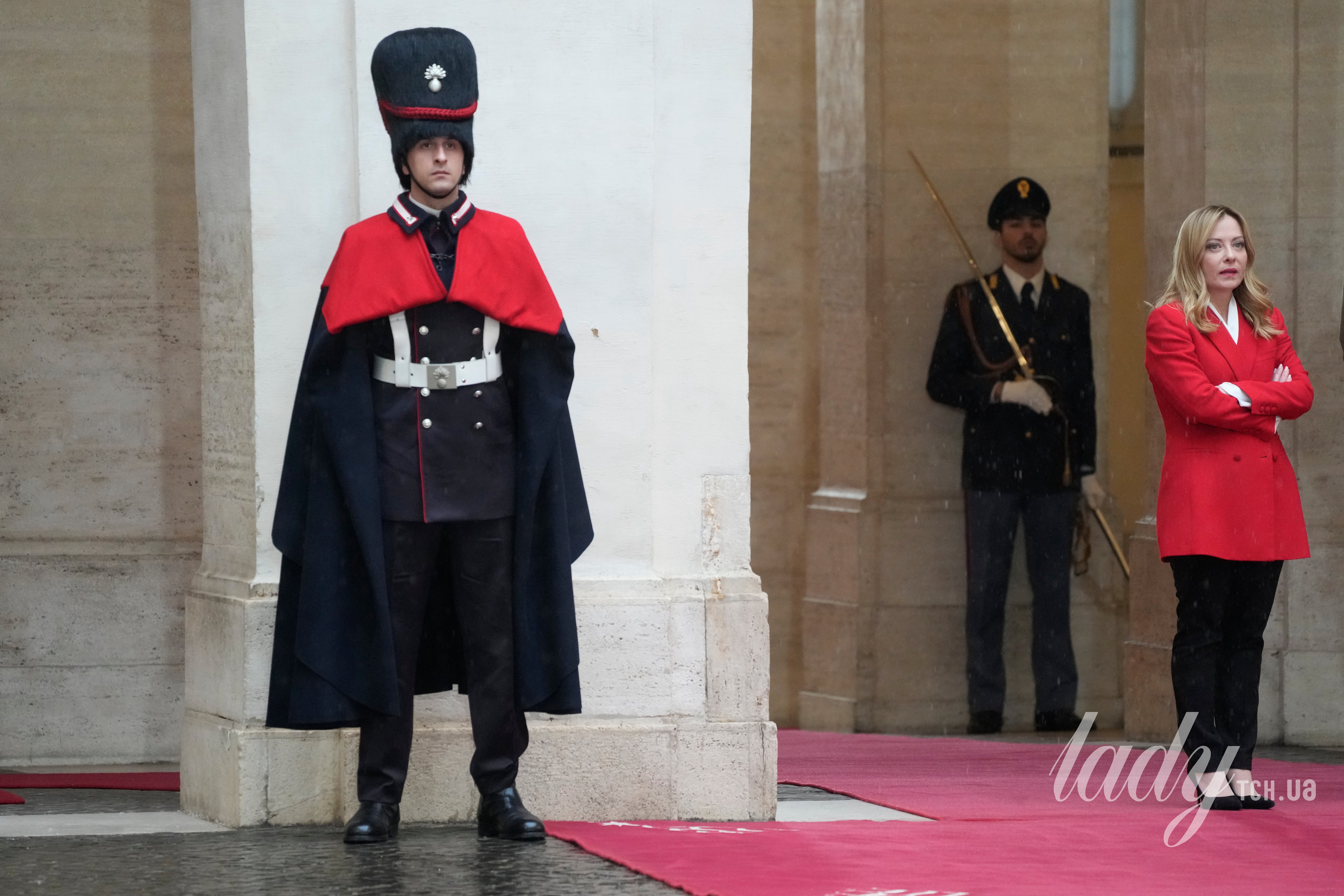 Прем’єр-міністерка Італії Джорджа Мелоні у червоному жакеті і блузці з V-подібним вирізом зустріла чеського колегу
