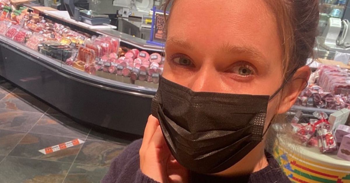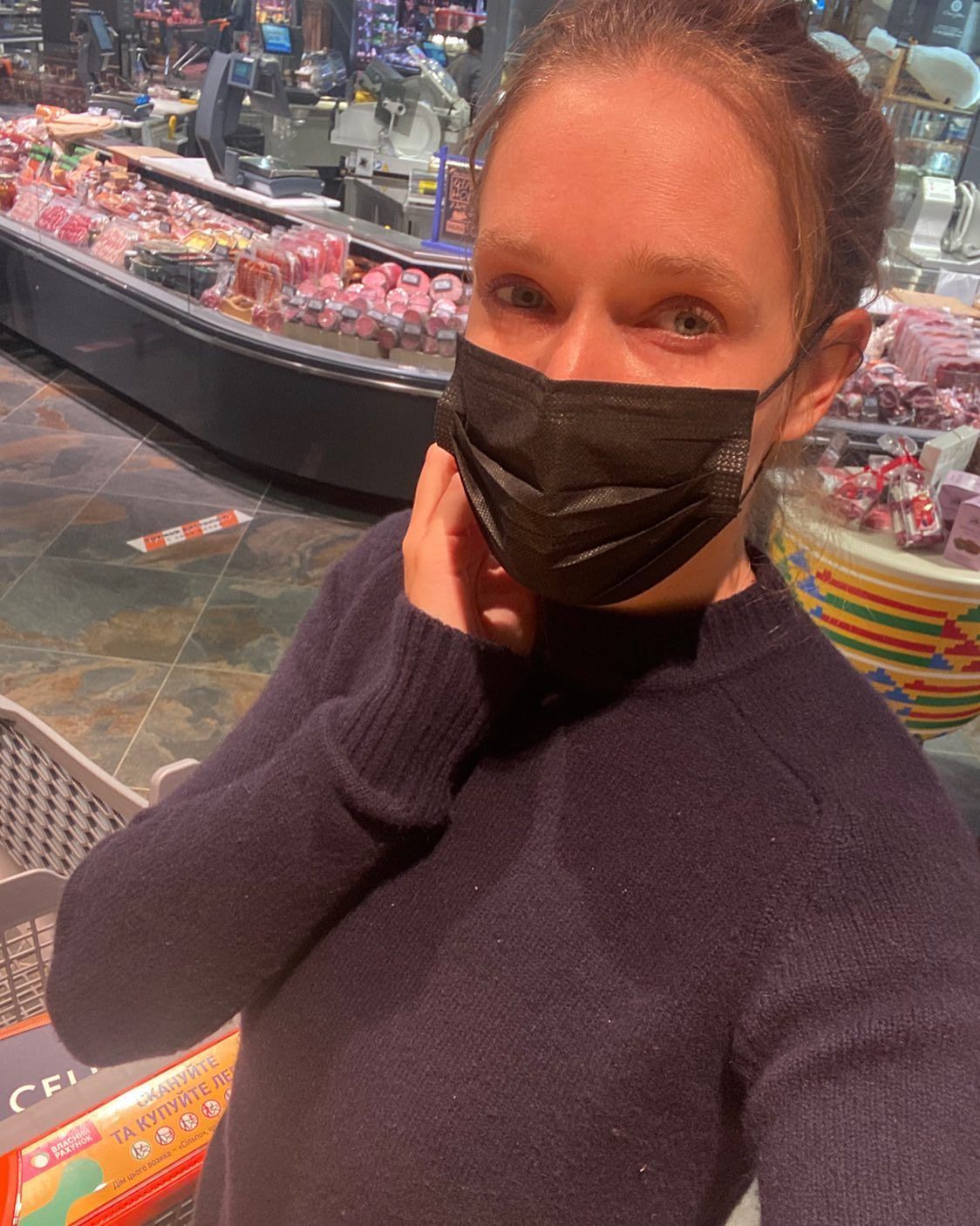 У той страшний ранок телезірка в паніці пішла до магазину купити продуктів і зробила там селфі. Вона була одягнена у чорний светр і чорну маску.
