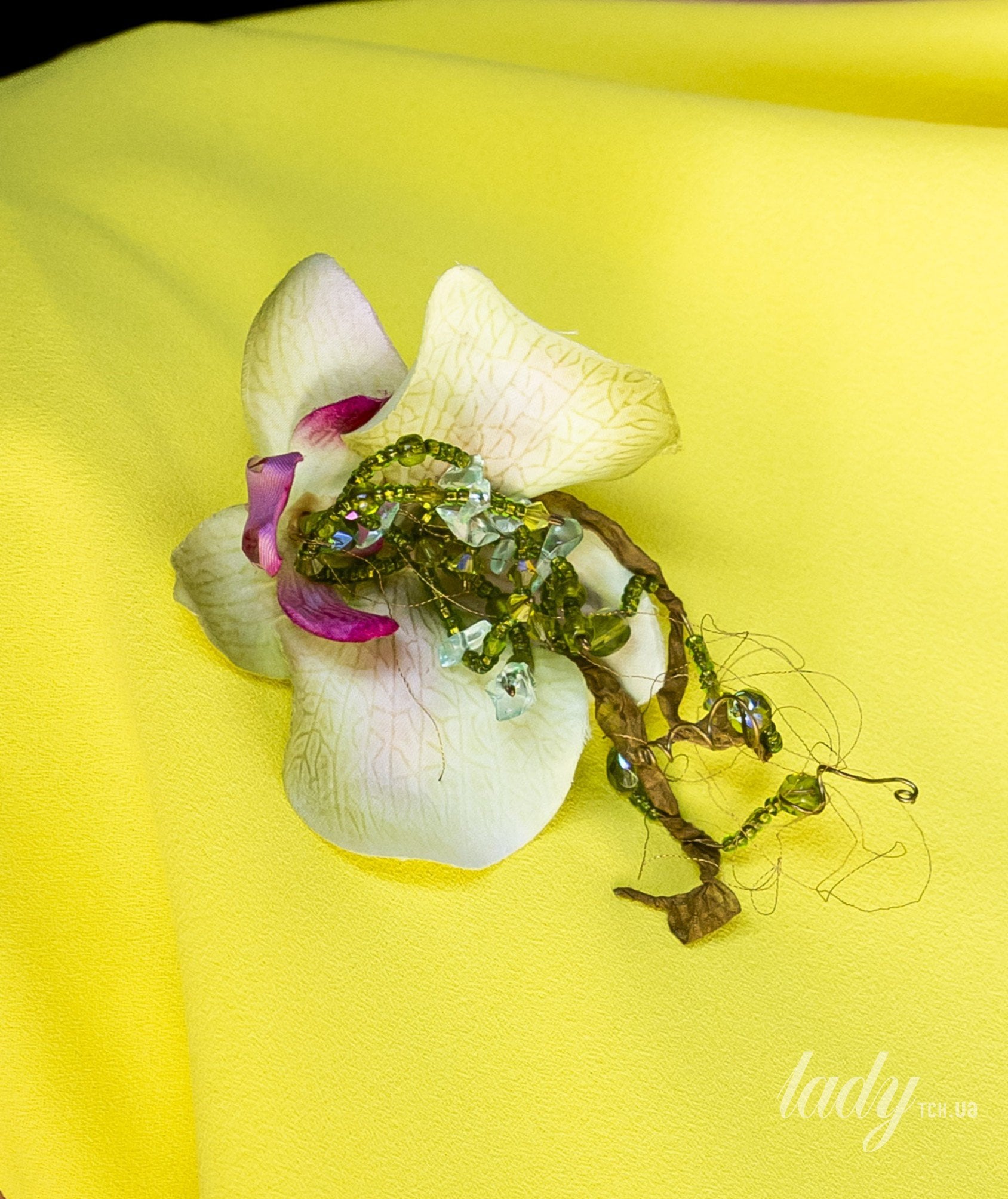 Прикраса дуже реалістична і схожа на справжню тропічну квітку, але насправді зроблена із тканини і прикрашена бісером.