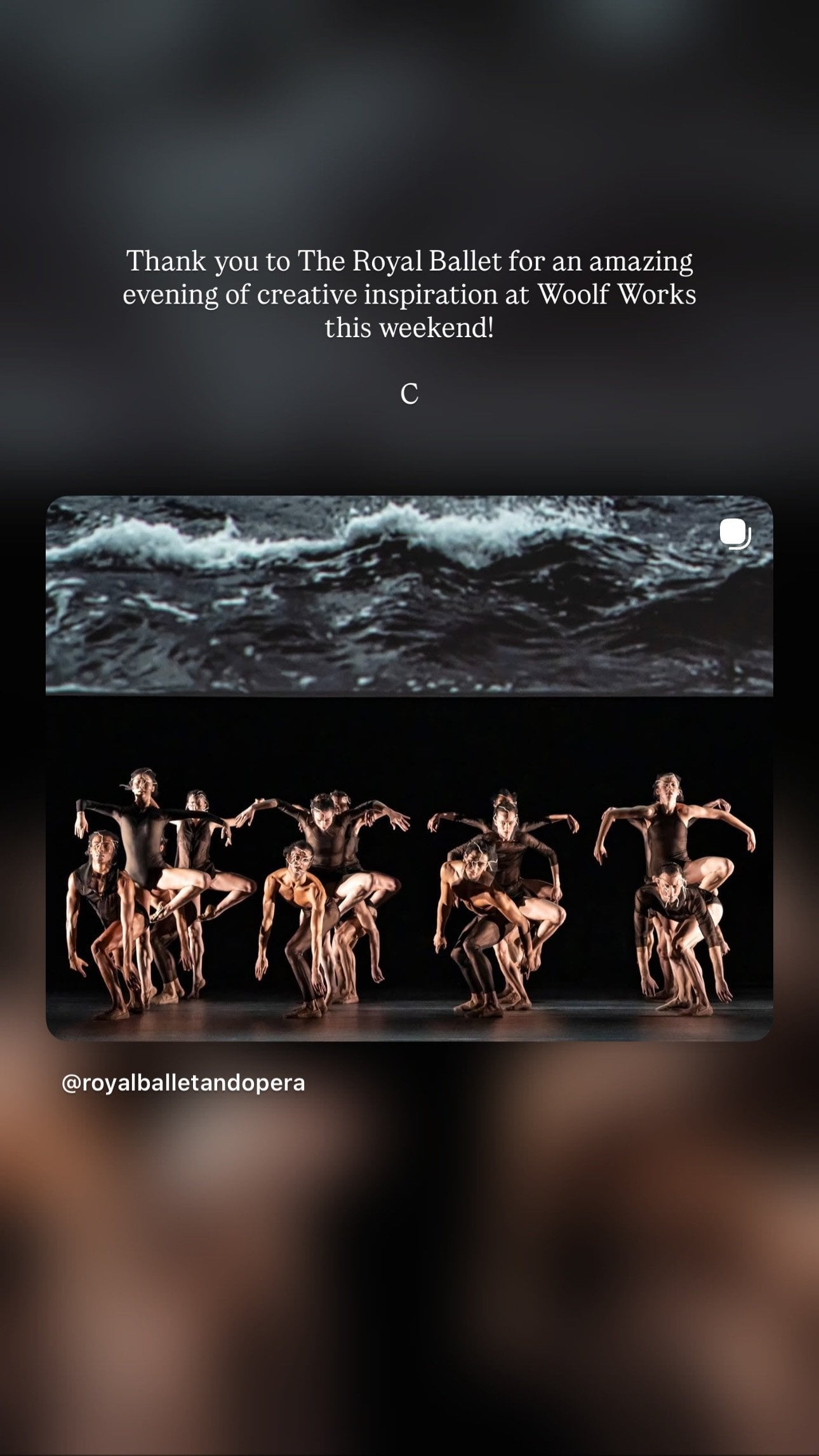 «Дякую Королівському балету за приголомшливий вечір творчої наснаги у Woolf Works у ці вихідні! К.»