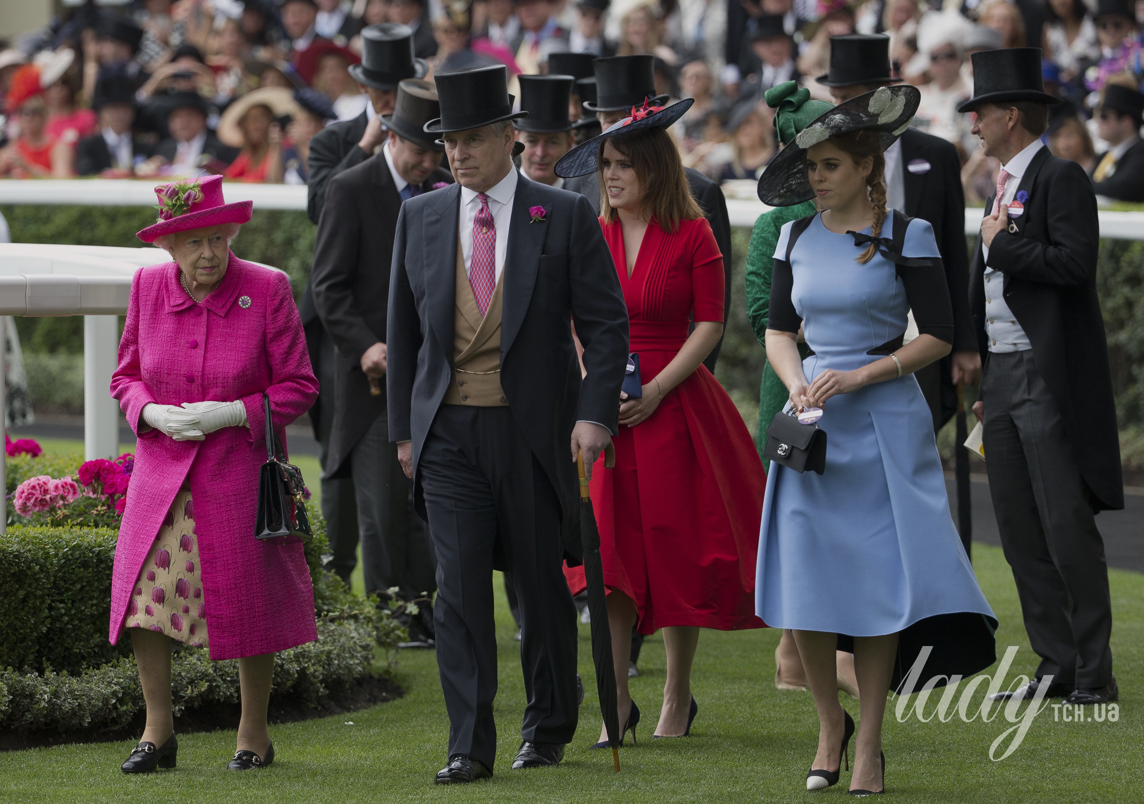 Королева Єлизавета, експринц Ендрю та його доньки Євгенія і Беатріс на кінних перегонах в Аскоті / © Associated Press