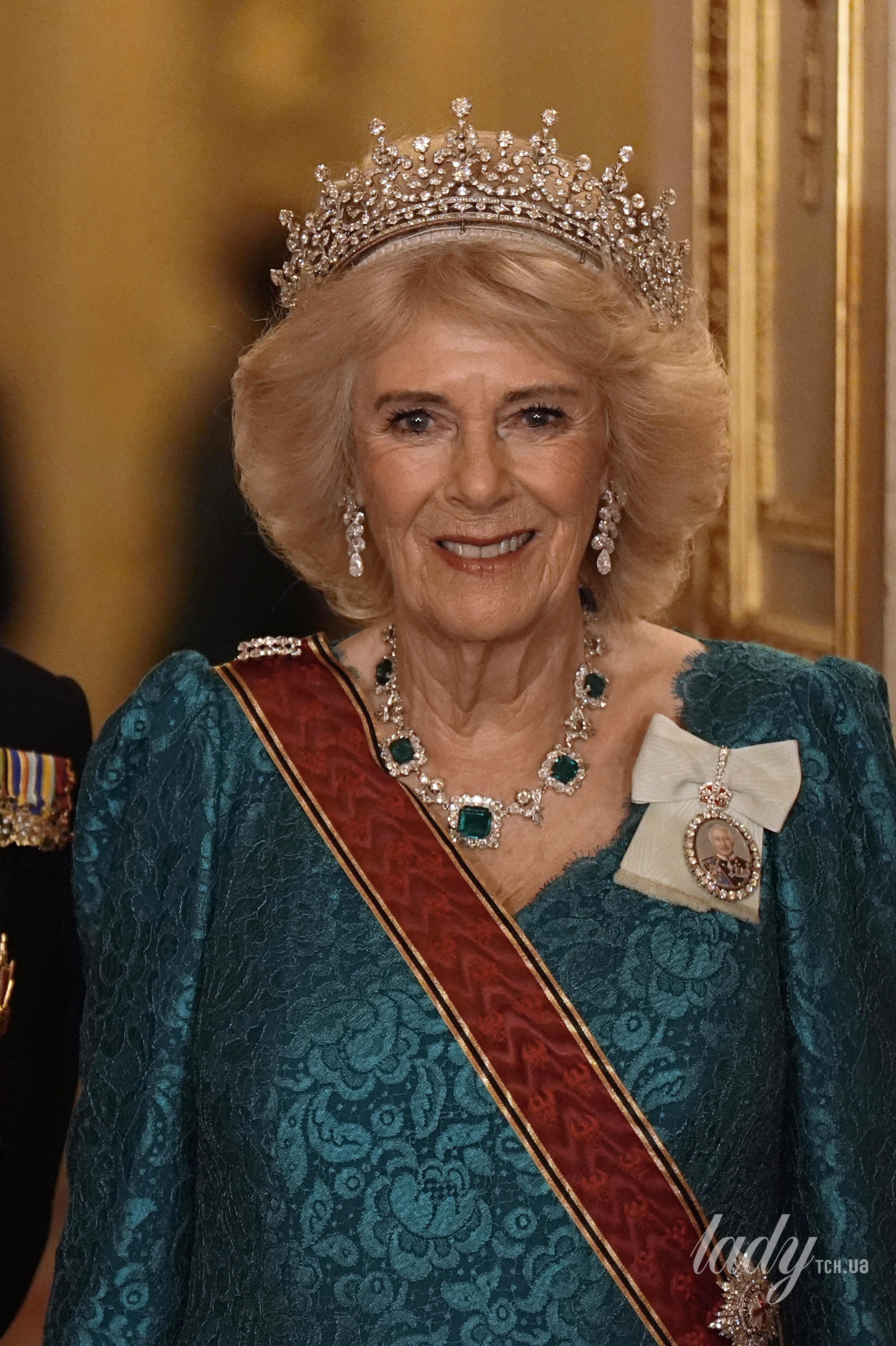 Камілла доповнила вечірній образ орденами, тіарою «Дівчат Великої Британії та Ірландії» королеви Марії, приголомшливим кольє зі смарагдами та діамантами, що належало колись Маргарет Гревілл — світській левиці, яка заповіла свої прикраси королеві-матері, а також діамантовими браслетами та сережками.