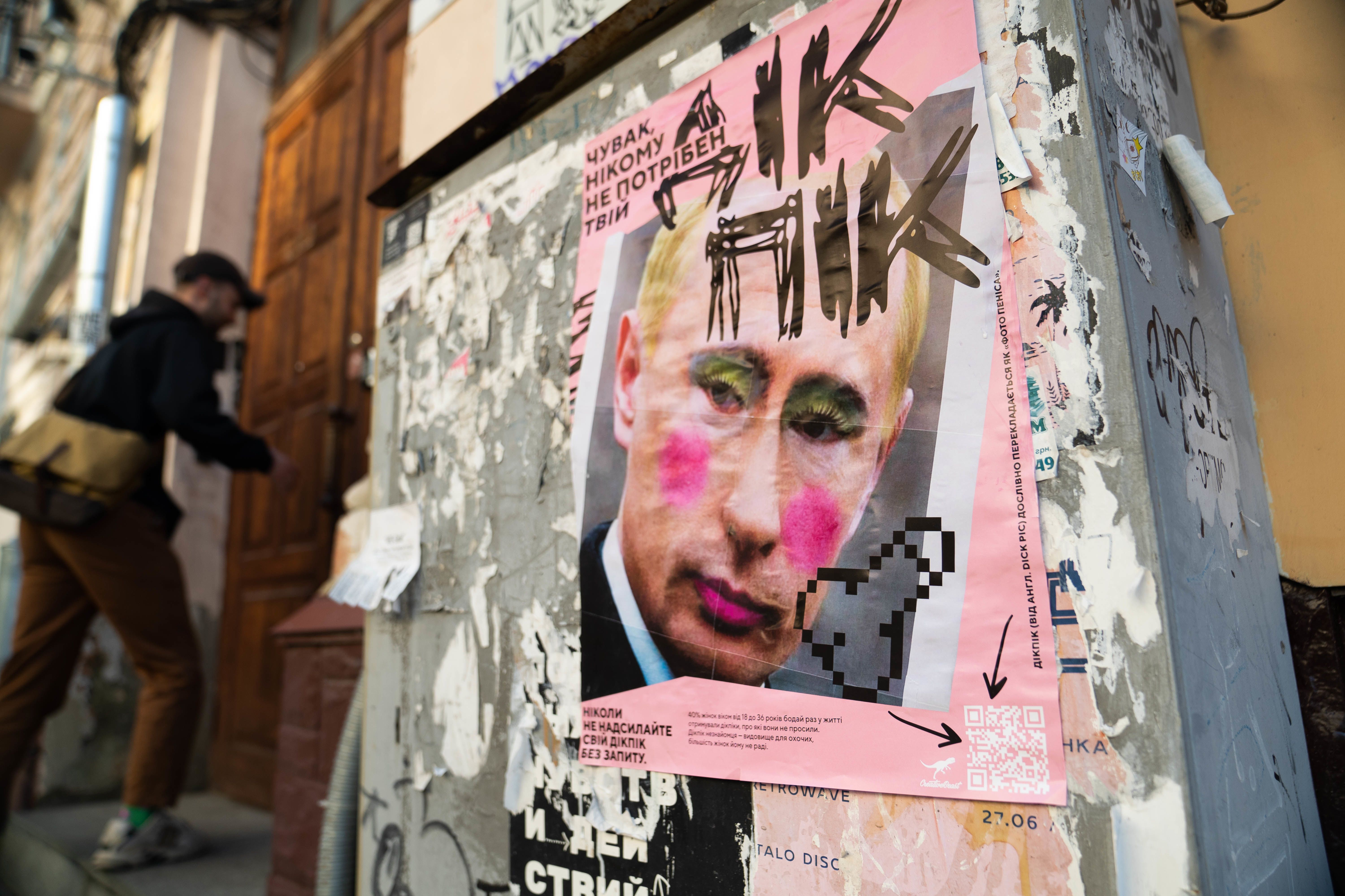 На вулицях Києва з’явилися жартівливі плакати із зображенням очільника країни-агресора, яка розпочала повномасштабну війну в Україні. На одному з постерів головного диктатора ХХІ століття зображено з макіяжем. Як повідомляли раніше ЗМІ, це фото є забороненим у РФ, проте наразі воно заповнює вулиці української столиці, а користувачі соцмереж активно поширюють його на своїх сторінках.