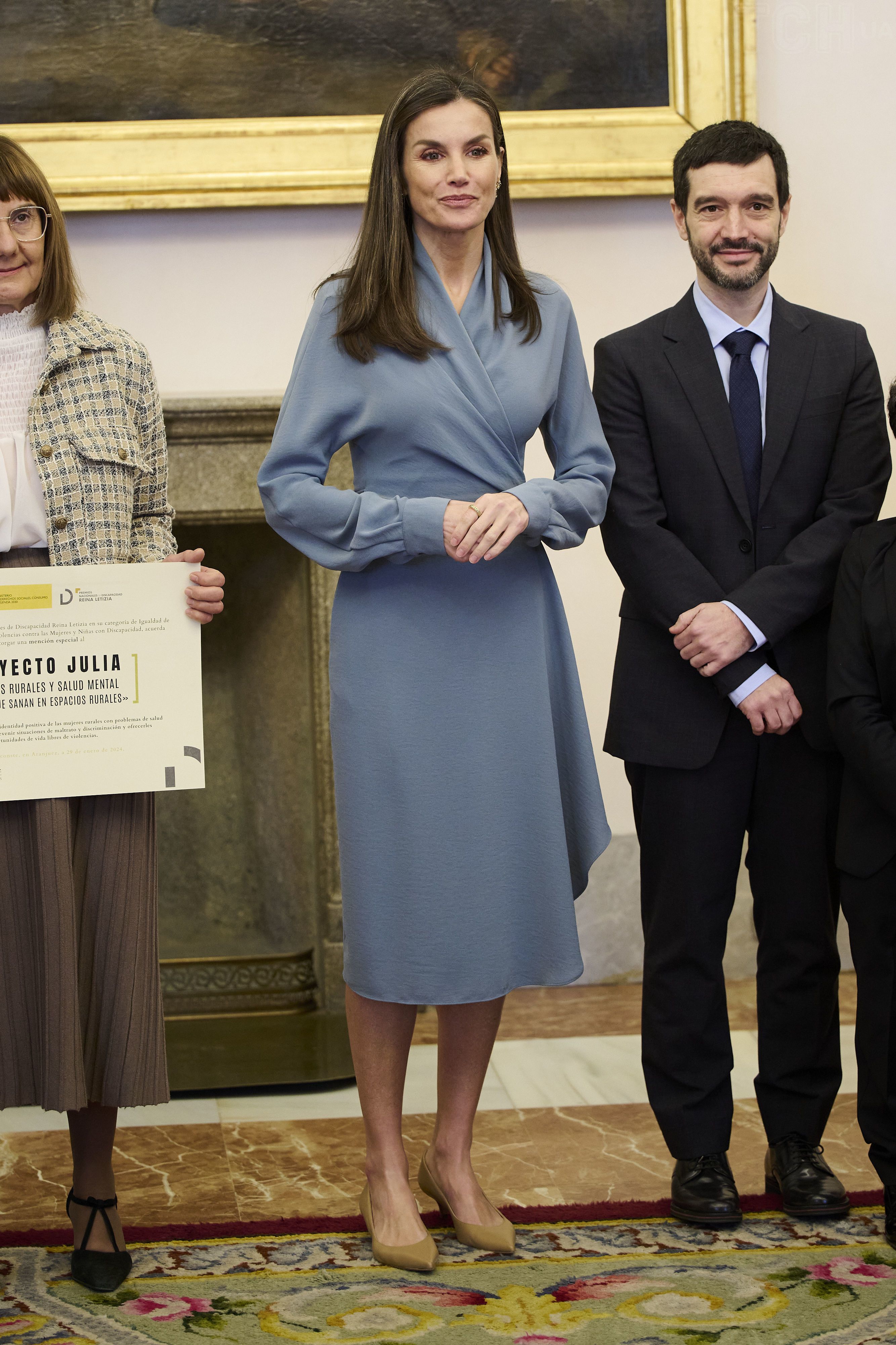 На королеві цього разу було бежеве пальто Carolina Herrera, під ним блакитна сукня на запах і зі шнурівкою з боків Adolfo Domínguez, в руках вона тримала маленьку коричневу сумку Carolina Herrera.