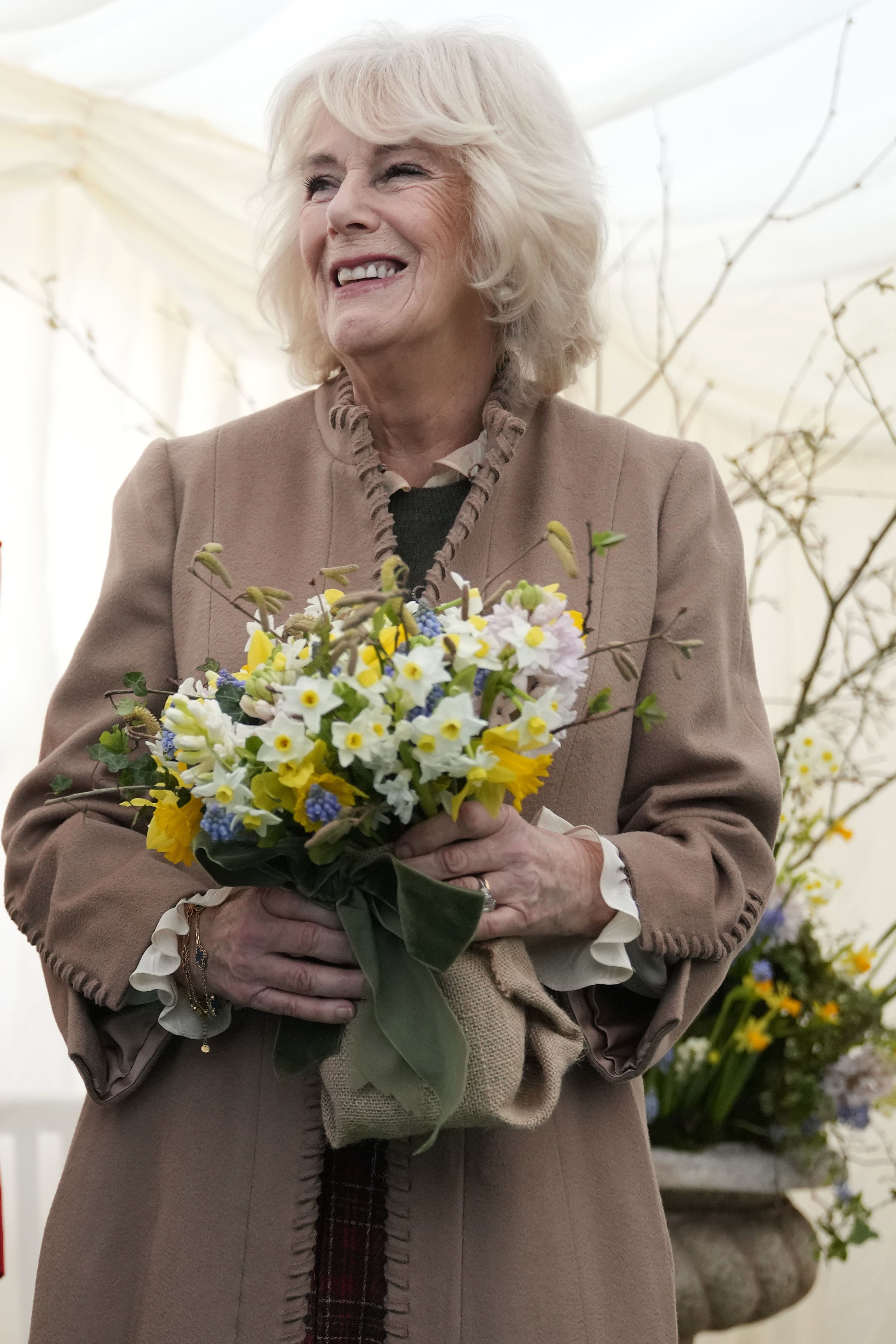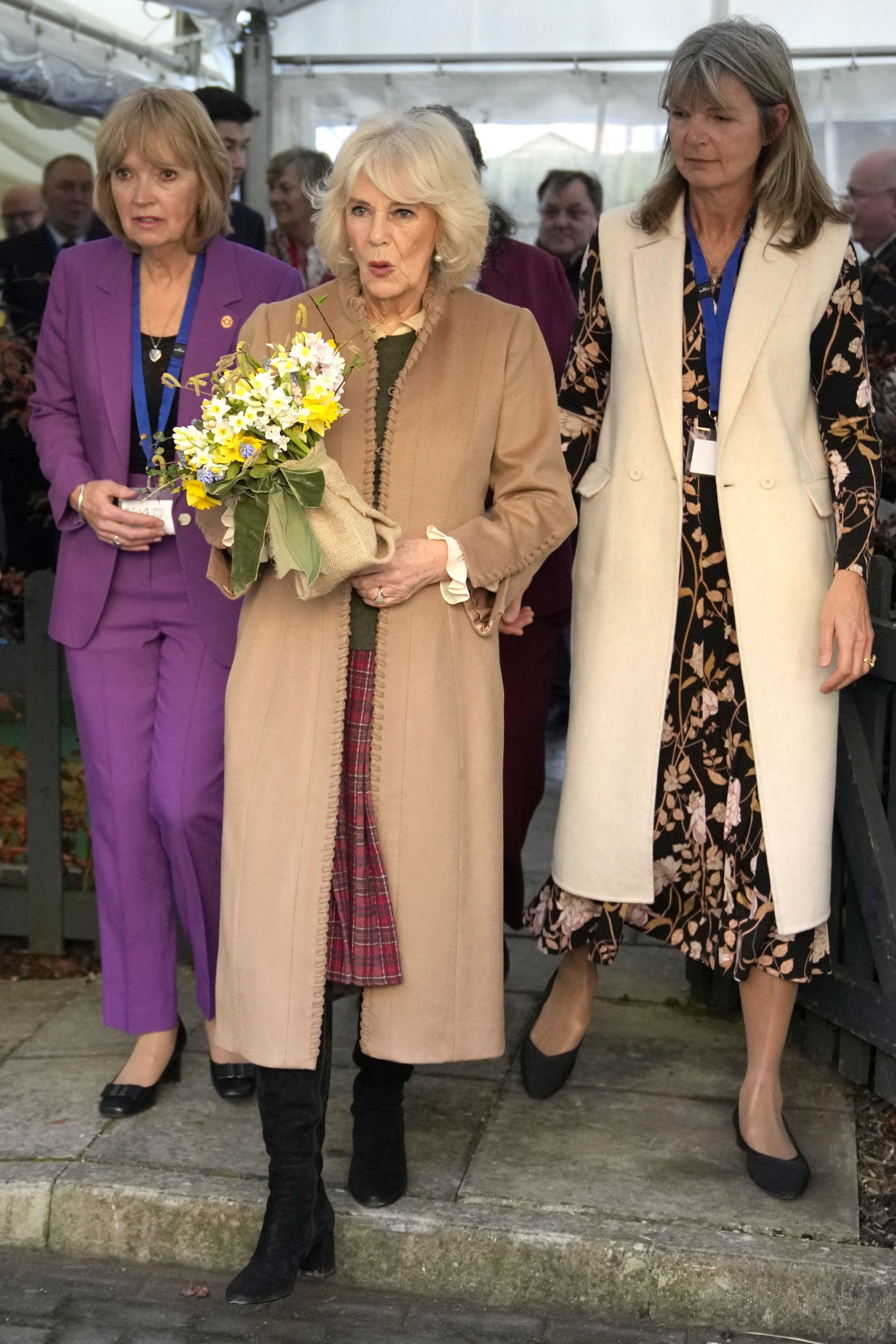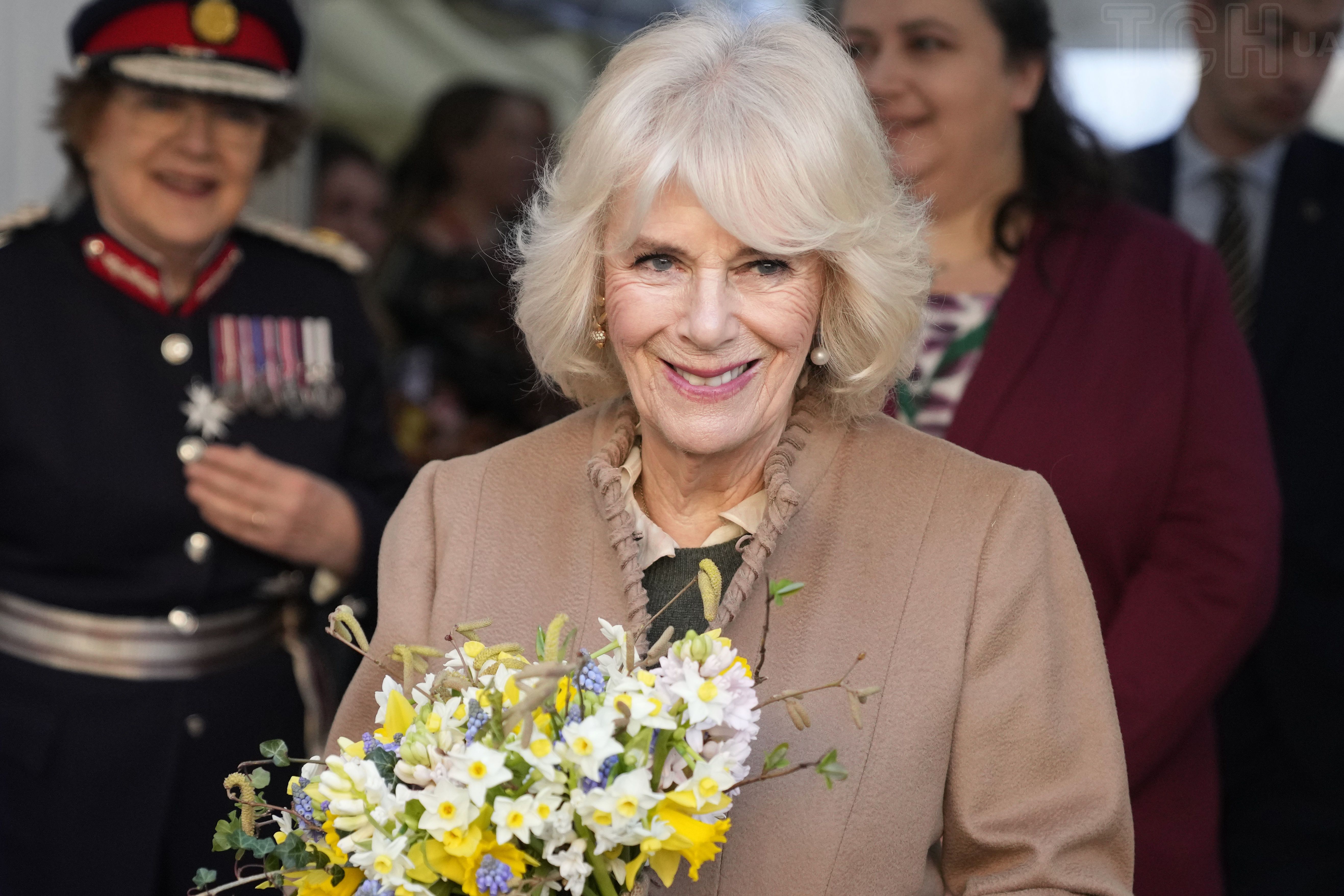 У бежевому пальті та з нарцисами в руках: королева Камілла відвідала притулок для жінок