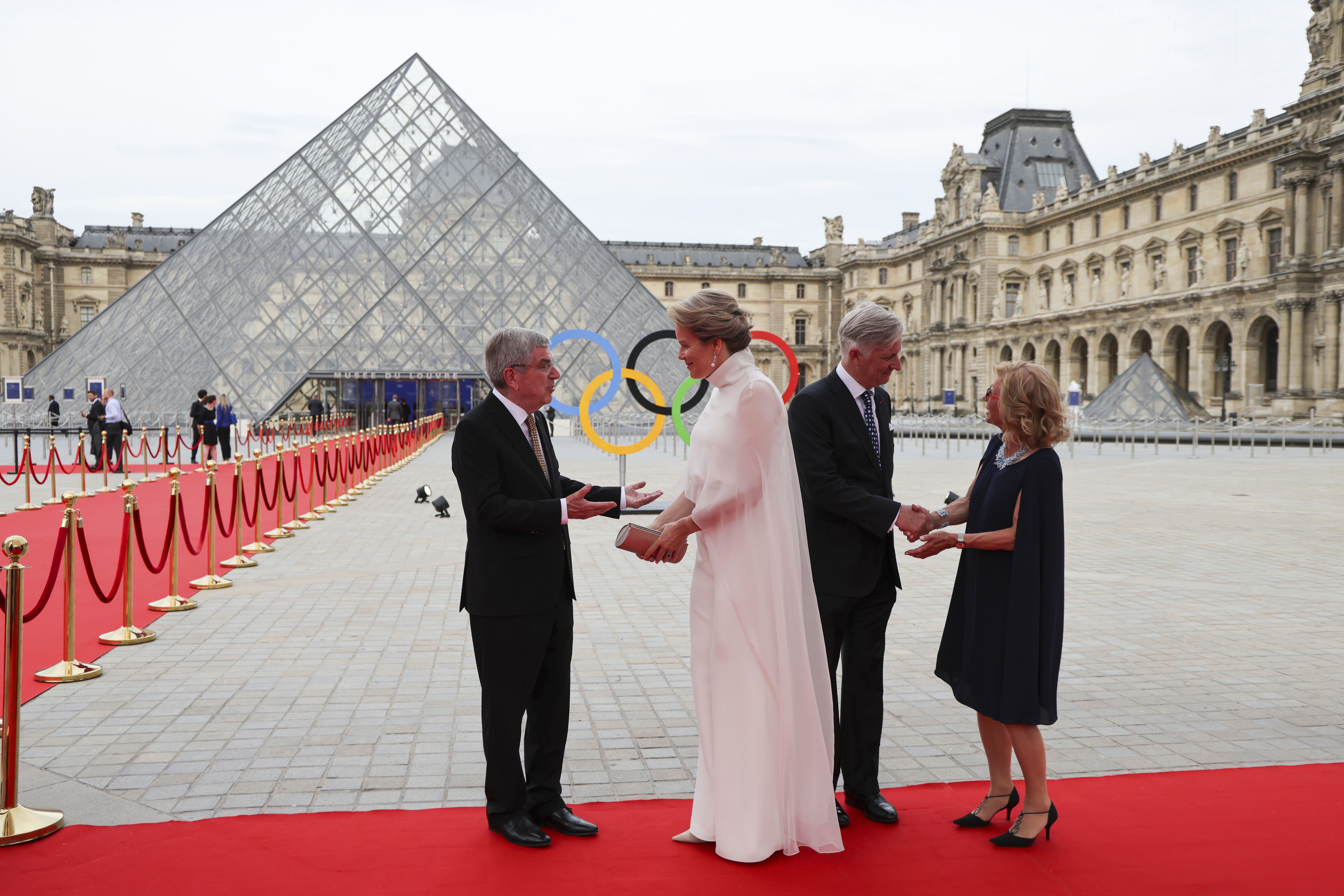 Напередодні король Філіп та королева Матильда відвідали вечерю Міжнародного олімпійського комітету у Луврі. Її Величності королева з'явилася на ньому у білому костюмі з накидкою від Natan Couture, який доповнила гостроносими туфлями на підборах та мініатюрним клатчем.
