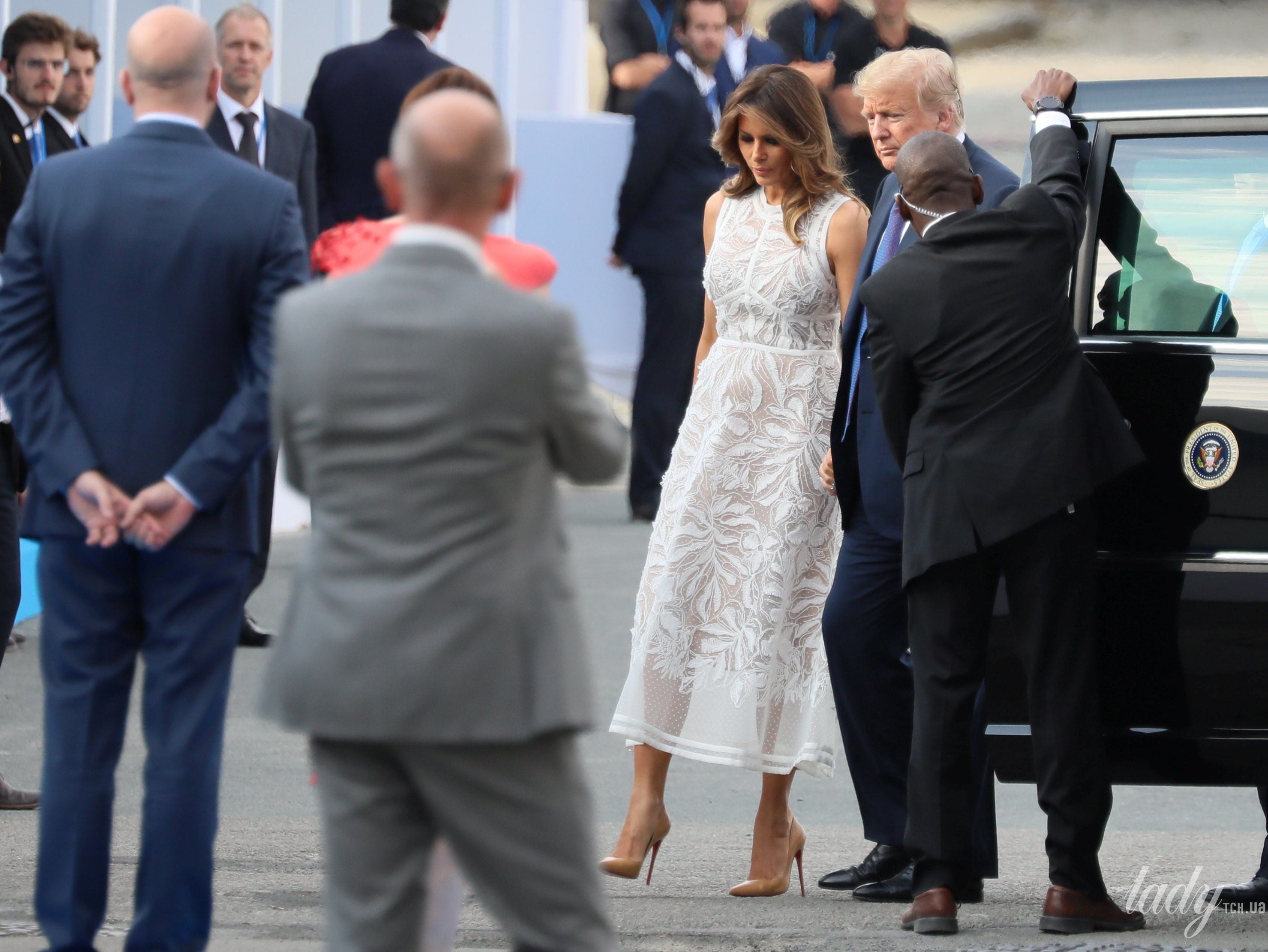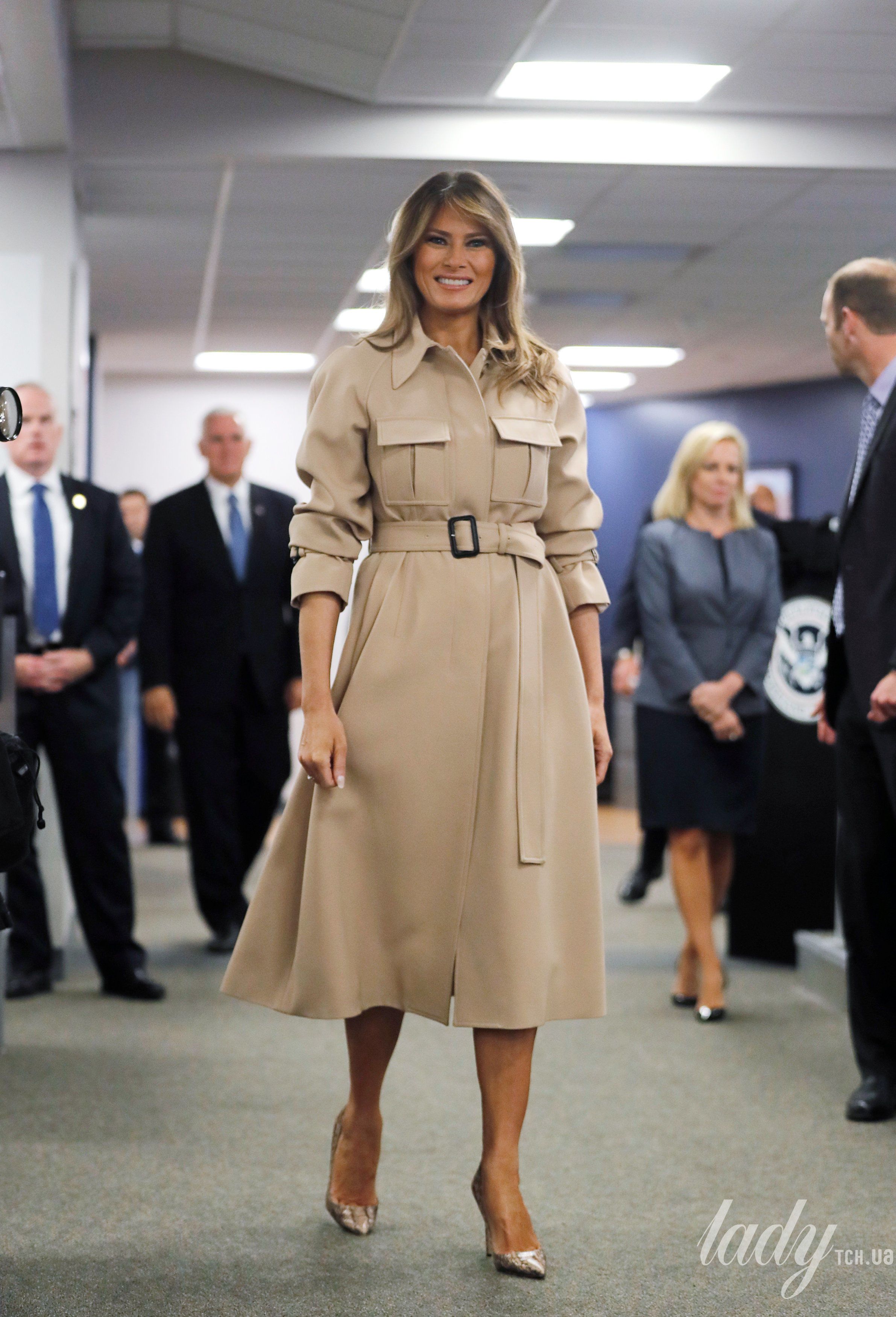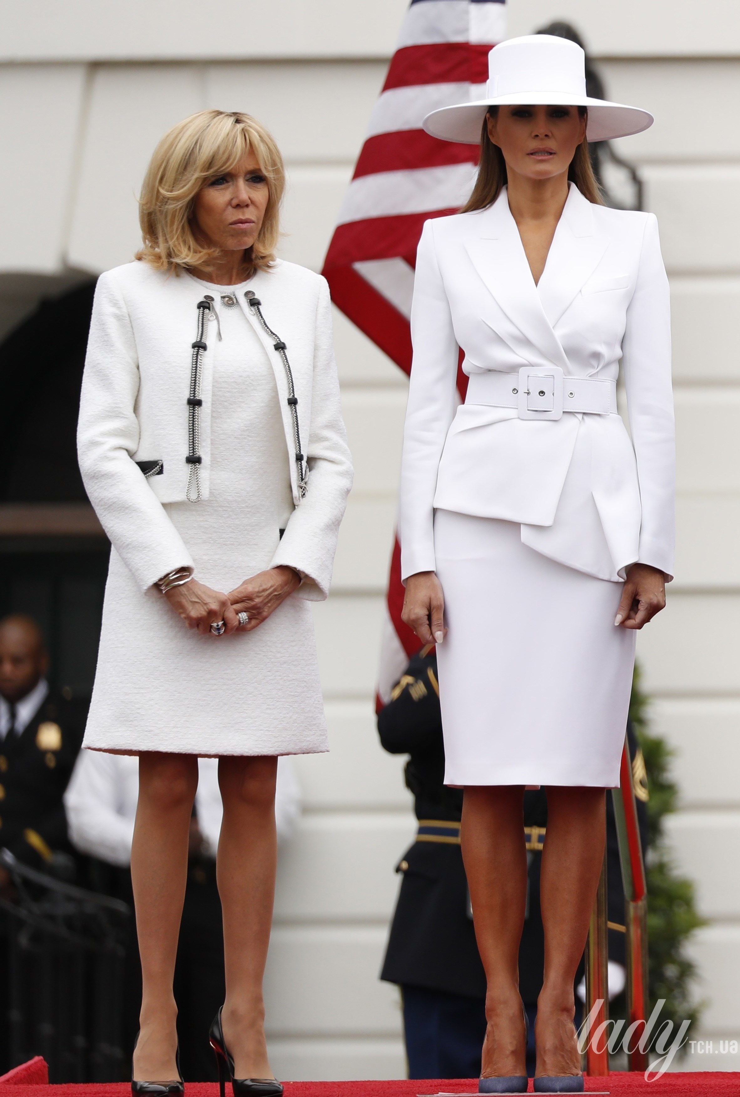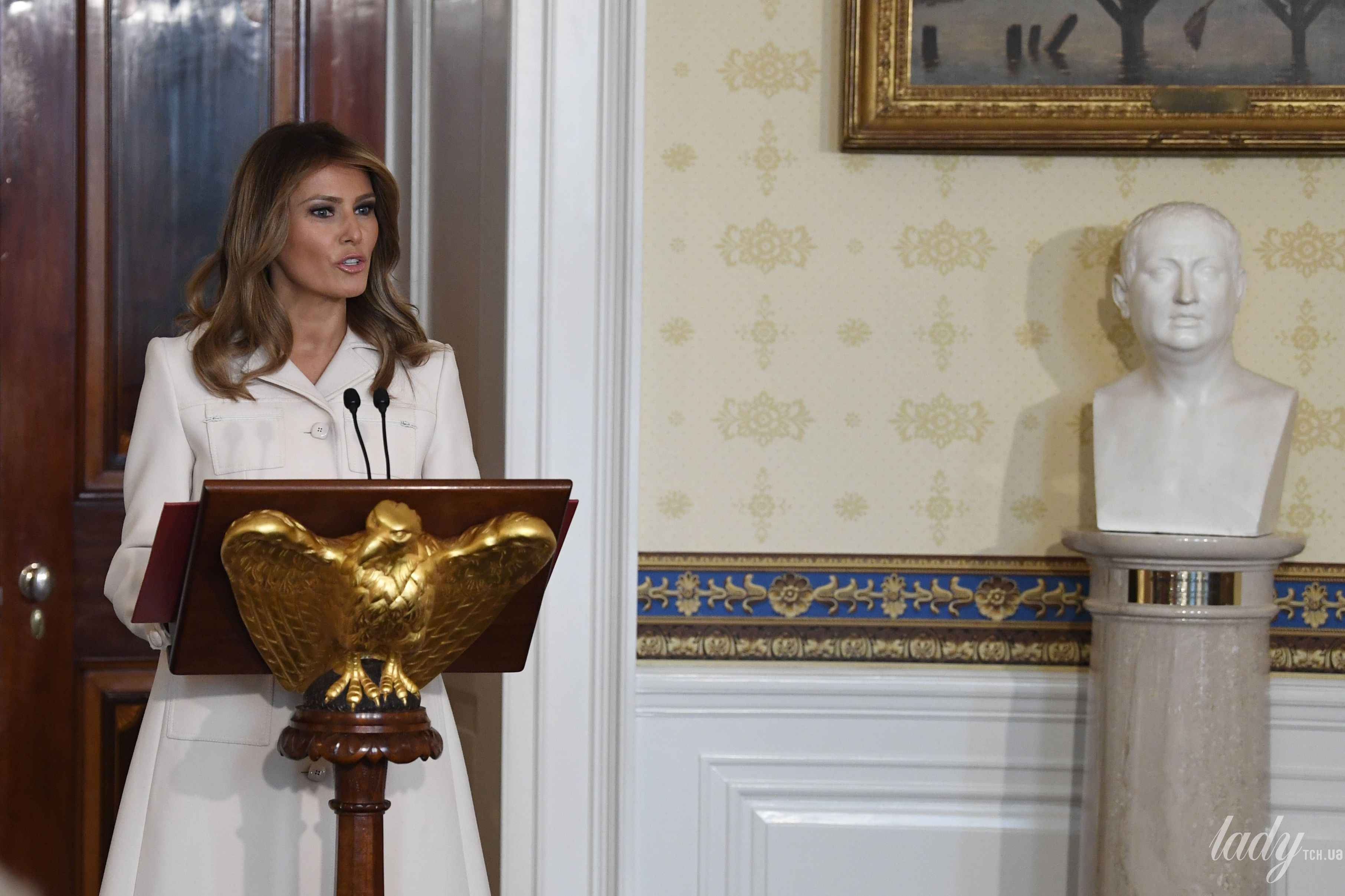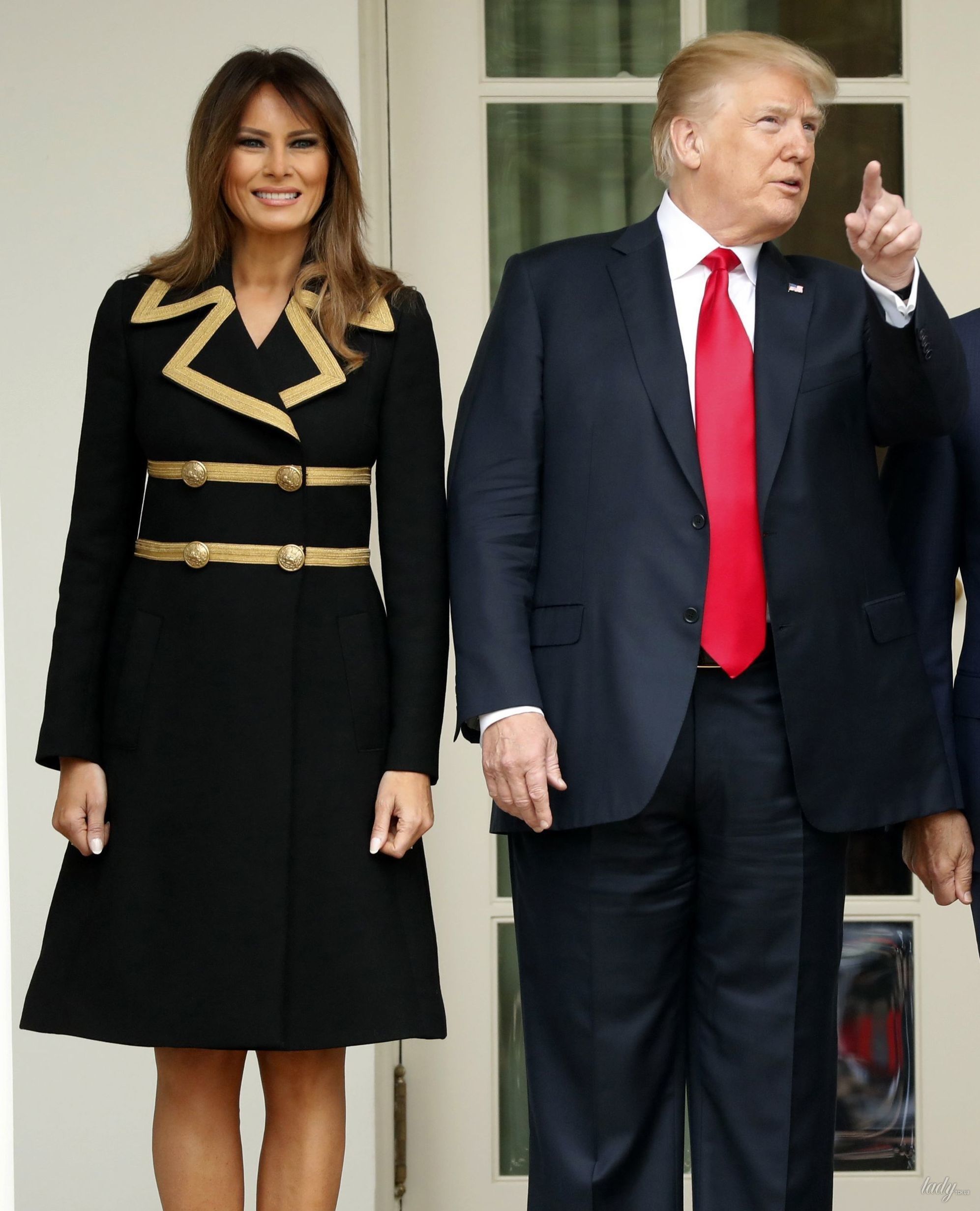 Перша леді була одягнена у біле пальто з накладними кишенями на блискавці і білі туфлі на шпильках. Талію вона підкреслила білим поясом Gucci.