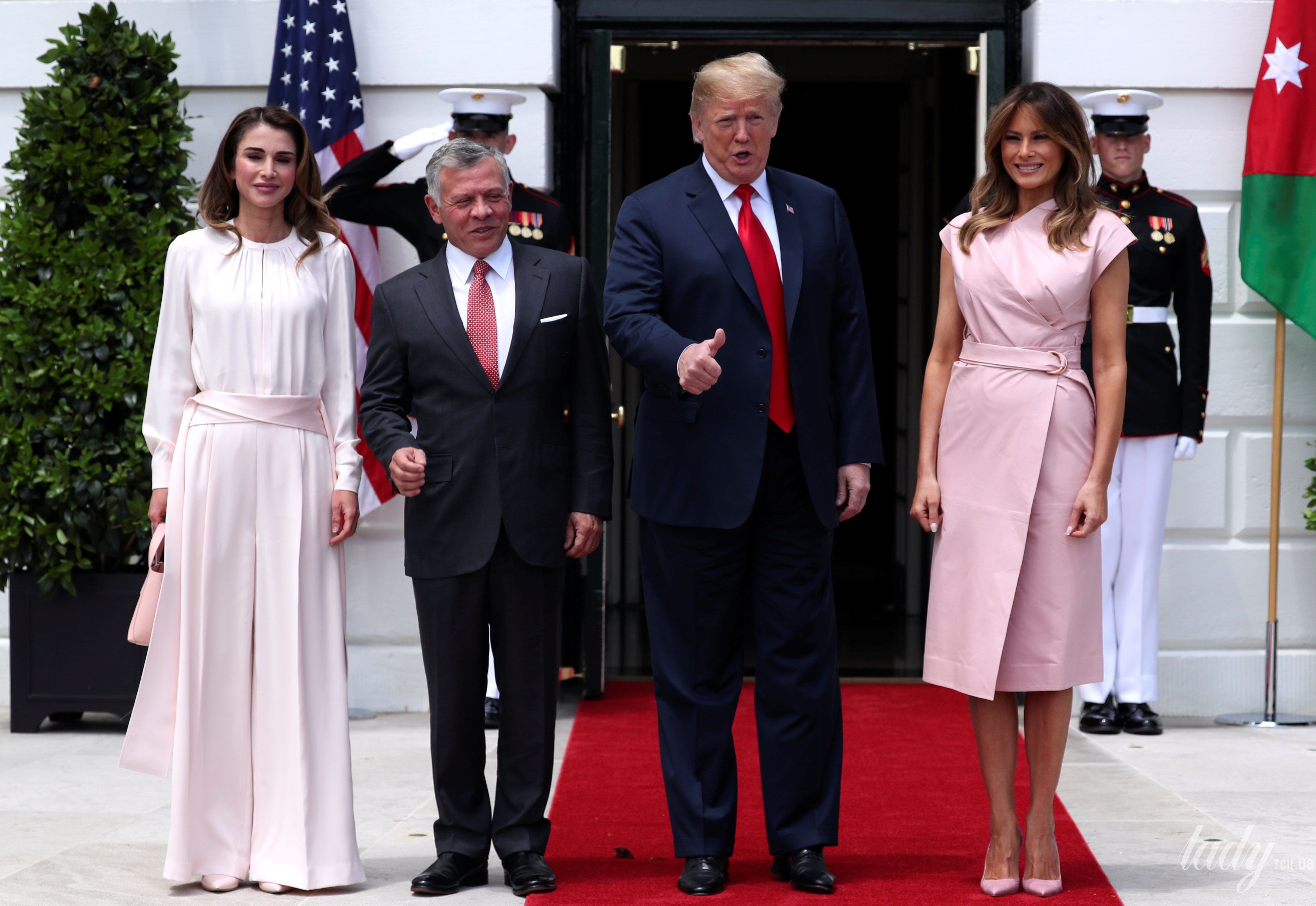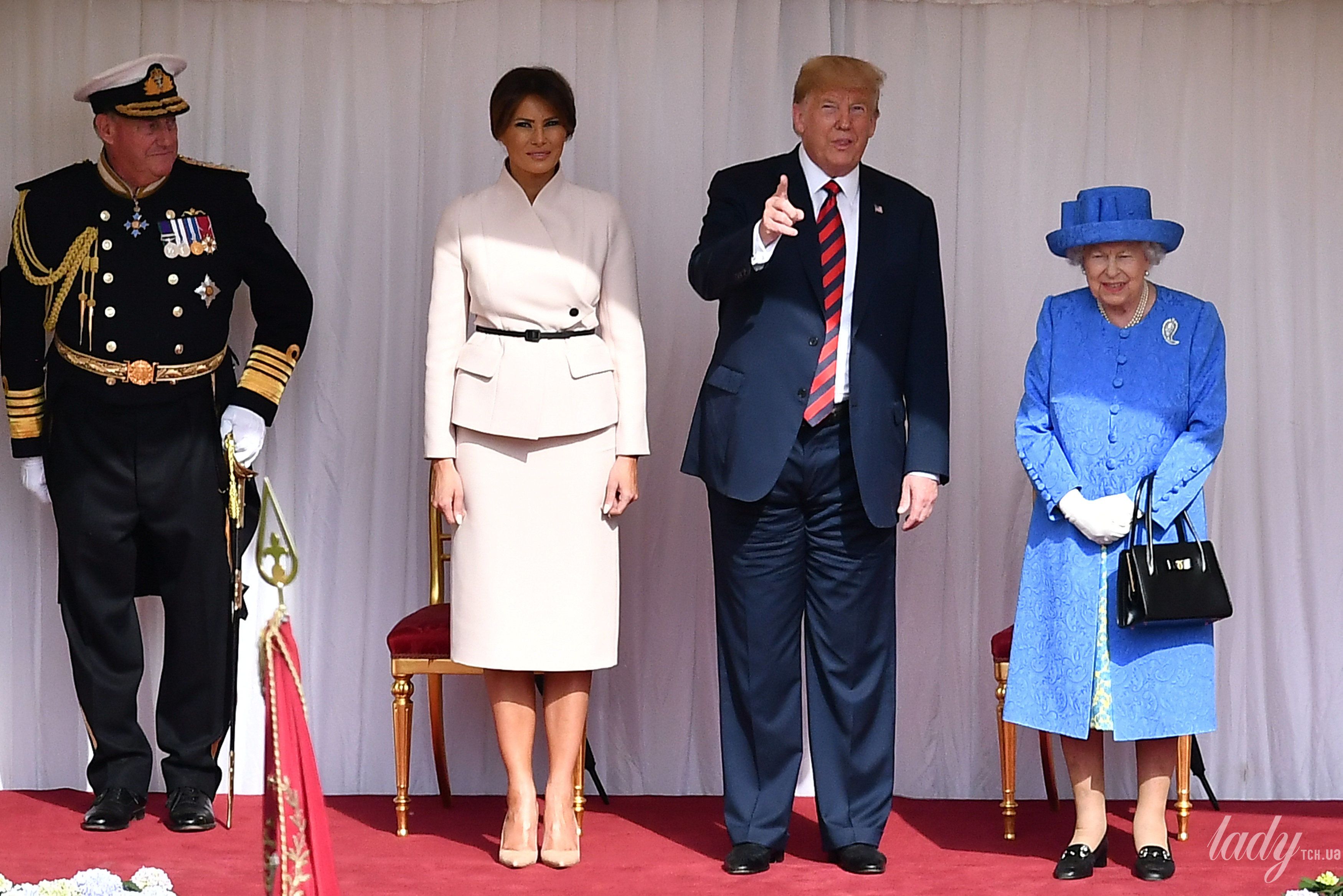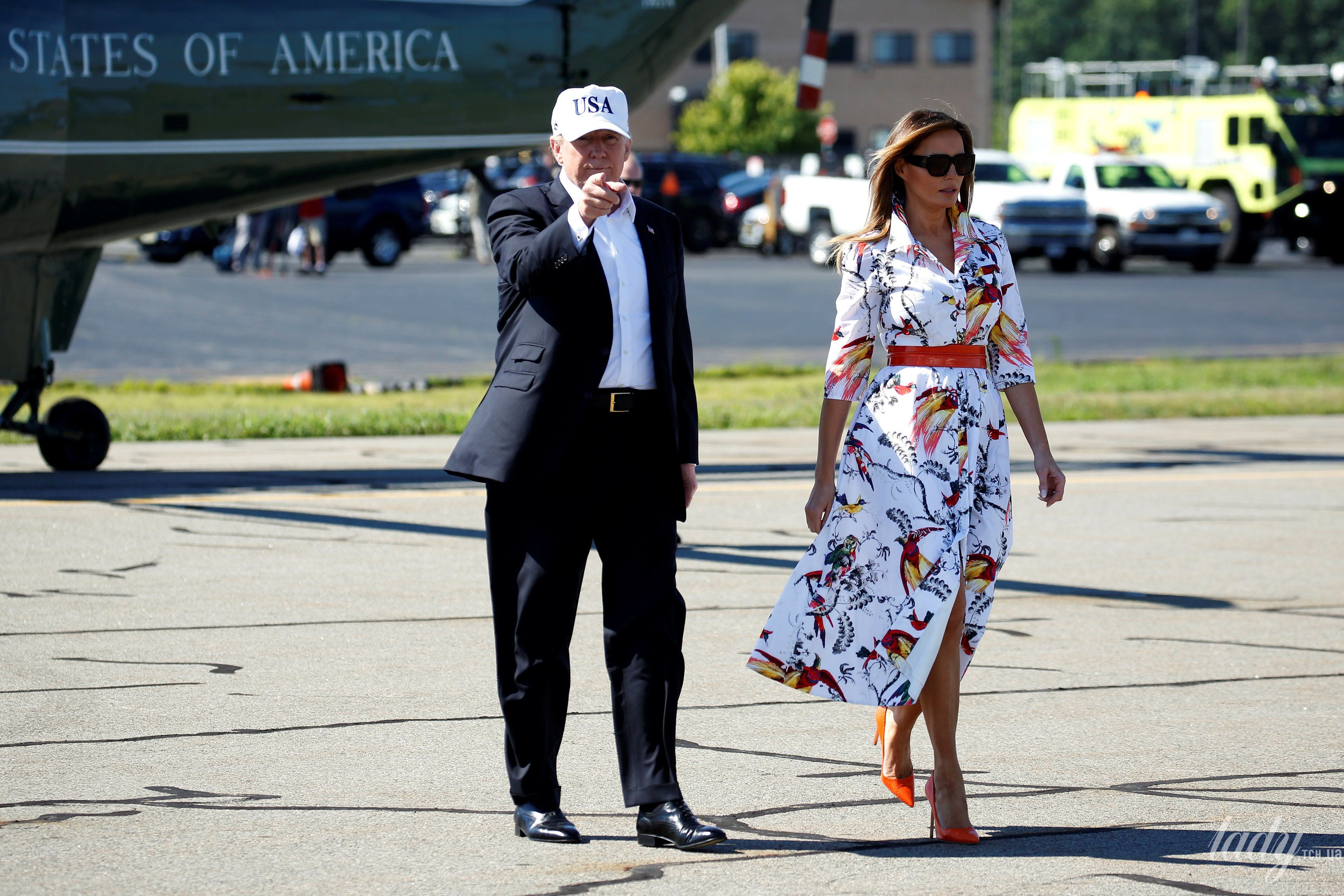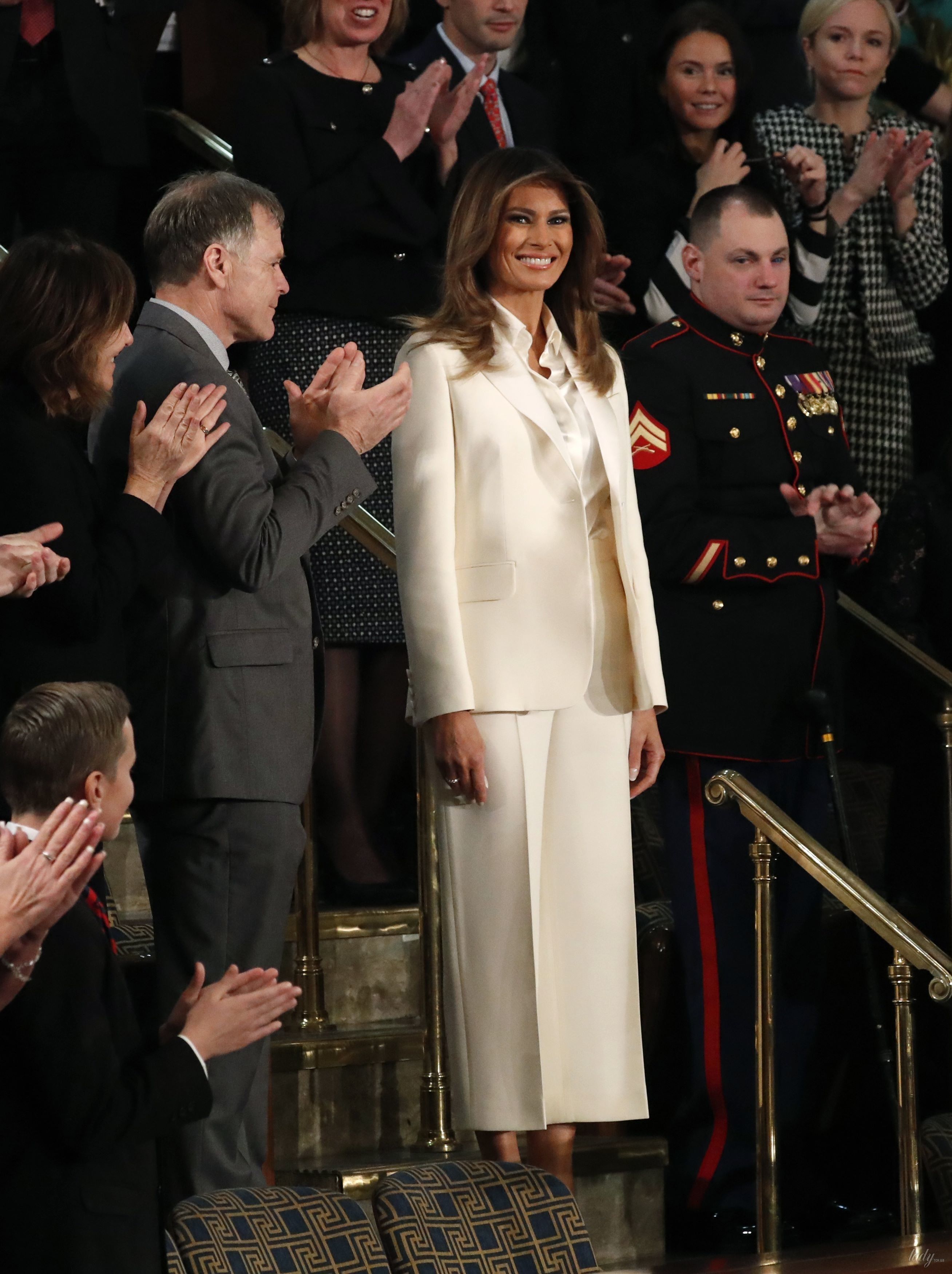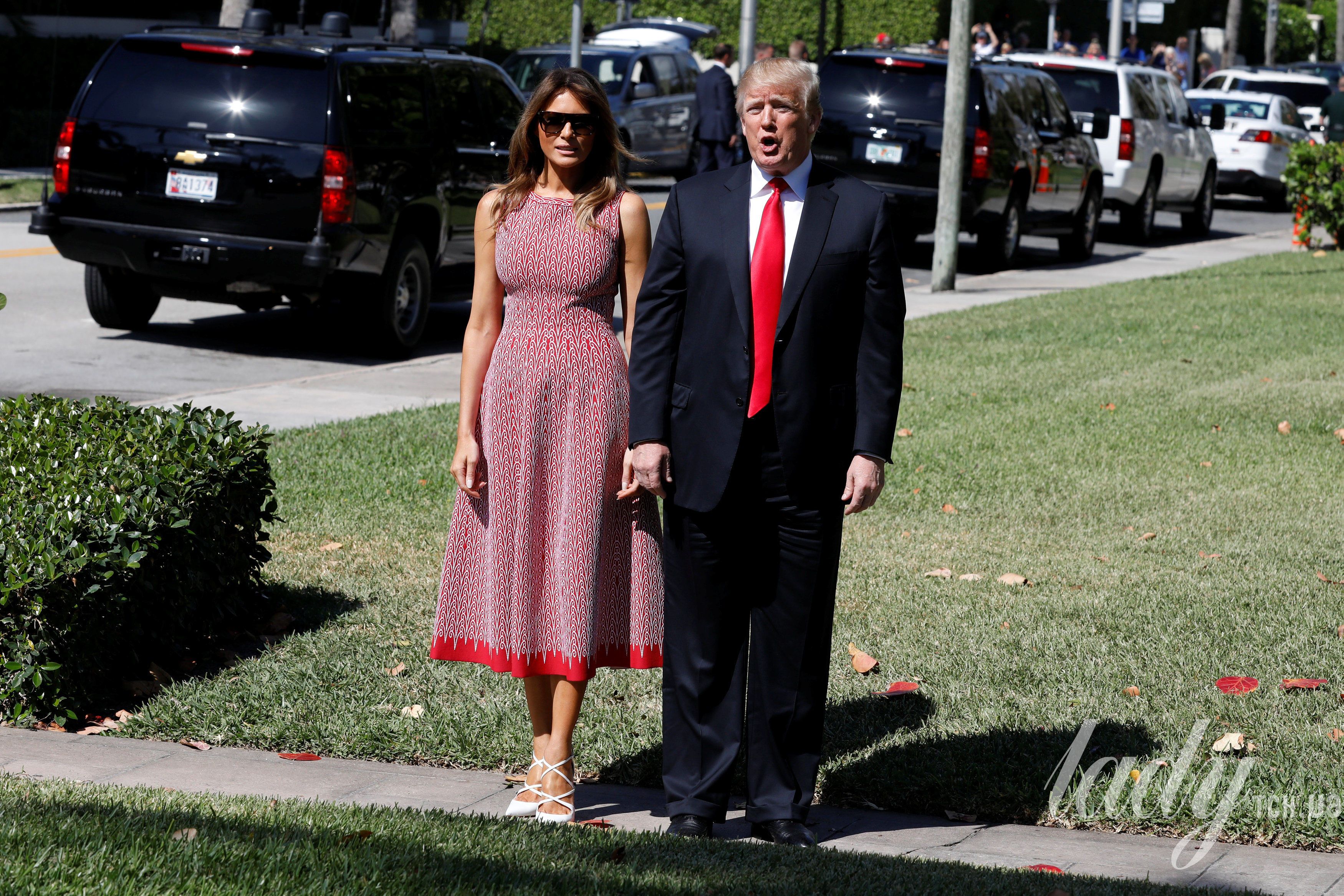 Перша леді була одягнена у біле пальто з накладними кишенями на блискавці і білі туфлі на шпильках. Талію вона підкреслила білим поясом Gucci.