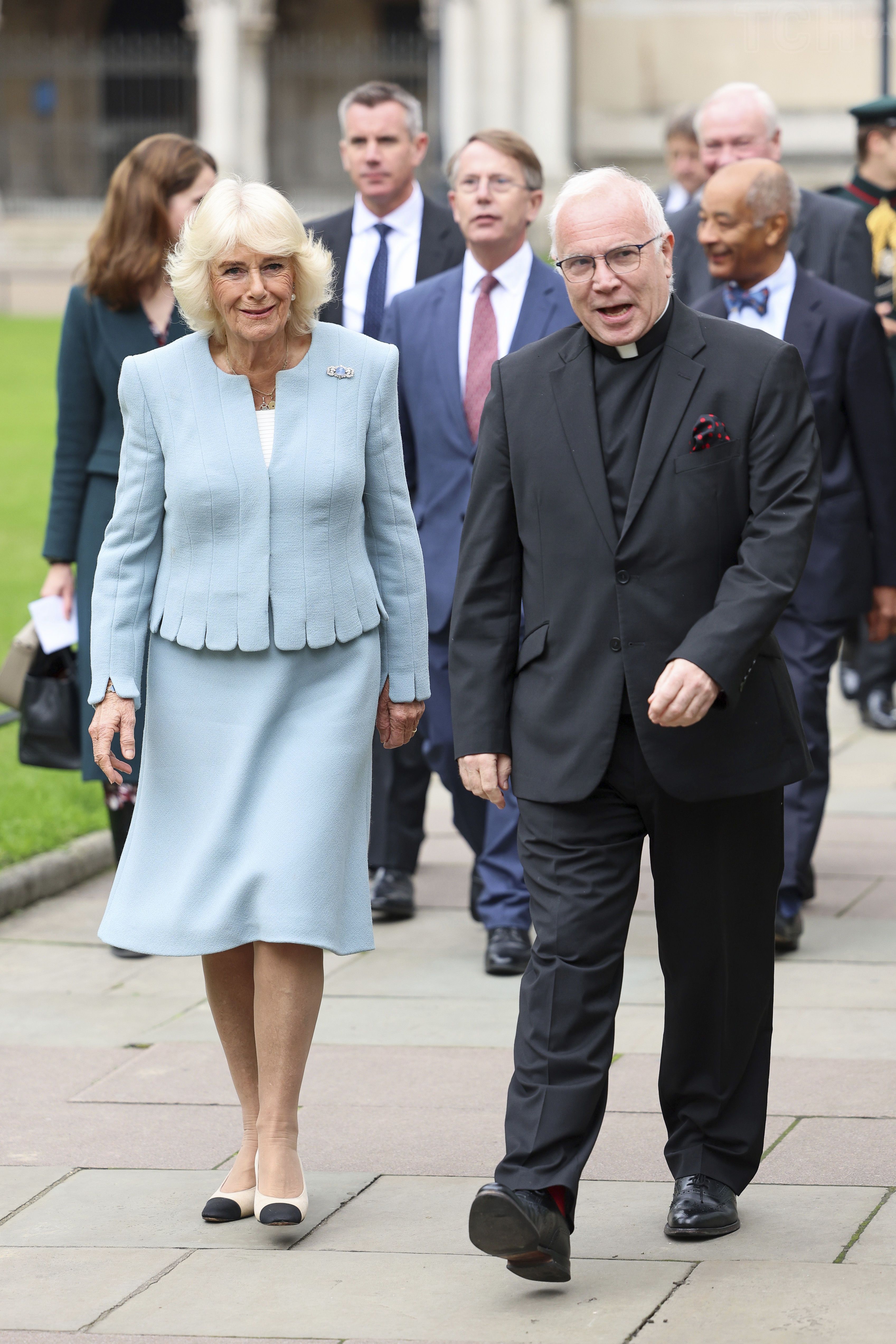 Камілла одягла короткий блакитний жакет у поєднанні з білим топом та спідницю довжини до колін у поєднанні з туфлями з круглими чорними носами від Chanel на підборах. На жакеті у королеви була пришпилена брошка з діамантами, на шиї її улюблені підвіски Kiki McDonough та золота пластинчаста підвіска з ініціалами її онуків: Лола, Фредді, Еліза, Луї та Гас, а у вухах перлинні сережки-висячки.
