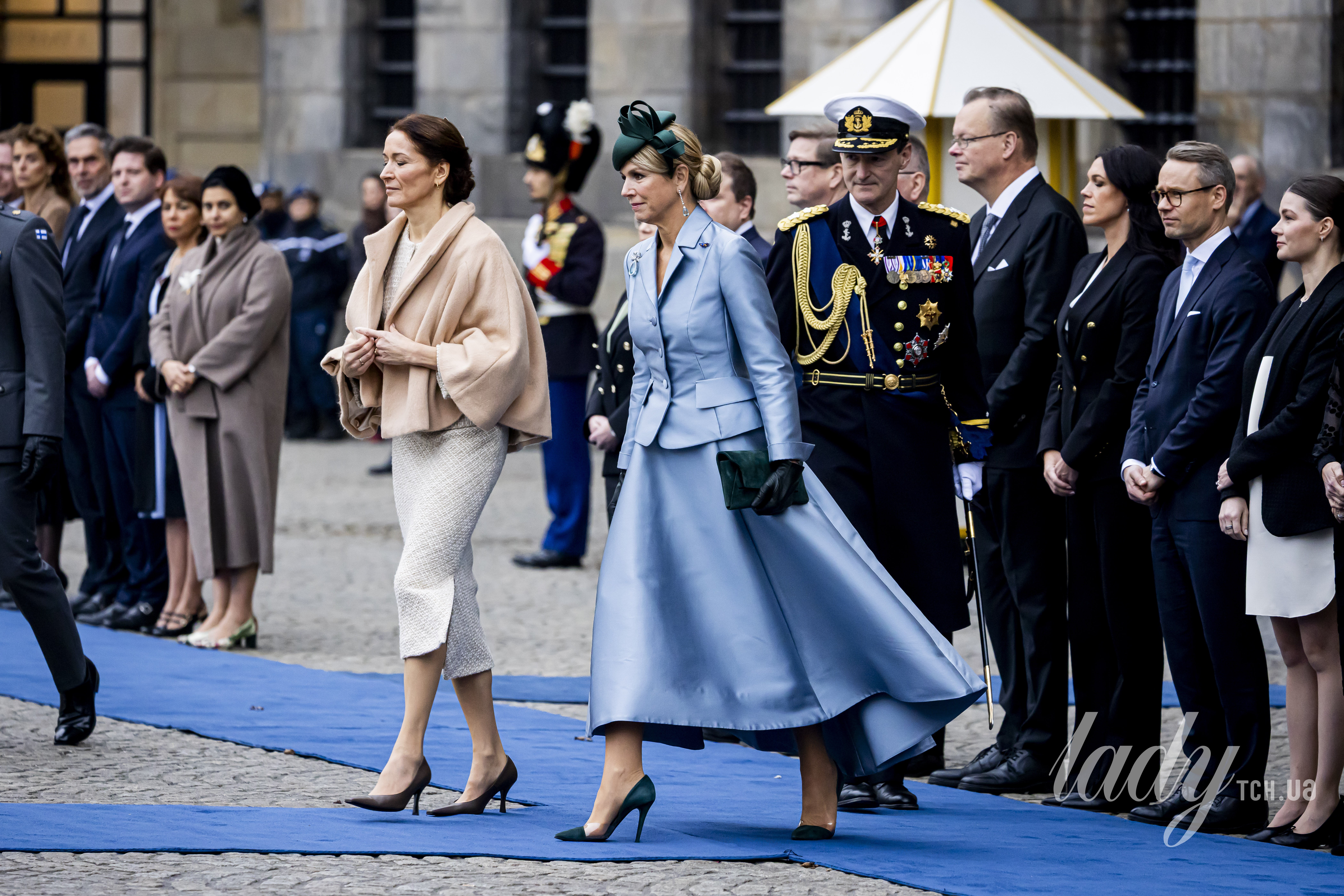 Церемонія привітання почесних гостей традиційно відбулася на площі Дам. Королева Максима мала, як завжди, приголомшливий вигляд і з’явилася на зустрічі в блакитному спідничному костюмі та смарагдовому капелюсі-таблетці від Philip Treacy — бренд, який так люблять члени британської королівської родини і особливо принцеса Уельська Кейт.